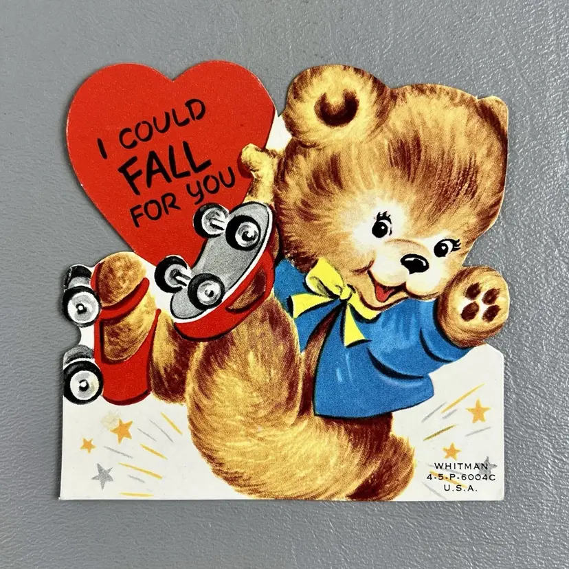 Vintage Die Cut Valentine Card Teddy Bear Roller Skating I Could Fall For You 3.5" Whitman USA