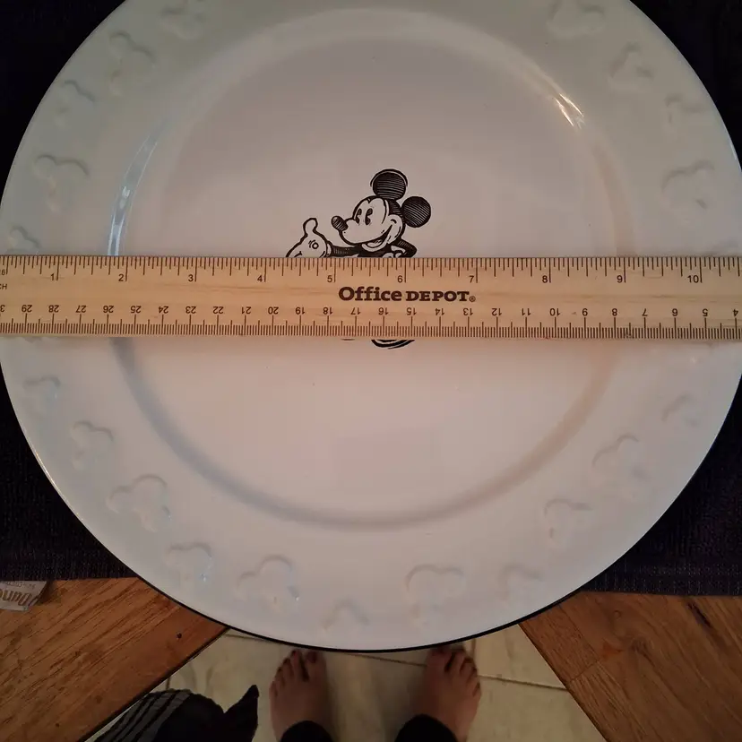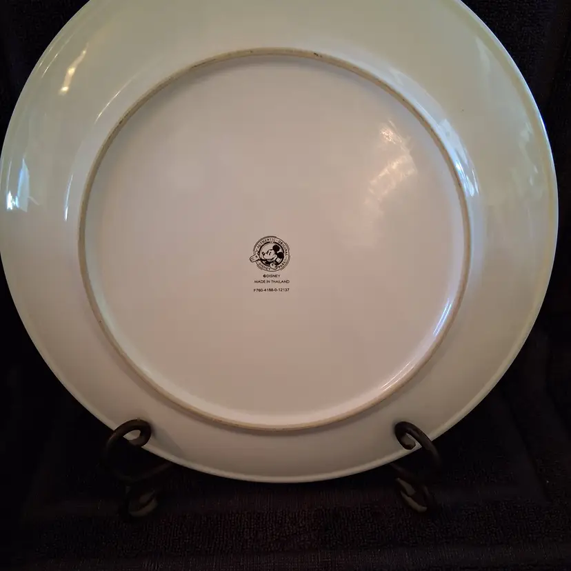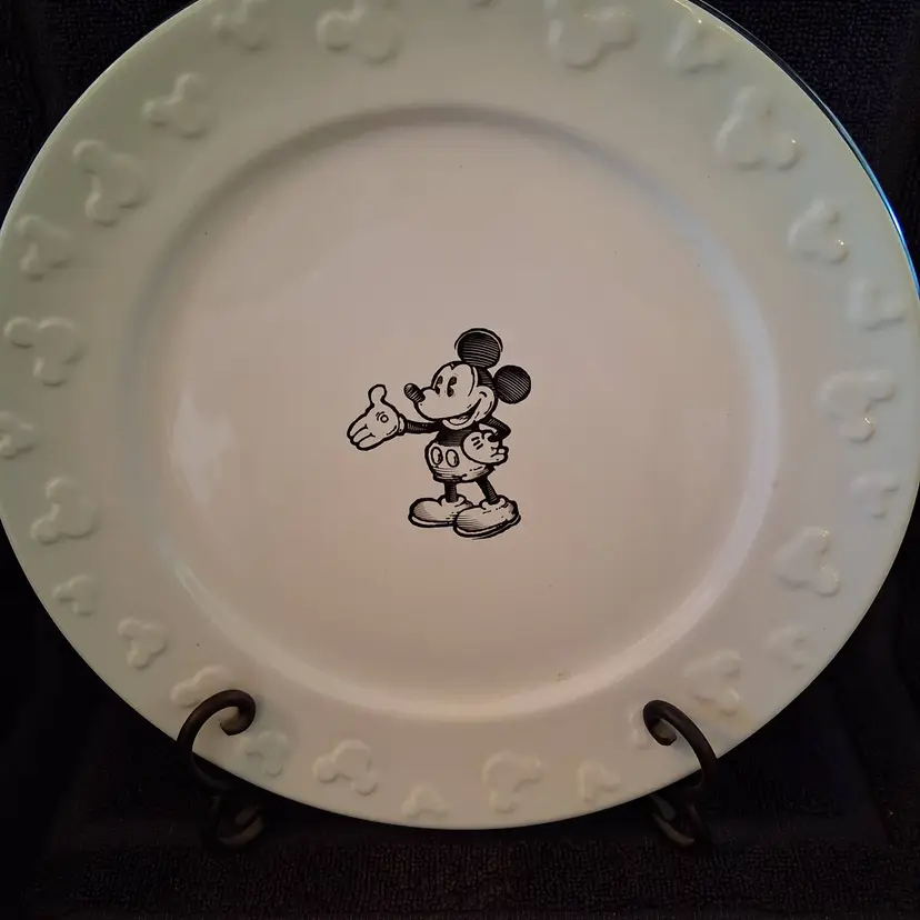 This plate features a black and white drawing of Mickey Mouse that was originally known as Steamboat Willie and he's surrounded by "Mickey heads" all around the rim of the plate.