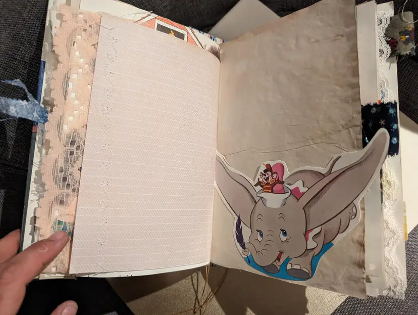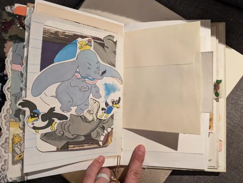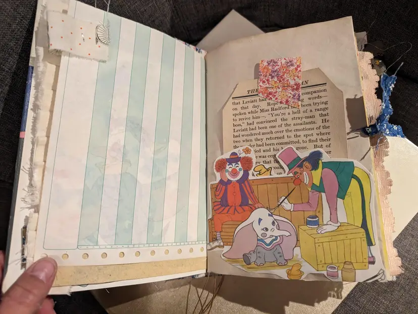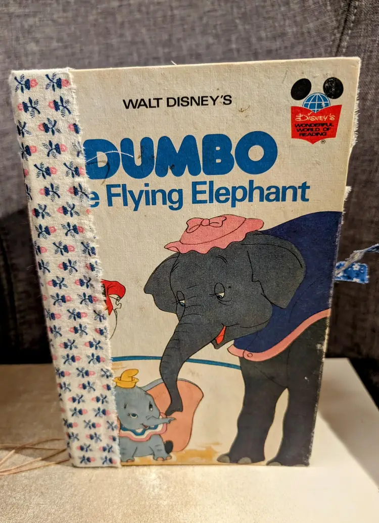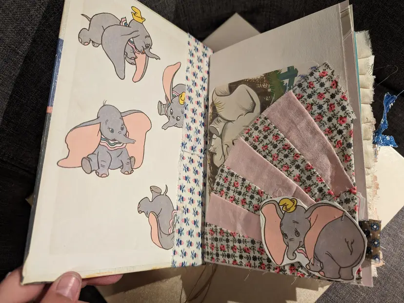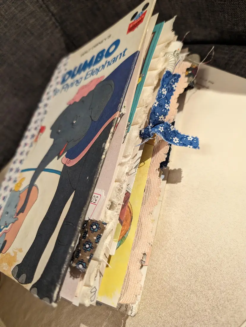 I was able to use three different Dumbo books to use for ephemera in this journal so almost every page has a little bit of Dumbo on it. It's a cute journal for any lover of Dumbo. It measures at 9.75"x5.75" with a spine measuring at 1". It has two signatures with about 20 pages each.