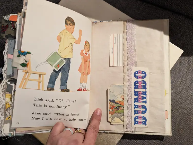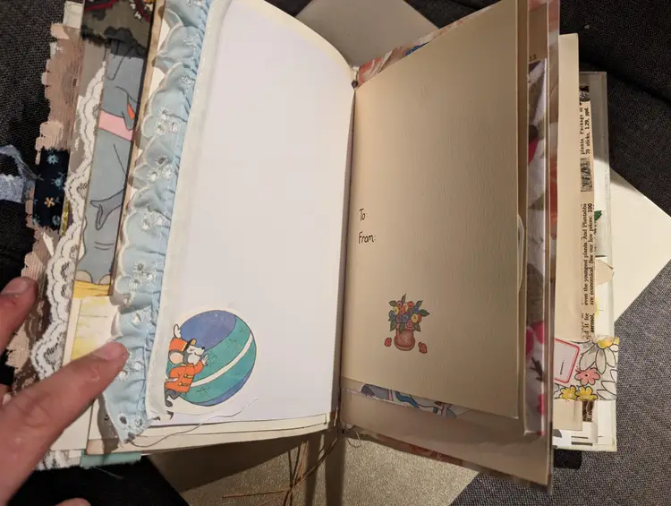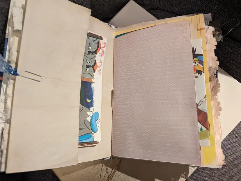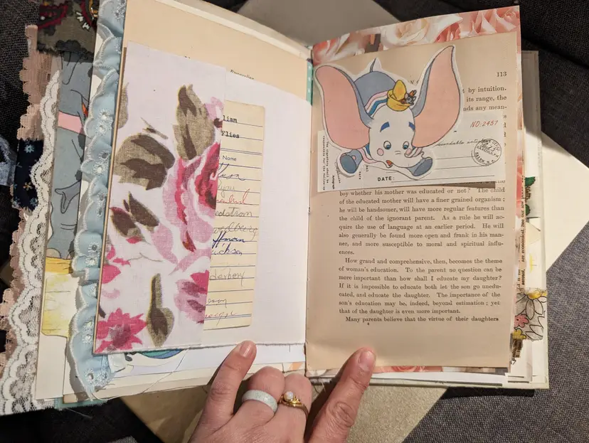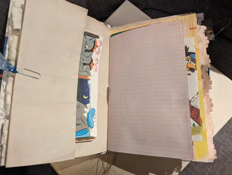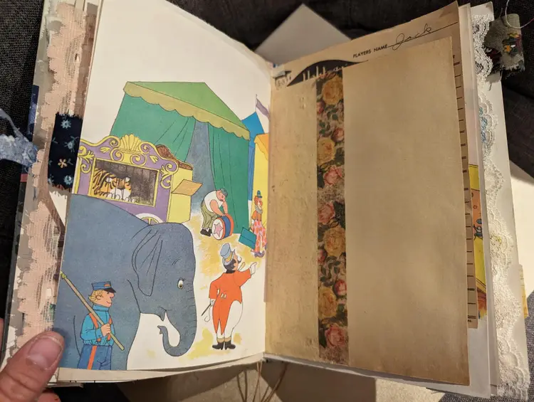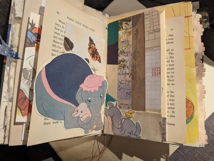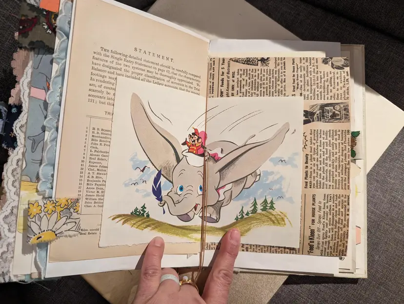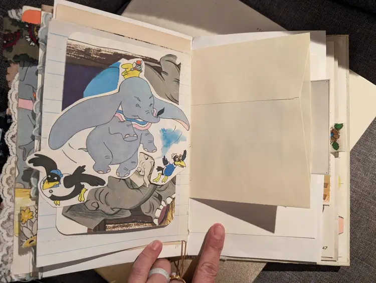 I was able to use three different Dumbo books to use for ephemera in this journal so almost every page has a little bit of Dumbo on it. It's a cute journal for any lover of Dumbo. It measures at 9.75"x5.75" with a spine measuring at 1". It has two signatures with about 20 pages each.