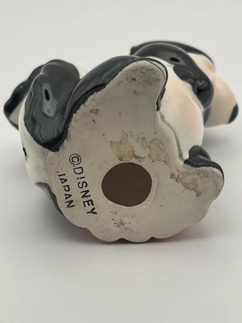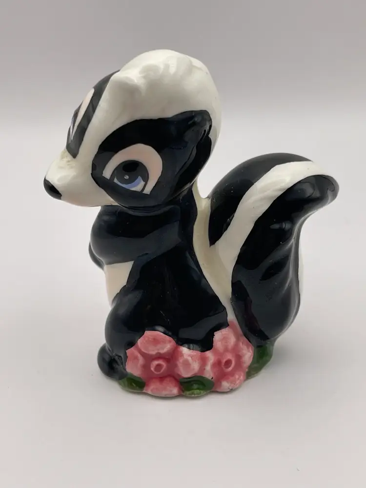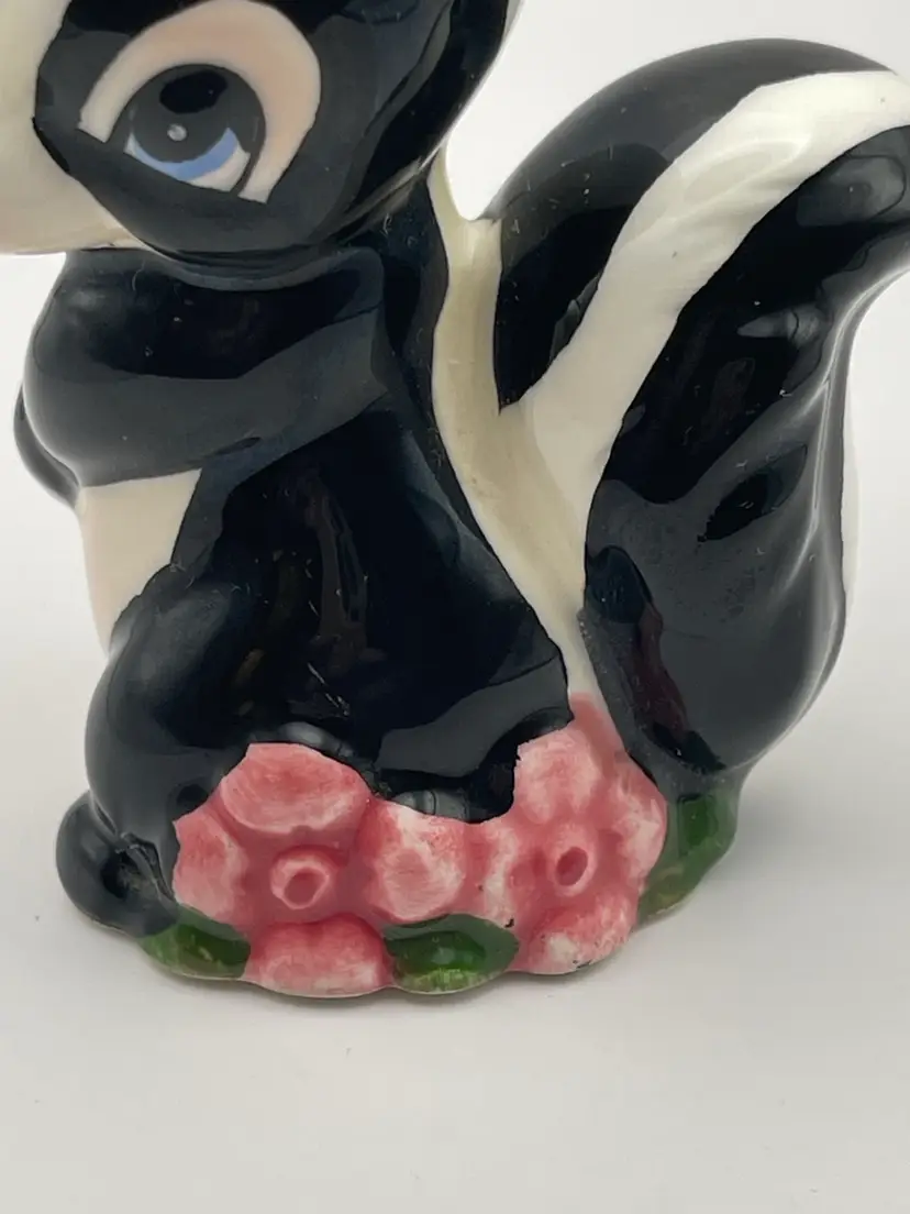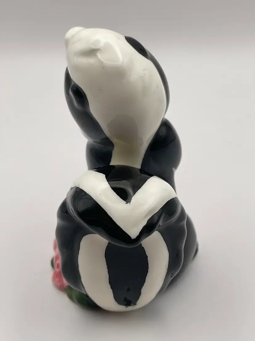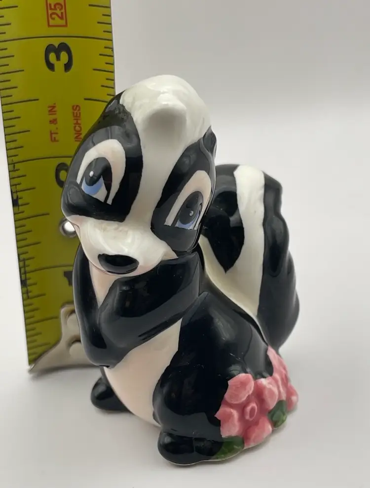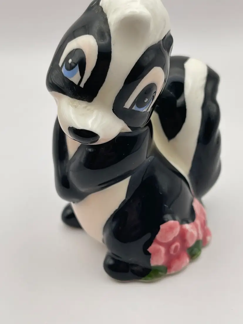 Flower is standing with a bashful look on his face with two pink flowers on his side. Stamped Disney Japan on bottom. No chips or cracks. 2.75 inches tall.