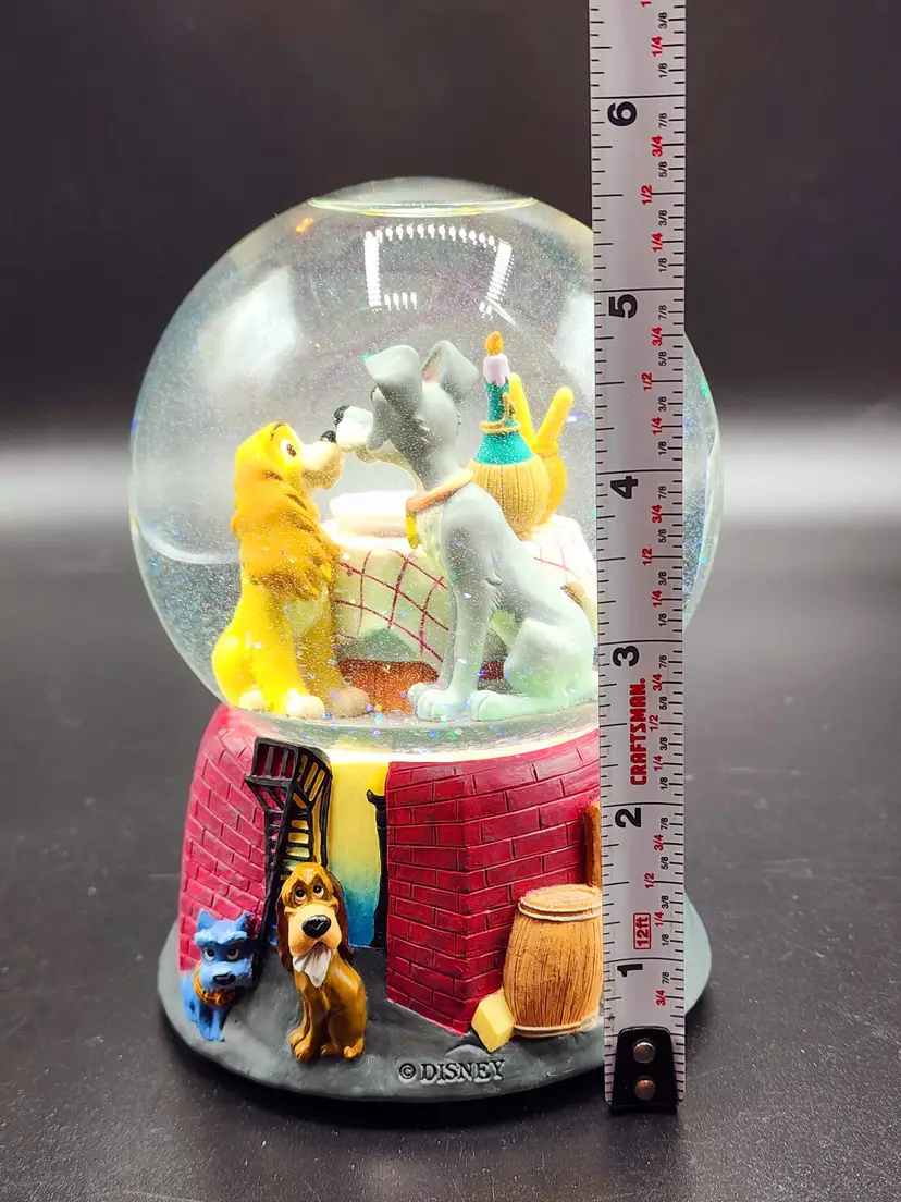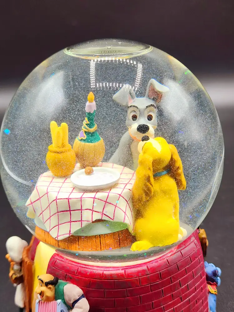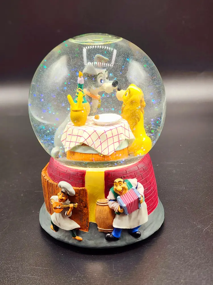 Disney snow globe Lady & the Tramp - plays Bella Notte song and blows conffetti. Measures 5 1/2" tall, condition is very good.