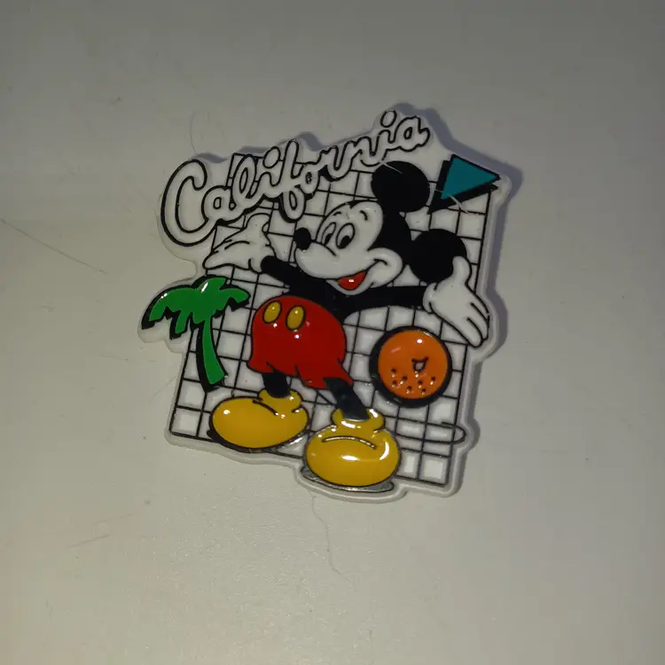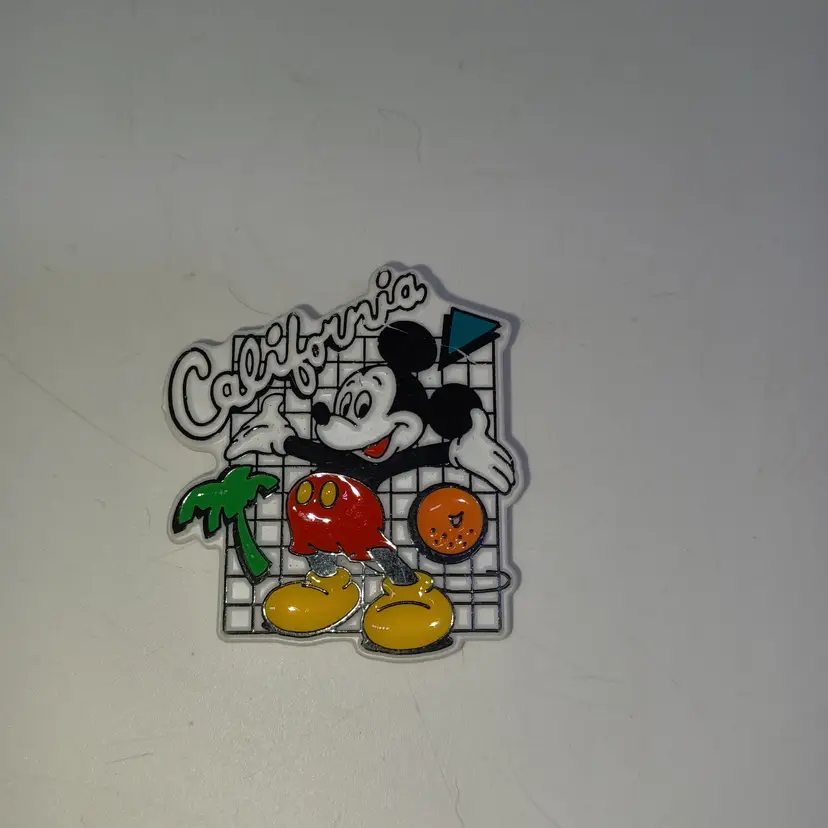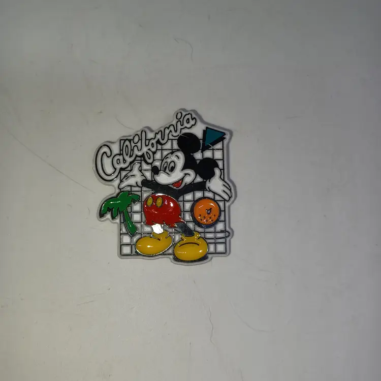 Vintage Disneyland trading pin this is a white pin with Mickey Mouse with California across the top of palm tree and an orange on a grid pattern marked Walt Disney Company on the back in good gently used condition the glue has yellowed from age on t6ge back but is still secure please see all pictures as they are the best description all items from a smoke-free home with pets this item will be mailed in a padded mailer to help you save on shipping