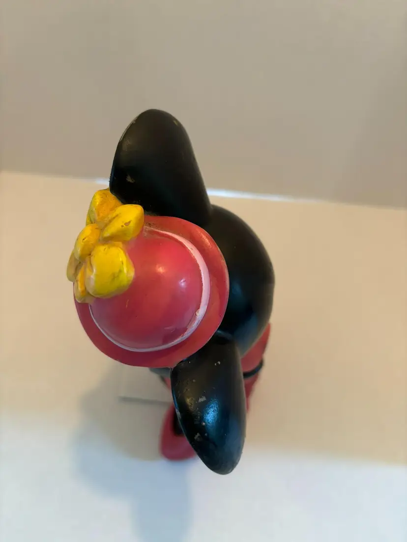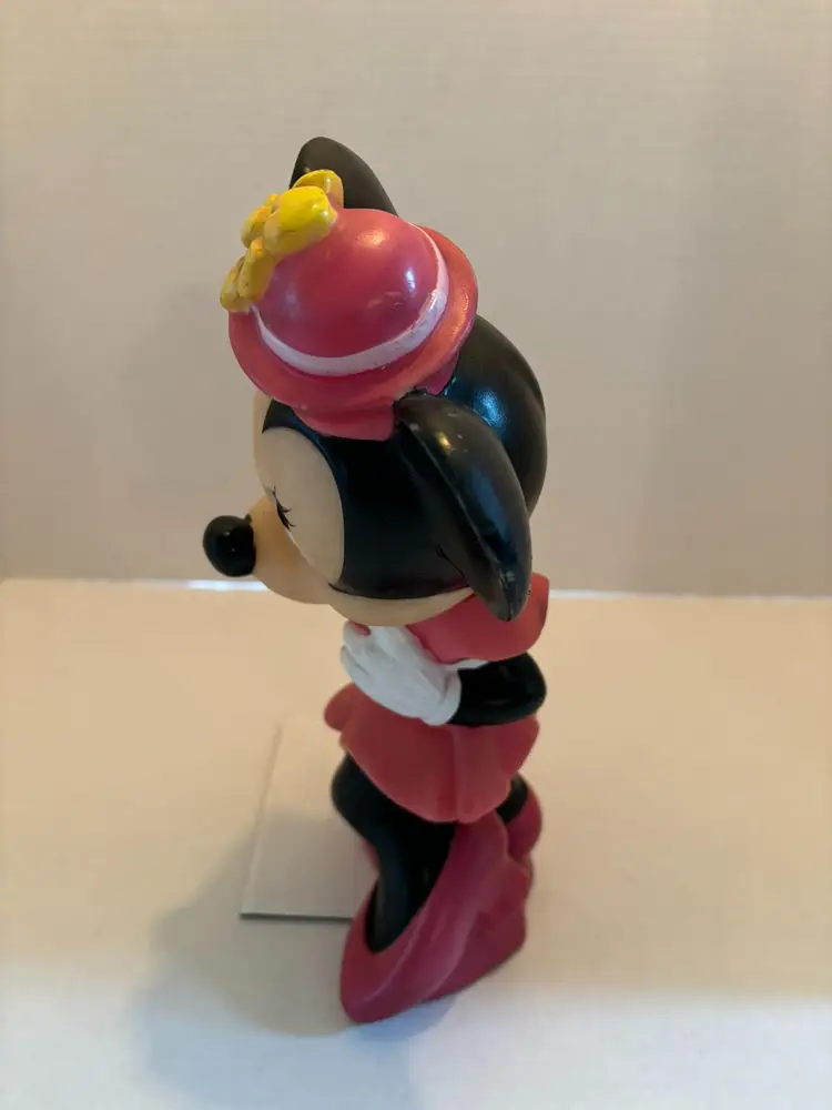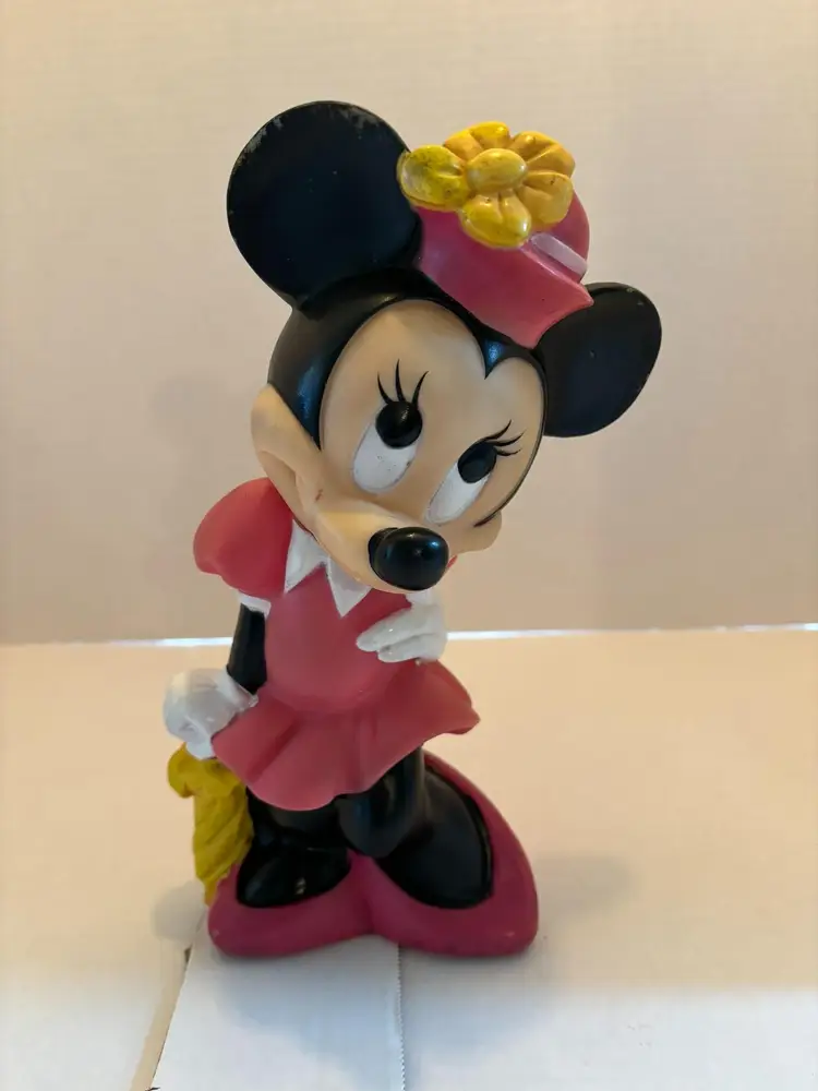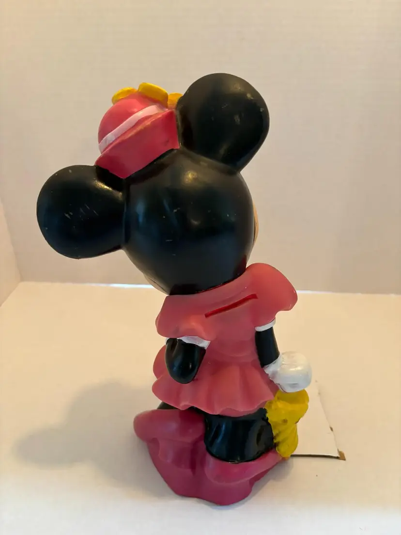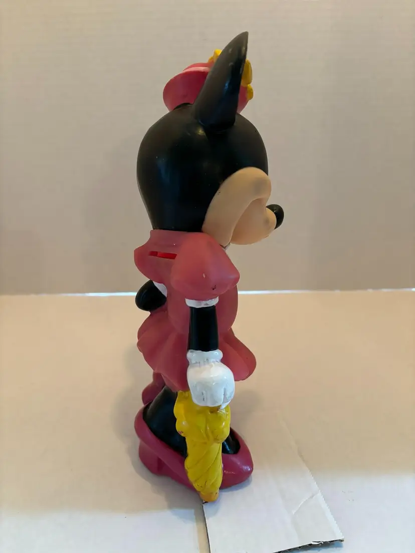 This vintage Minnie Mouse plastic bank from the 1970s is sure to bring back memories of saving money. Measures 11in tall X 5in wide. There is a bubble of sorts on the bottom that makes Minnie tip over but can be repaired by the right professional.