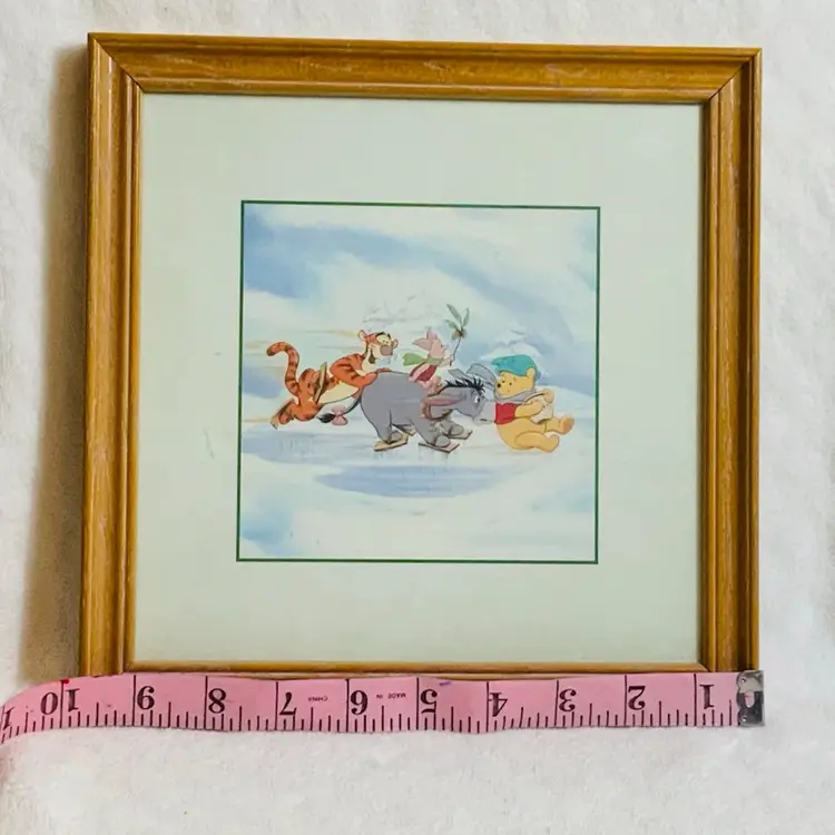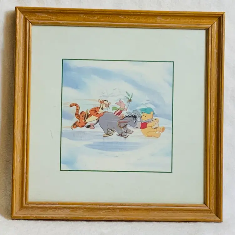 Shows age on the paper backing of frame. Features adorable image of the skating or sliding on the ice. Precious. It looks vintage no chips or cracks in a frame.