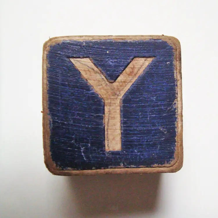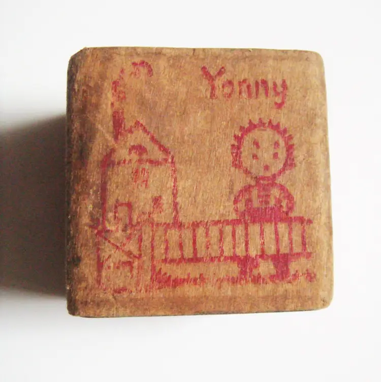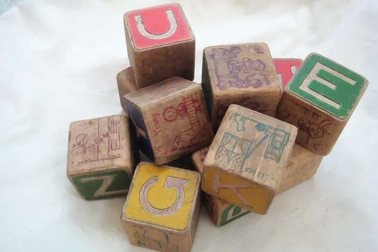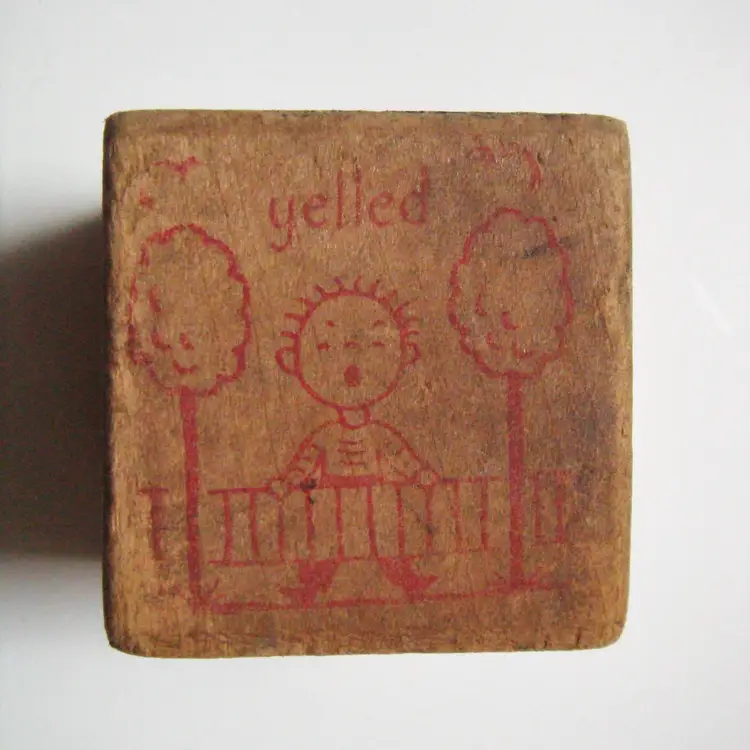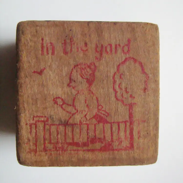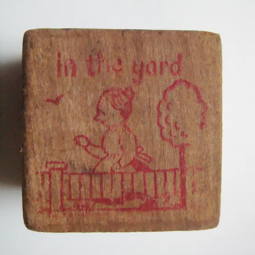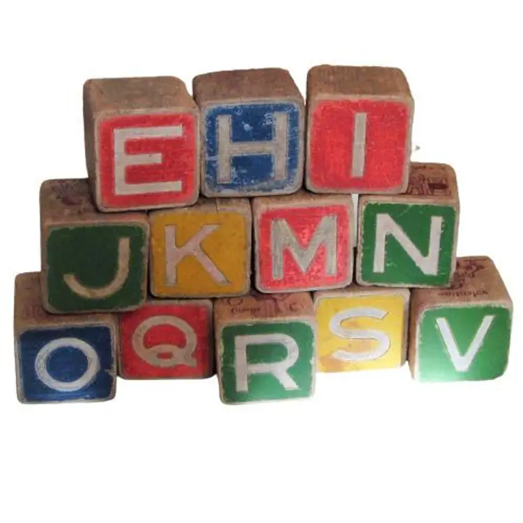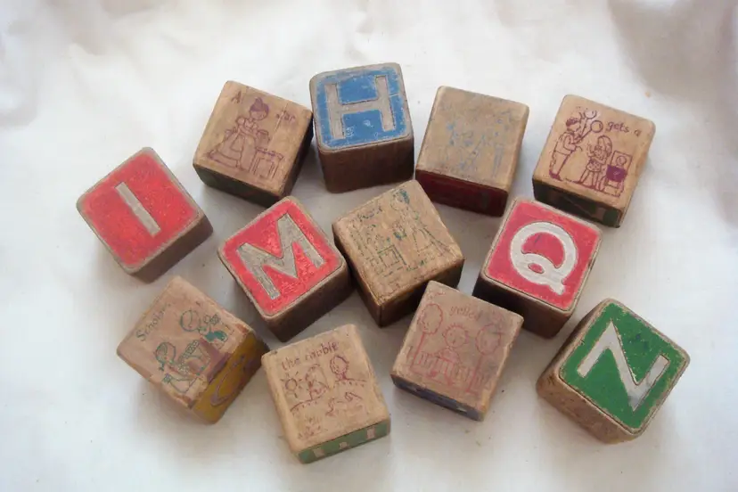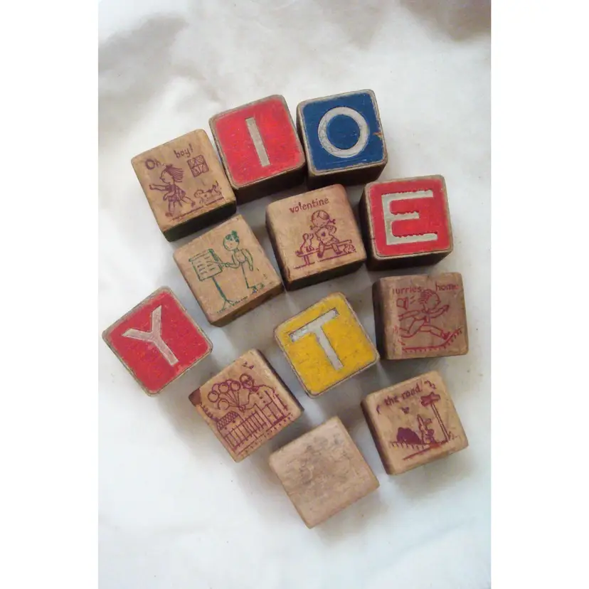 Believe to be 1940s. Incomplete set of 12 wooden alphabet blocks with raised letters and stamped words & images that form a sentence on each block. 2 letters per block. Colors: Blue, Yellow, Green, Orange. Approx. measurements: 1.62" x 1.62" x 1.62" square Early 20th century charm, nostalgia. Lots of wear & fading, adds to their charm.
