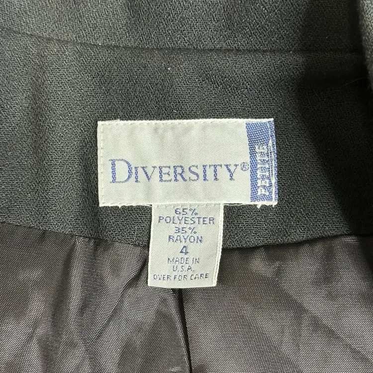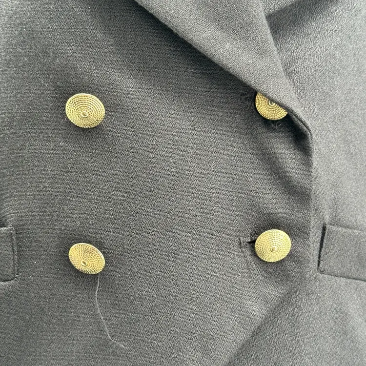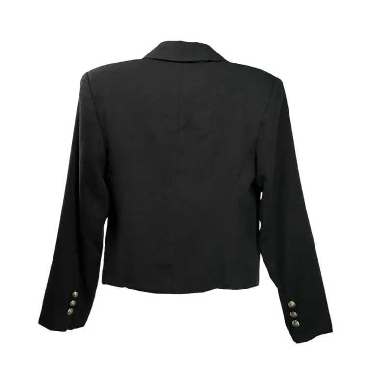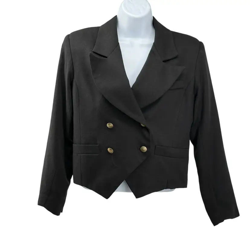 Vintage Diversity Black Cropped Double Breasted Blazer Women's Petite 4 Trendy, sleek, corporate, corpcore, corporate siren Gold tone buttons Polyester, Rayon Made in the USA Cira 1980s, shoulder pads Great condition