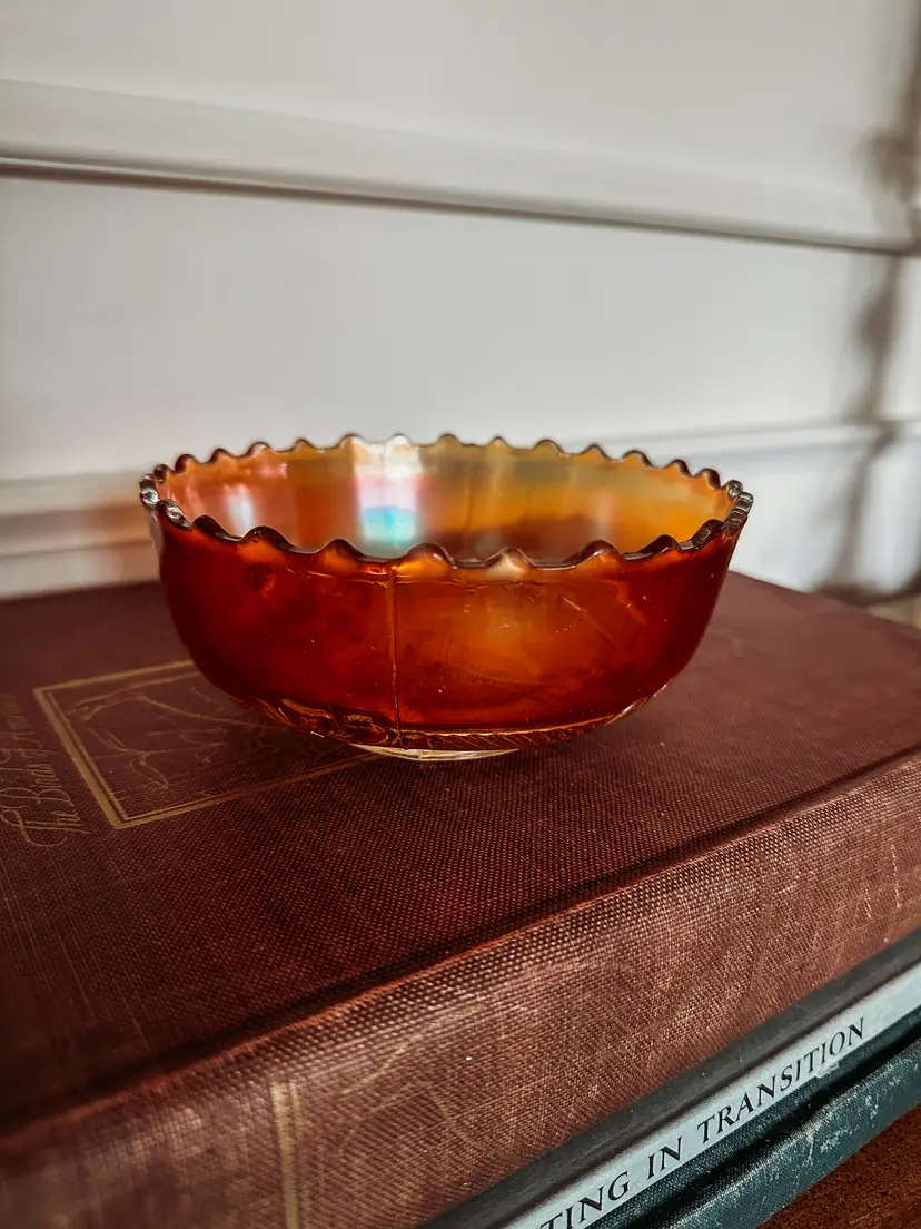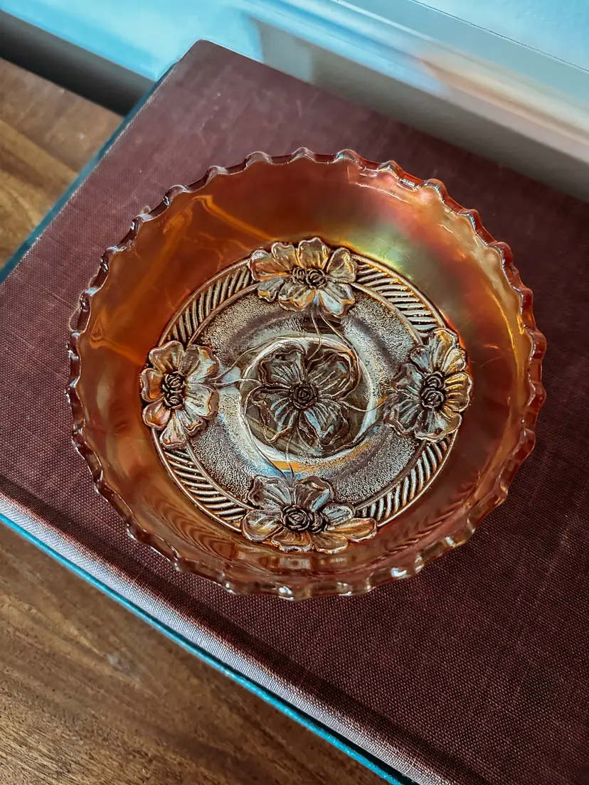 Handcrafted in the United States, this original Carnival Glass bowl is a testament to impeccable craftsmanship. To preserve its beauty, hand wash only.