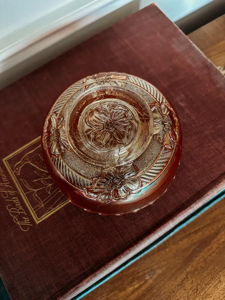 This vintage decorative bowl boasts a stunning round shape, measuring 5 1/2 inches in diameter and 2 inches in height.