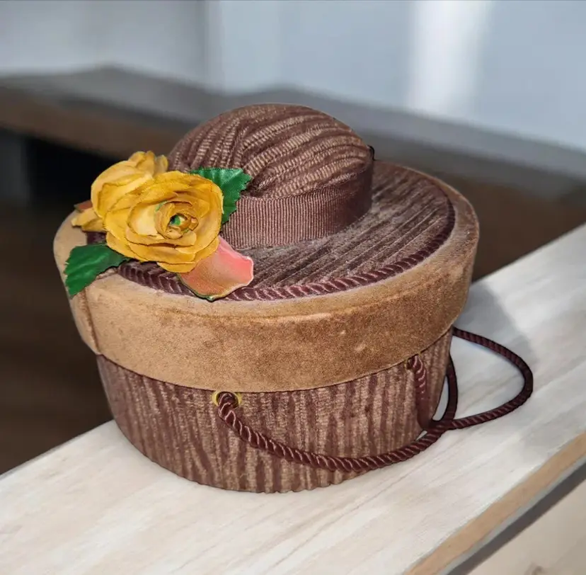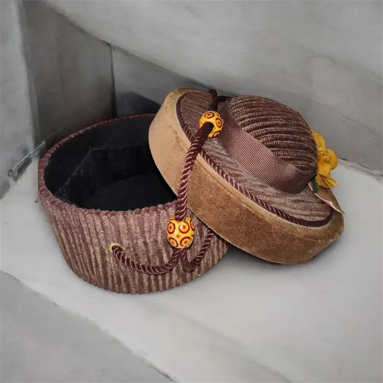 Expertly crafted with vintage charm, this doll hat box is the perfect addition to any collector's repertoire. Measuring 6.5" in diameter and 4.5" high, it is the perfect size for storing delicate doll hats. Add a touch of nostalgia to your collection with this beautiful piece. Excellent condition. Made of corduroy