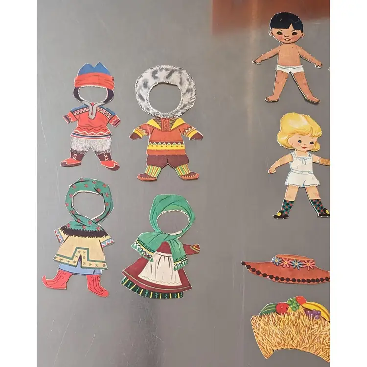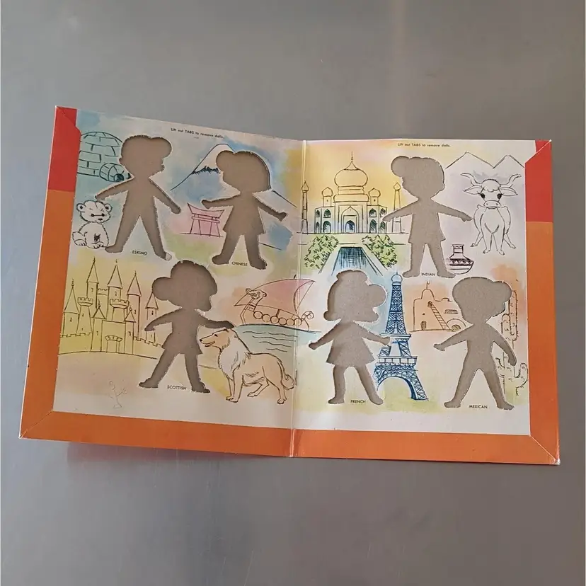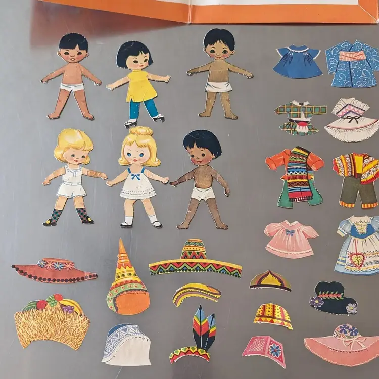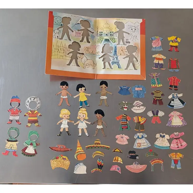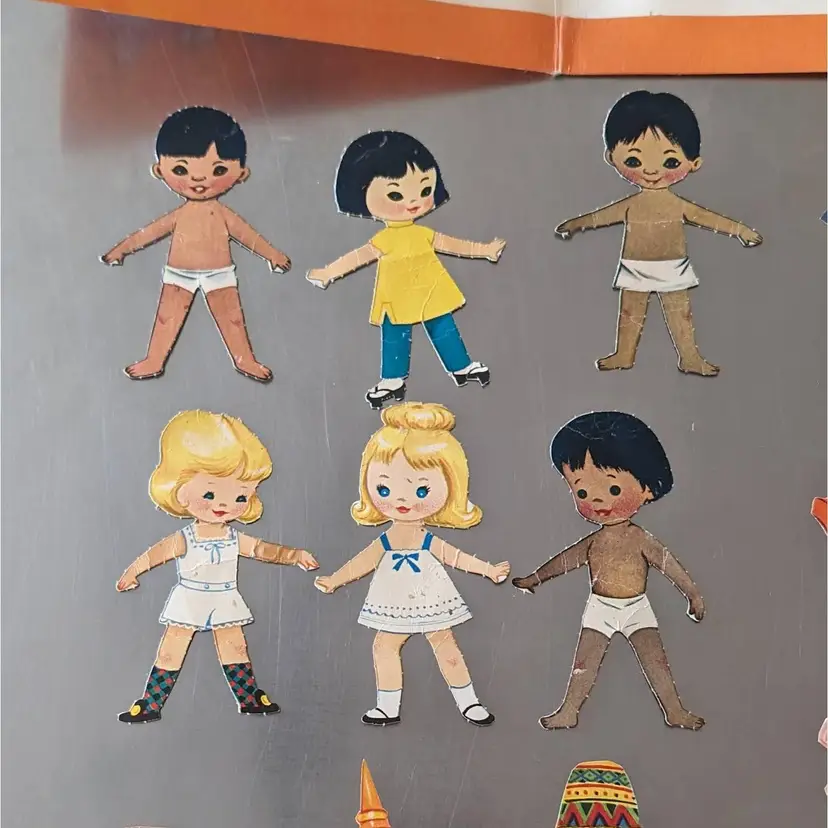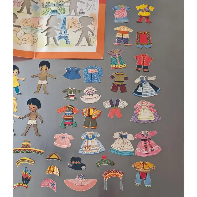These paper dolls have been punched and cut out. Some of the tabs have been removed as it looks like the original owner used putty to put on the clothing. There are some bends, small tears and staining (see pictures). These dolls are perfect to play with or use for creating. May not be complete.