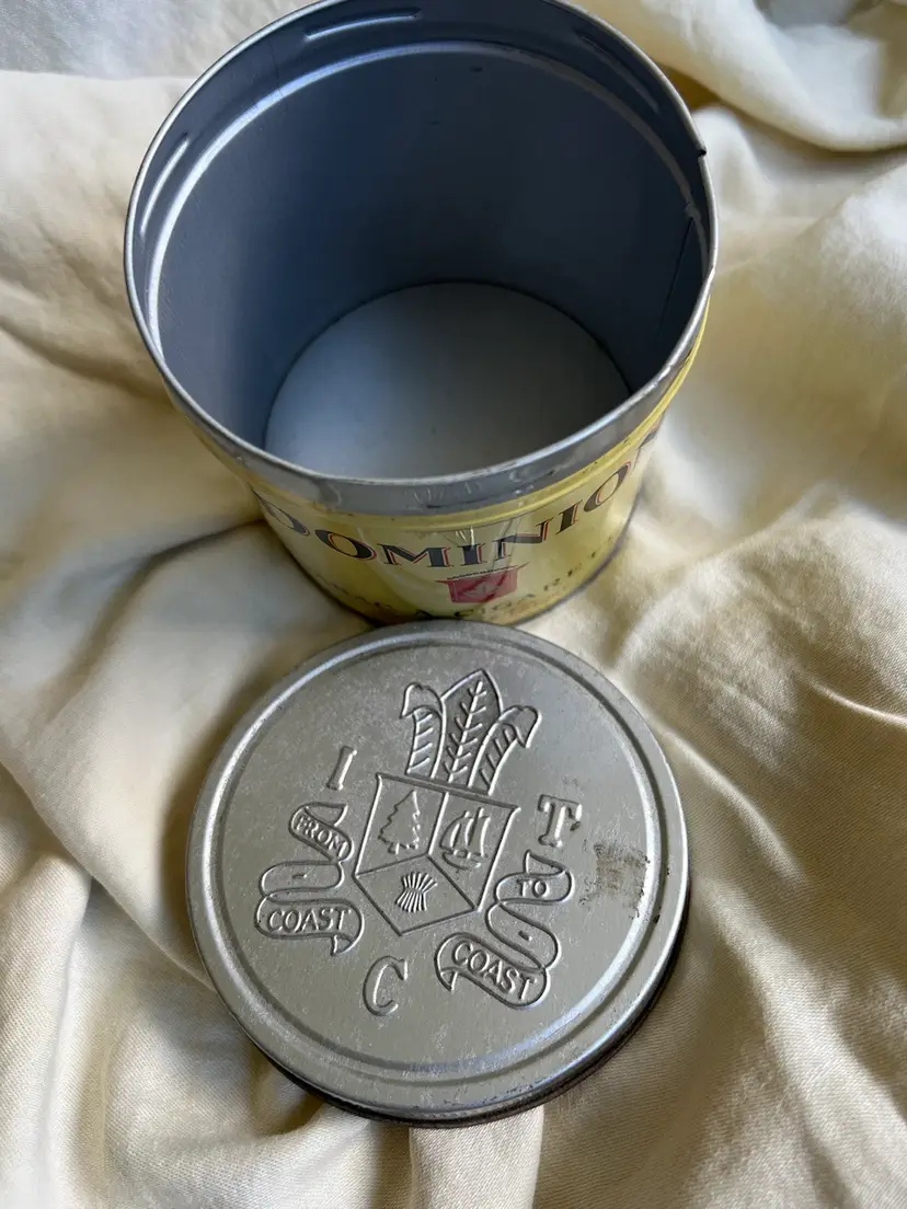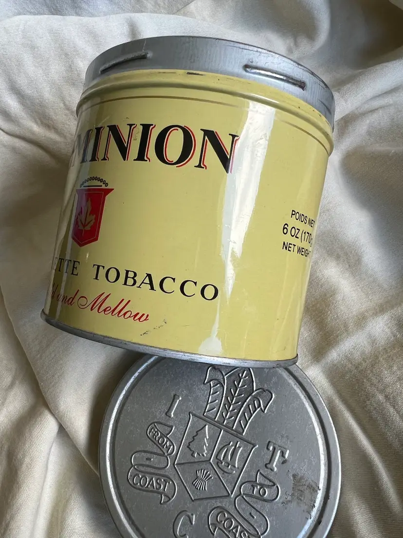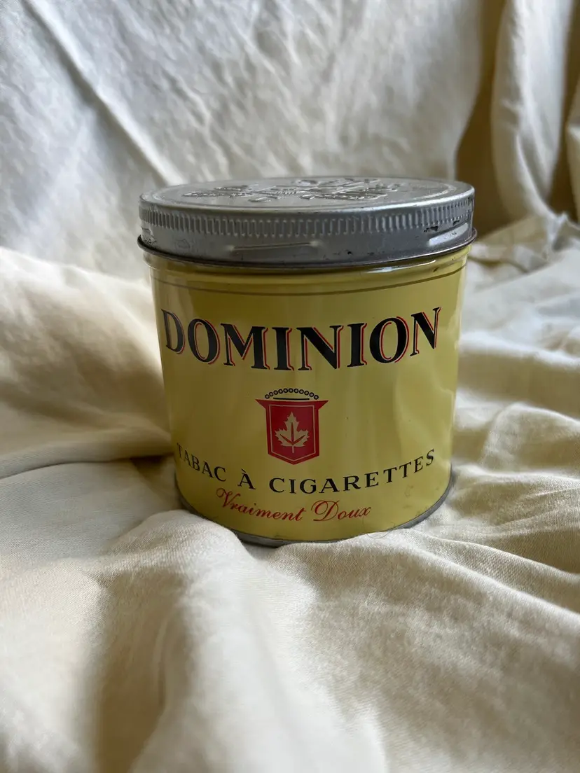 Empty 6 ounce vintage cigarette tobacco tin with decorative coat of arms embossed lid. Add this unique Canadian piece to your collection or use it for hidden storage. It is labeled in both English and French.