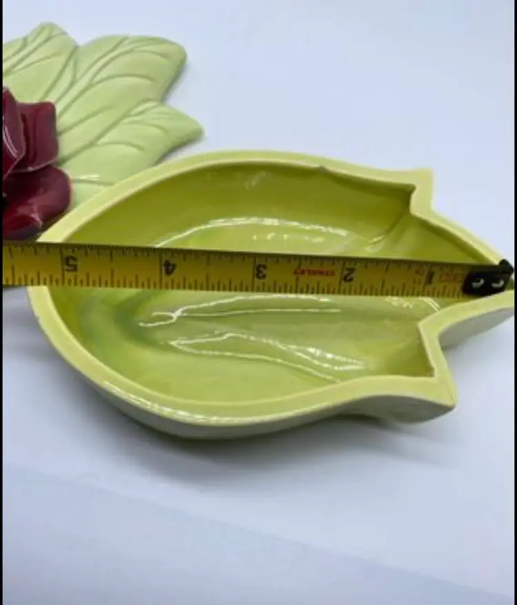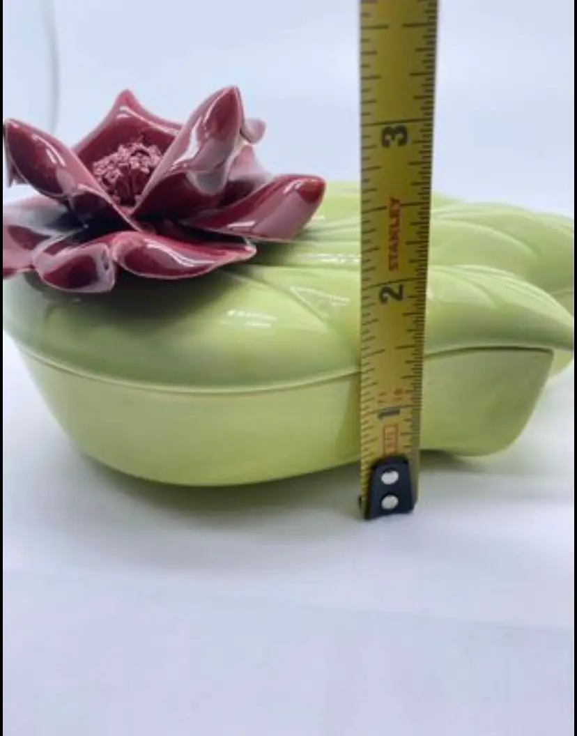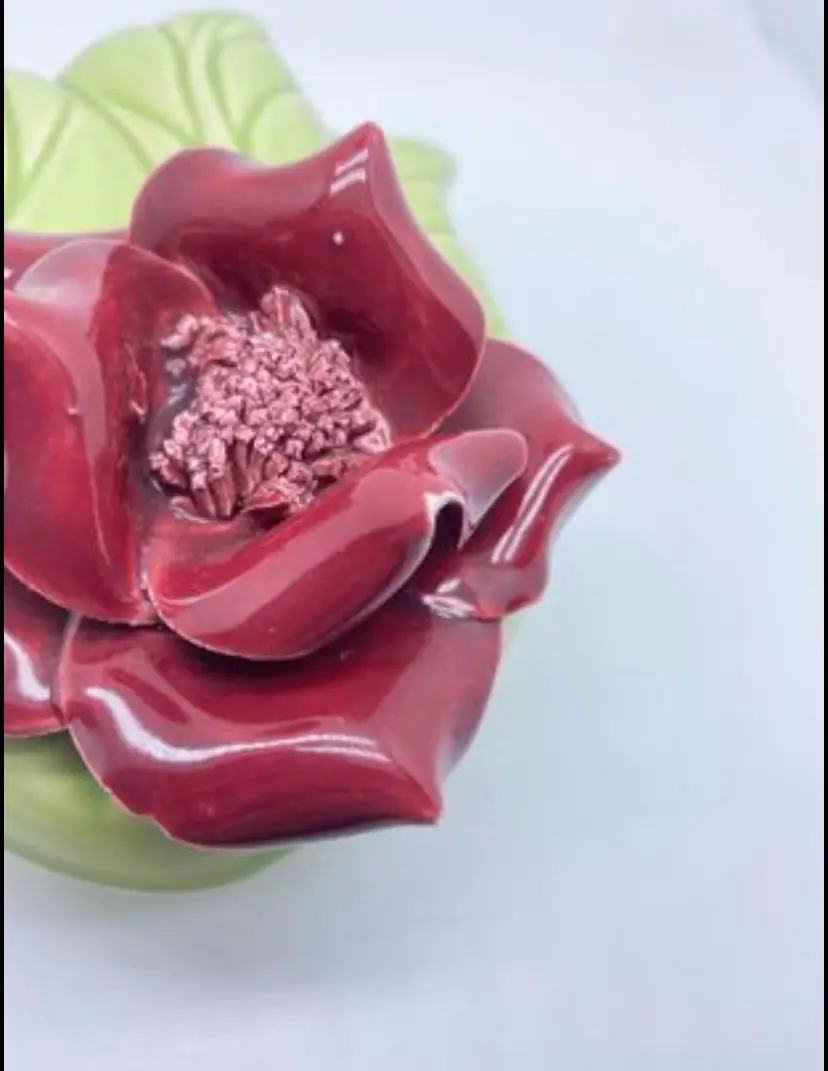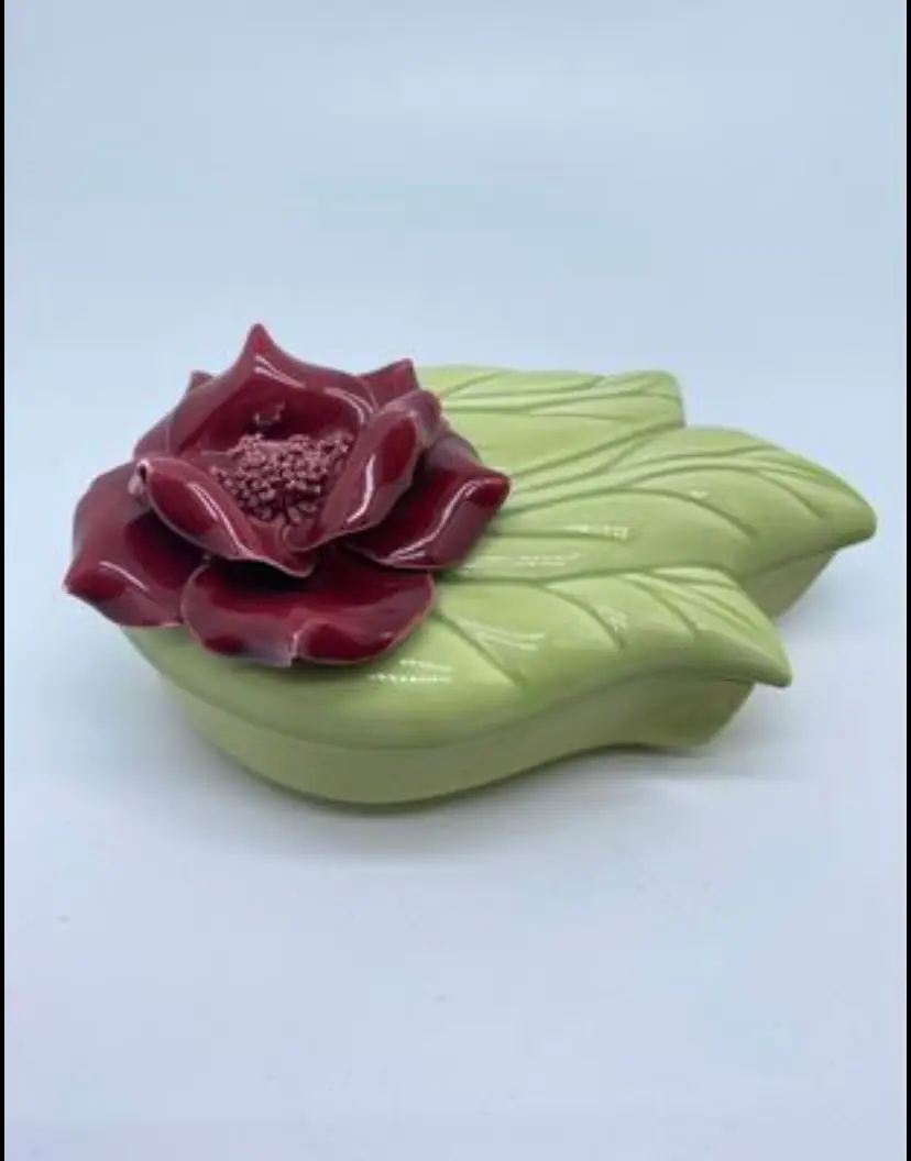 Vintage Don Jay Pottery California trinket dish. Maroon/burgundy flower with green dish/lid. Has a small chip on flower but still looks good. Has a chip inside on edge. See all photos. Some crazing.