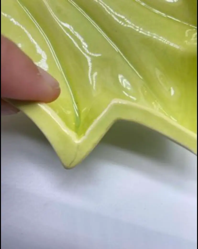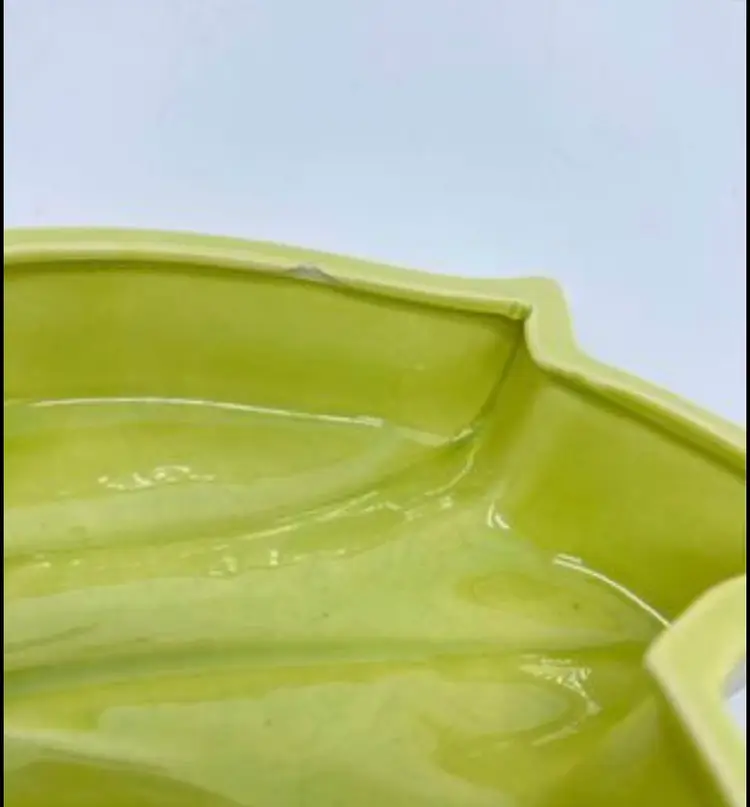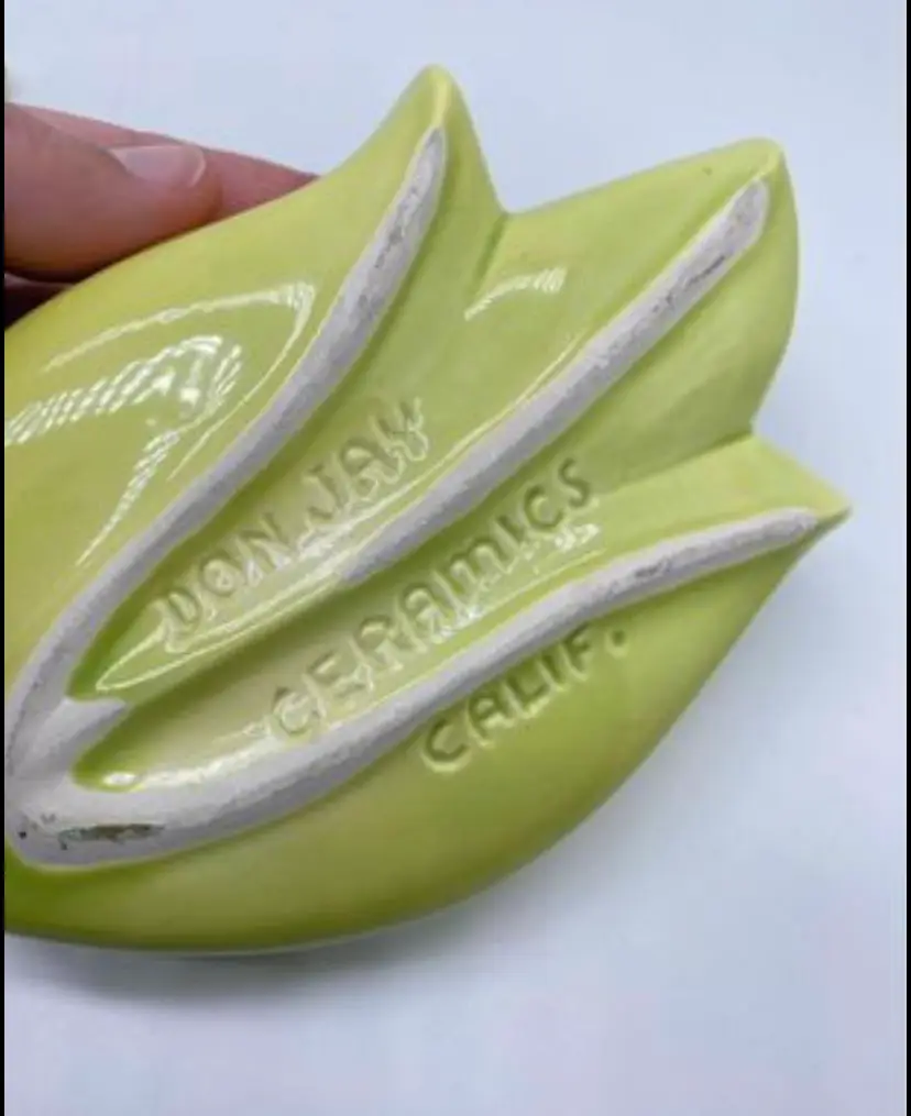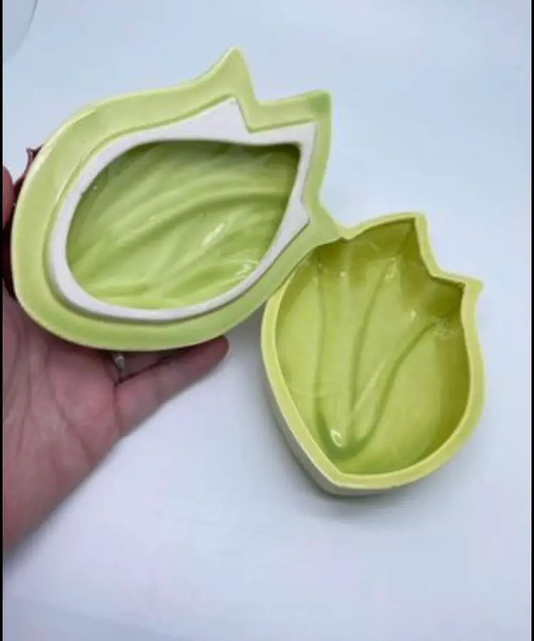Vintage Don Jay Pottery California trinket dish. Maroon/burgundy flower with green dish/lid. Has a small chip on flower but still looks good. Has a chip inside on edge. See all photos. Some crazing.