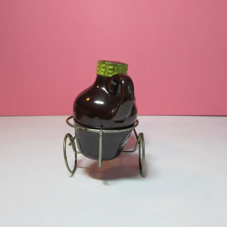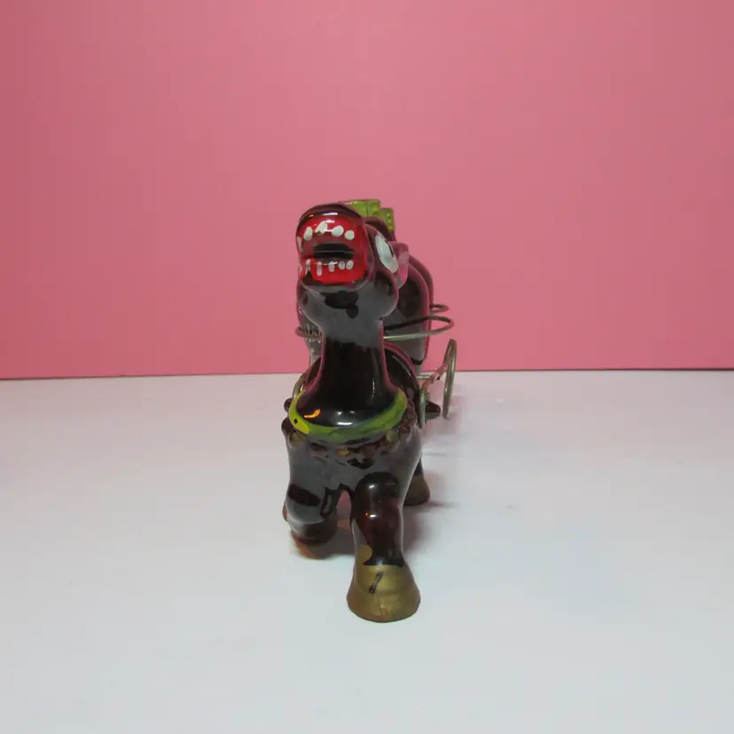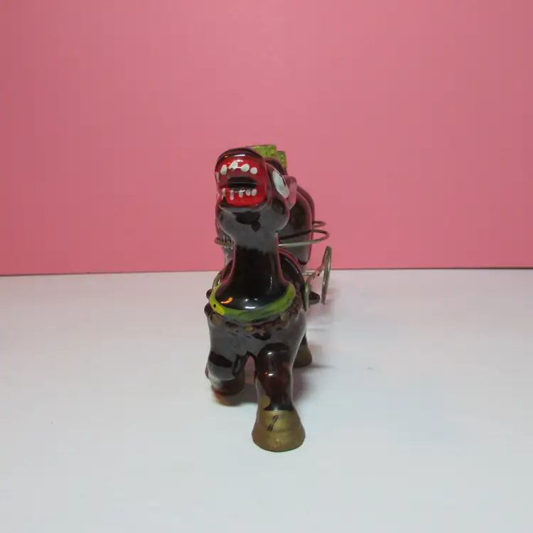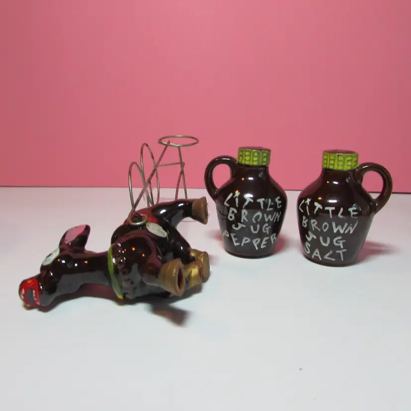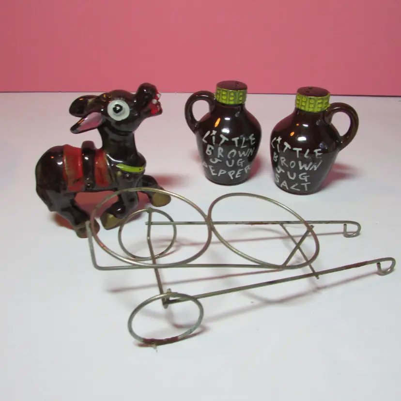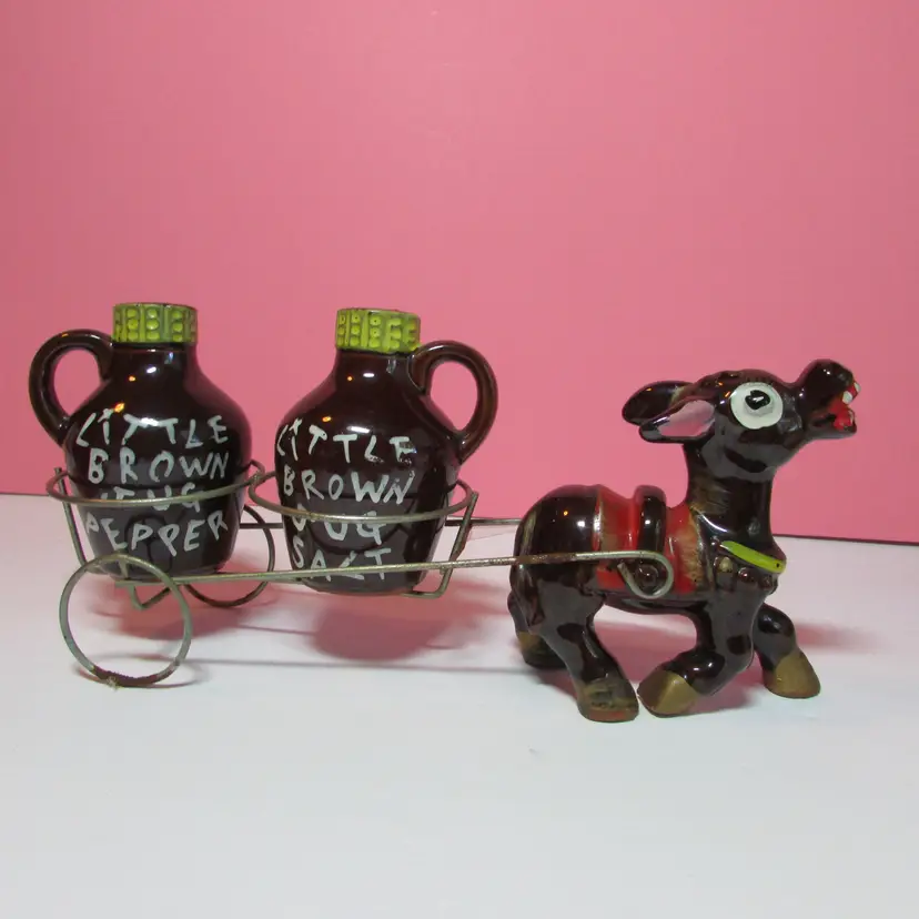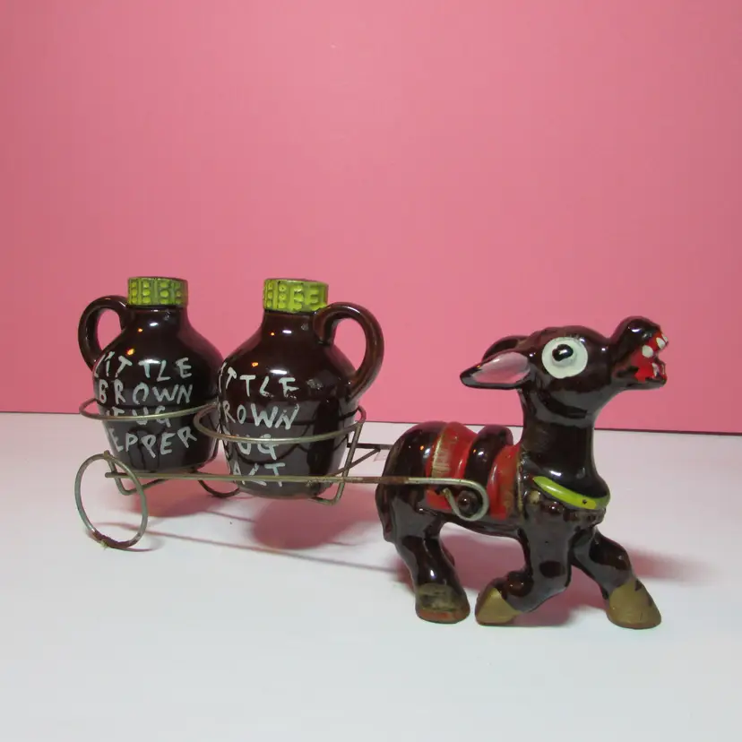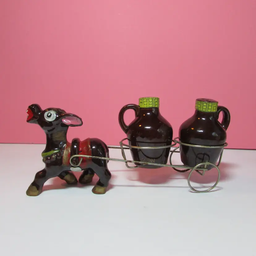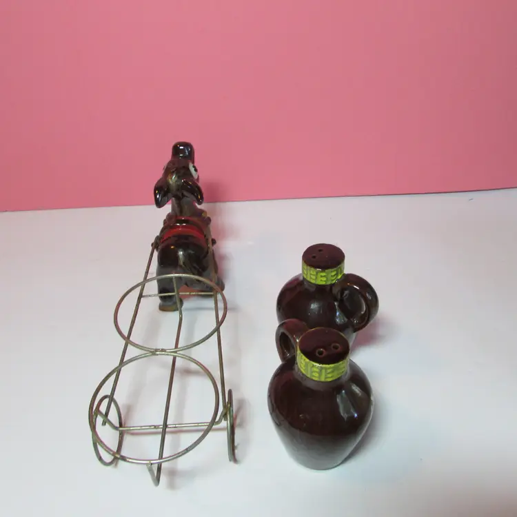 This fun set has some wear, the is some rust on the cart. Still a nice set to display. The donkey with cart is about 4" x 9" x 3" and each shaker is about 3" tall.