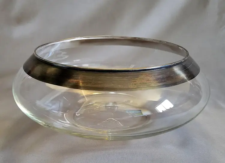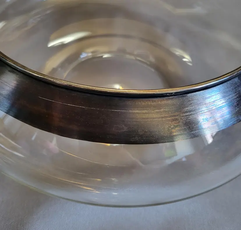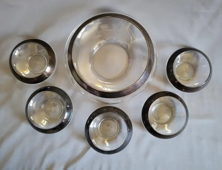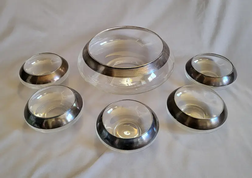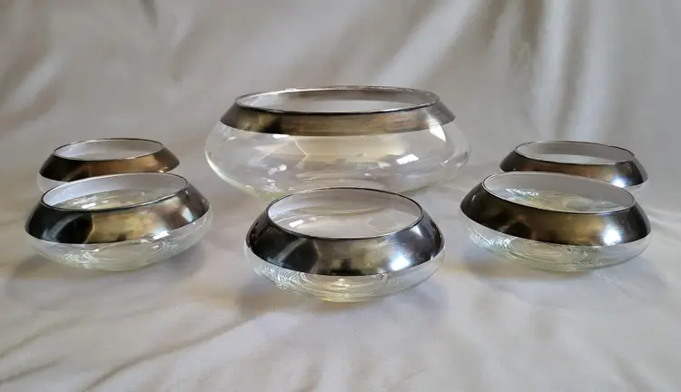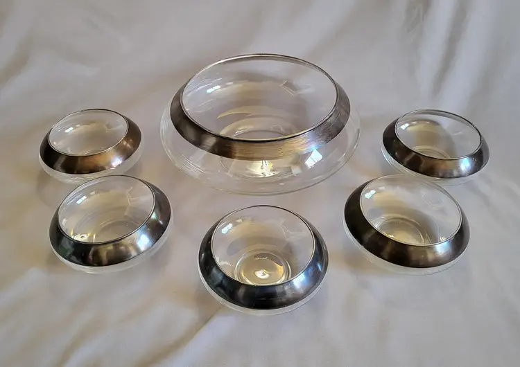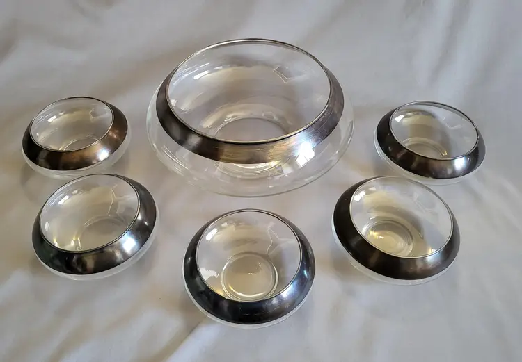 This set of 5 bowls and 1 serving bowl was made by Dorothy Thorpe in the 1950's or 60's. All the bowls have a wide silver band around the rims. Their unique shape gives the set a retro feel.