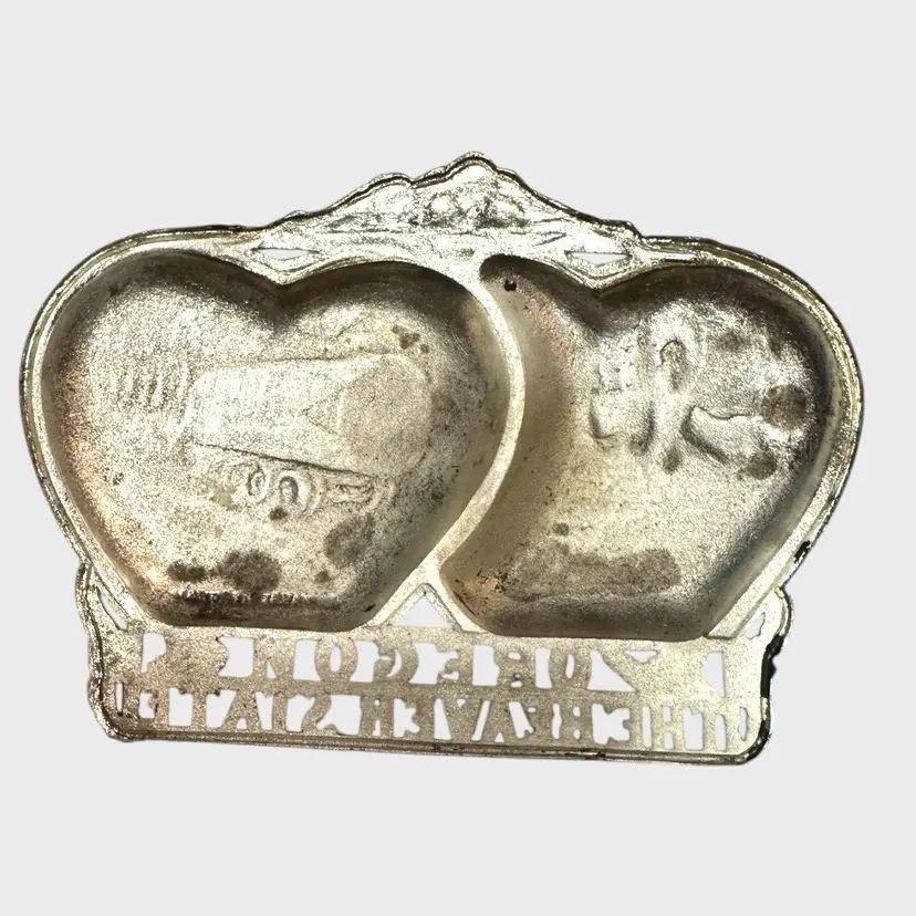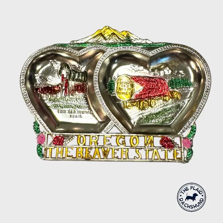 Amazing double heart tin trinket dish from the 60’s. Depicts popular tourist attractions. Made in Japan. Great souvenir when people drove around the country for family vacations.