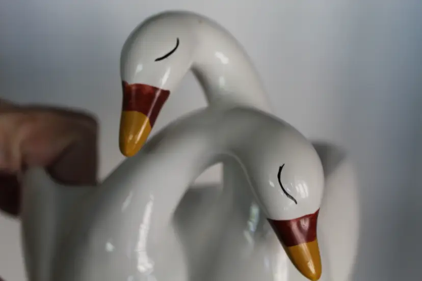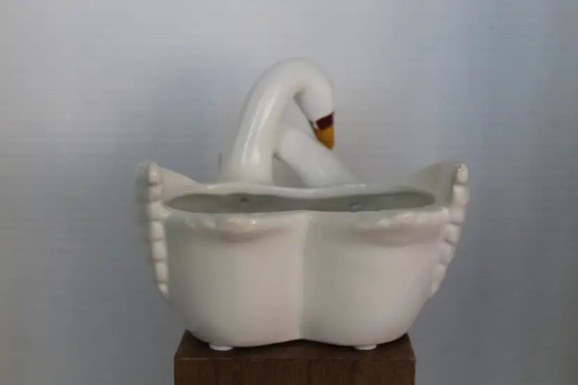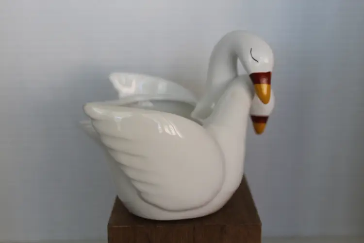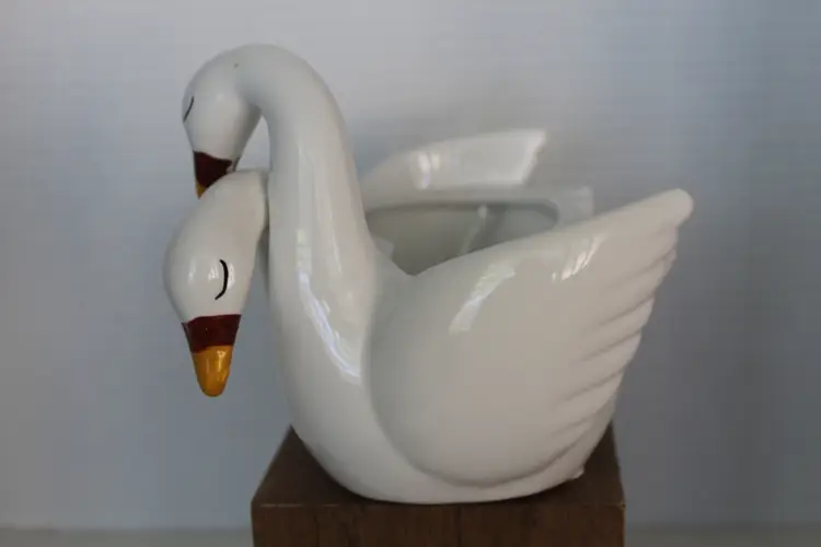 This vintage double hugging swans planter bowl figurine is a charming addition to any indoor space. Made of ceramic in a solid white color with a glossy finish, this round piece features a unique design of two swans embracing each other. Measuring 5 3/8 inches in length and 4.75 inches in height, this mid-century modern style planter is an original and unmarked piece from Japan. Perfect for displaying white geese decor or as a lovely standalone decorative piece.