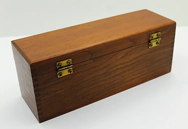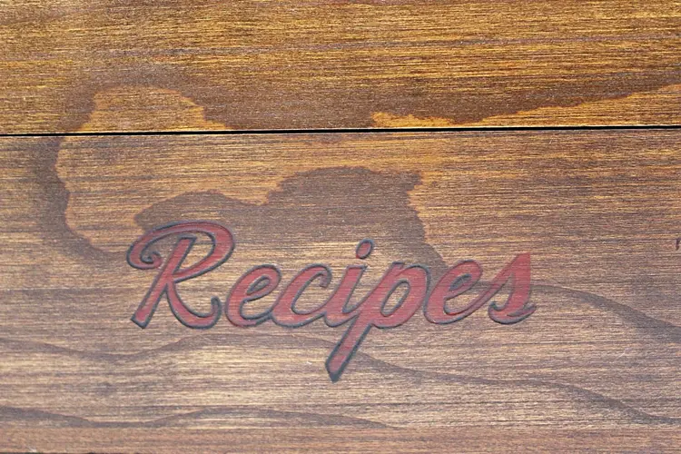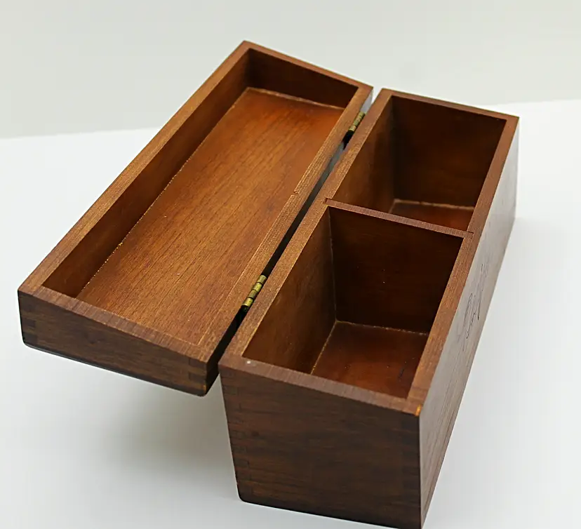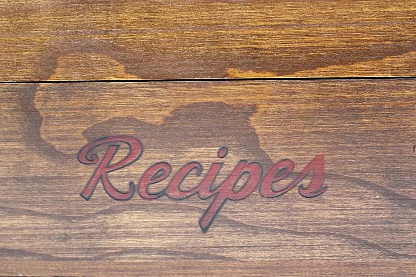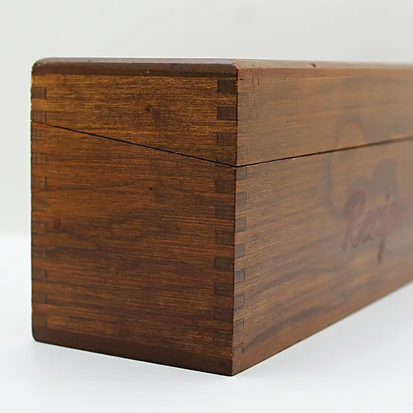 Keep your most delicious family recipes in this beautiful, slightly rustic, real wood box. Finger joint corners and a simple red script logo perfectly complement the deep wood grain and brass hinges. Outside measurements are 11.5 x 4.5 x 3.75 inches. Inside there are two compartments for 3 x 5 cards.