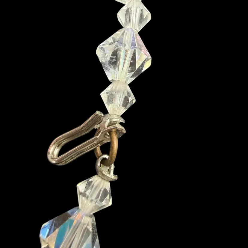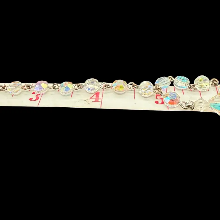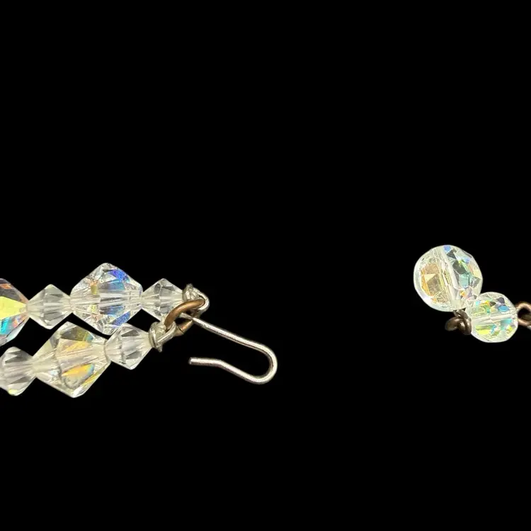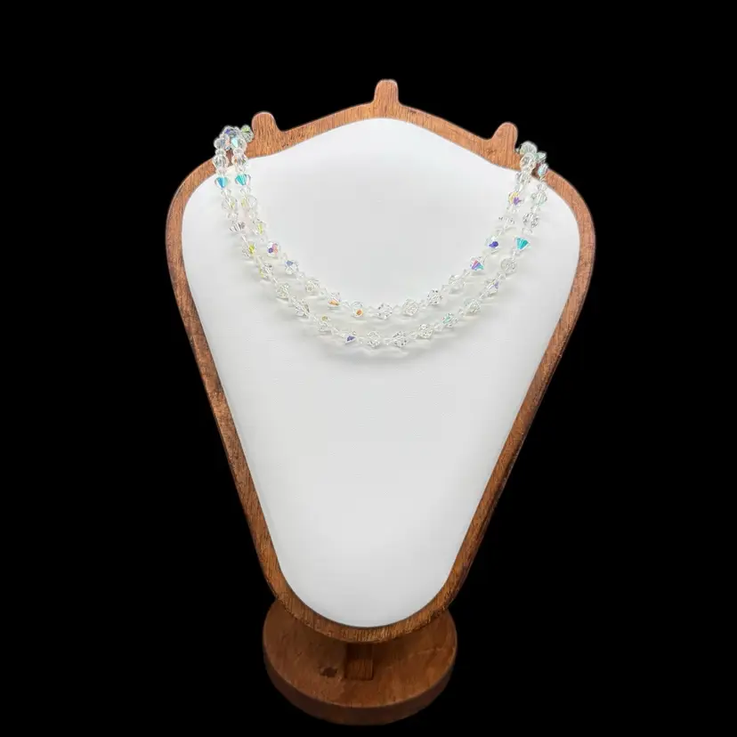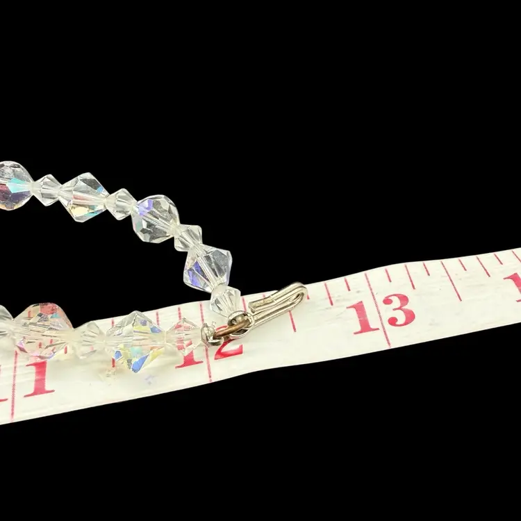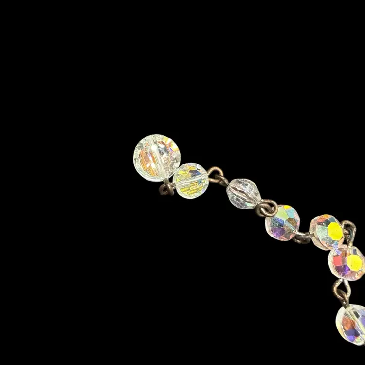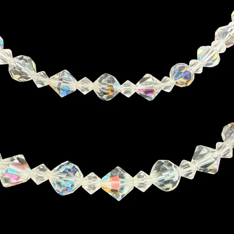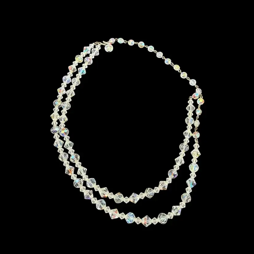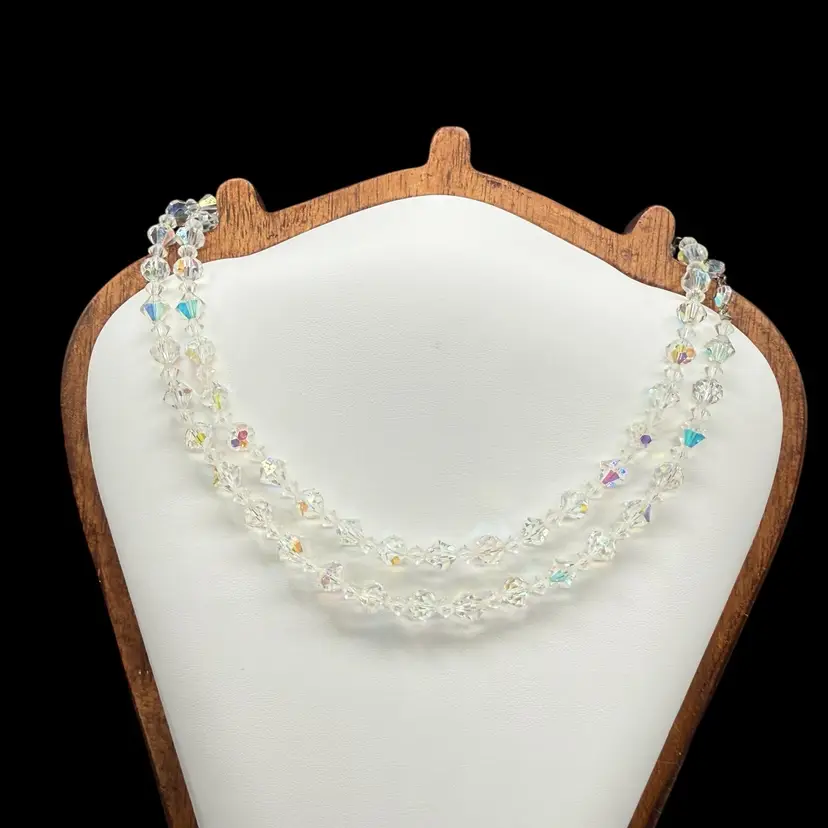 This Vintage Double Strand Aurora Borealis Beaded Choker Necklace features a clear white/colorless glass main stone in a bicone faceted shape. The necklace has a spring ring closure and is 16.5 inches in length. This elegant and sparkly piece is ideal for women looking for a beautiful and stylish accessory, perfect for various occasions. The retro, princess-like design adds a touch of glamour and sophistication to any outfit, making it a valuable addition to any jewelry collection for those who appreciate vintage and classic pieces.