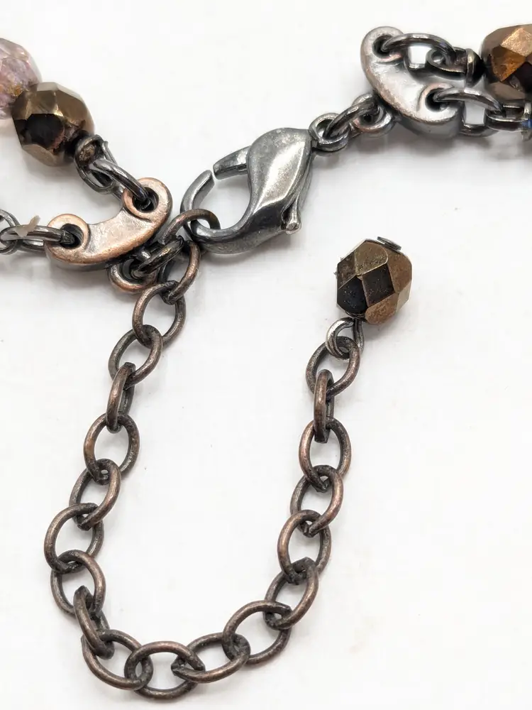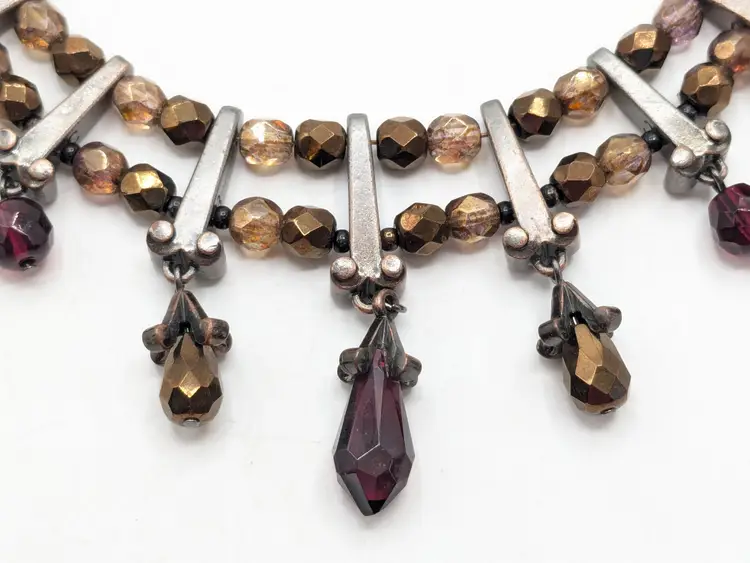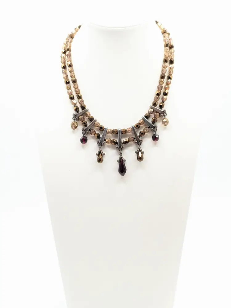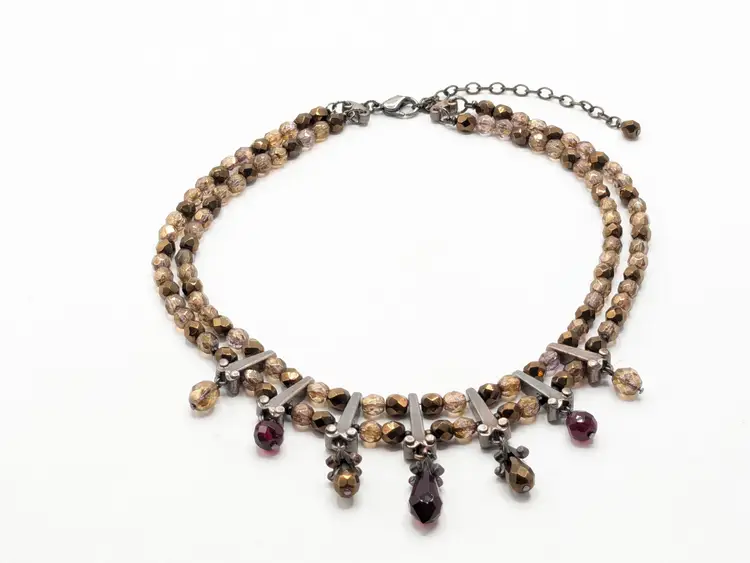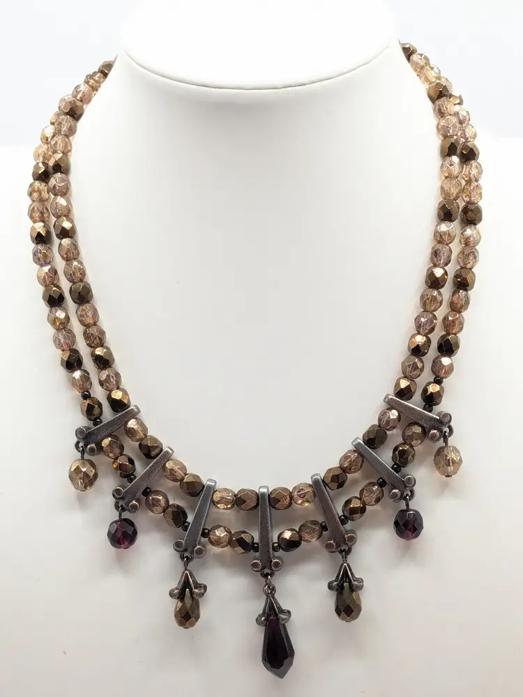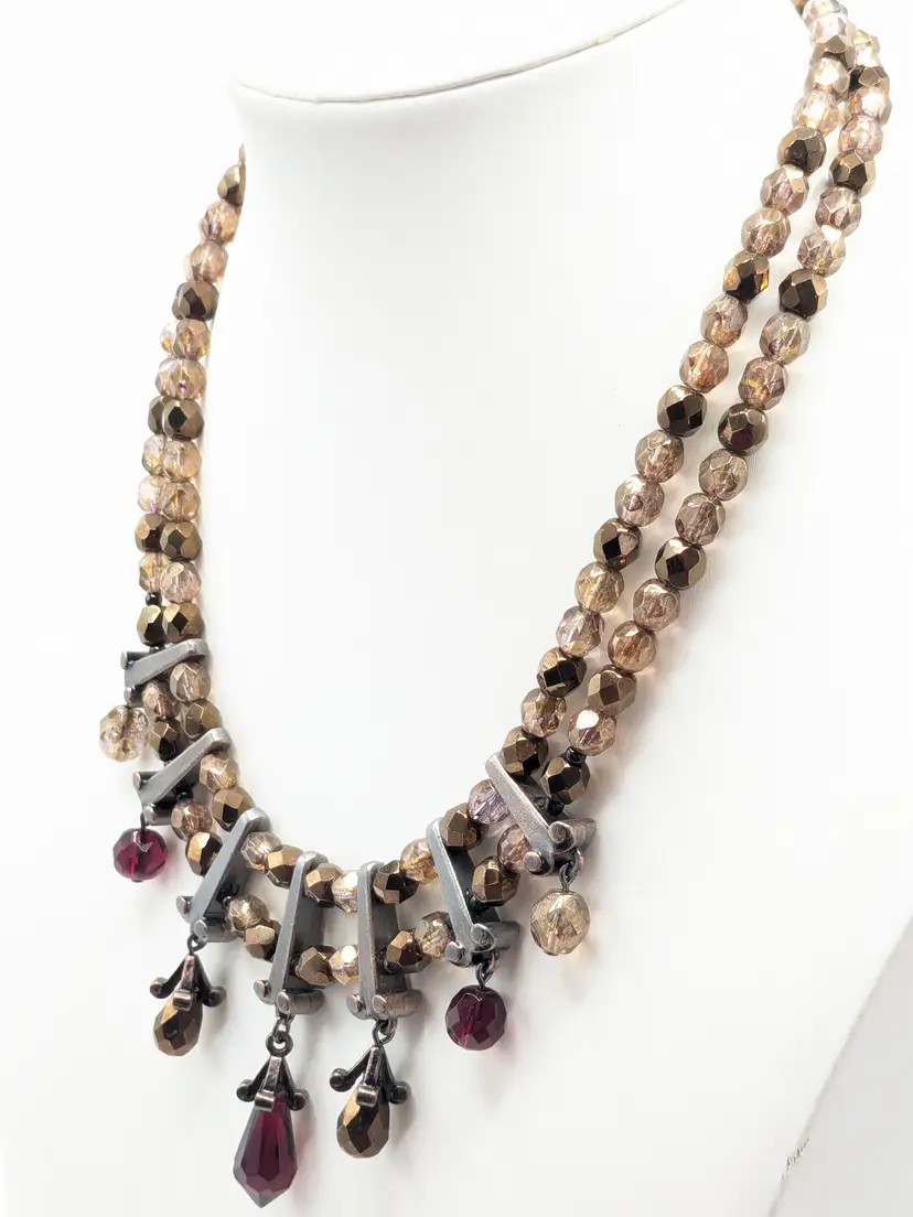 Good condition. Silver tone accents. Double strand glass beads in red and cognac/amber color. Measures 15" with a 3" extension. wen