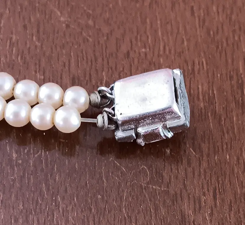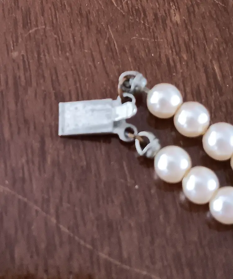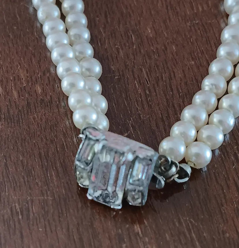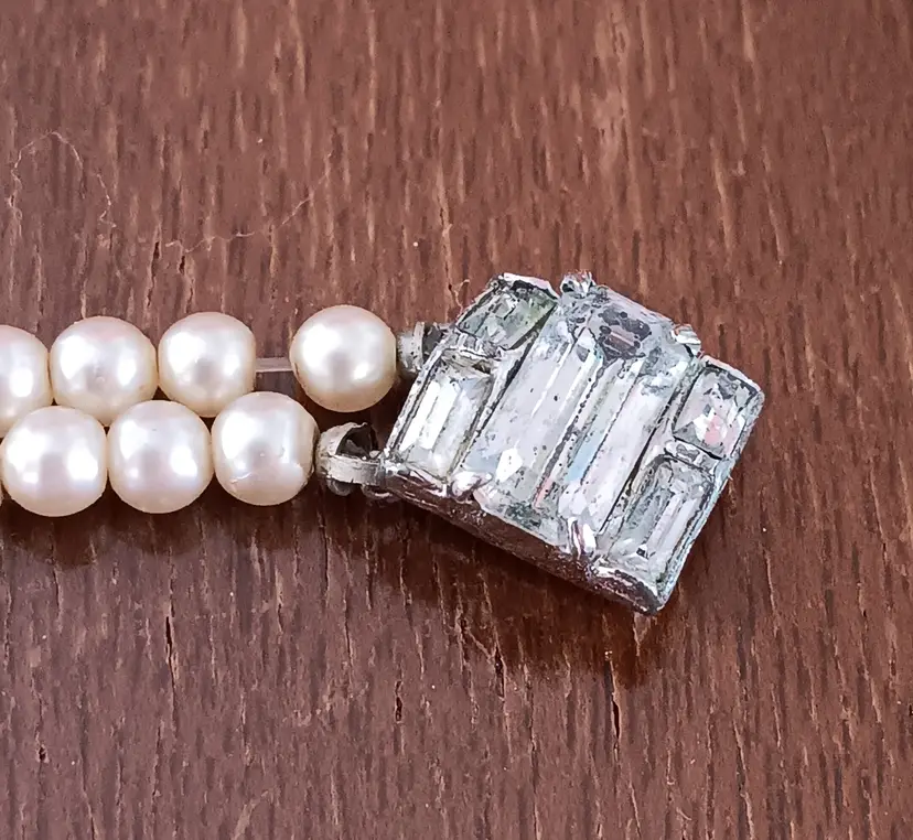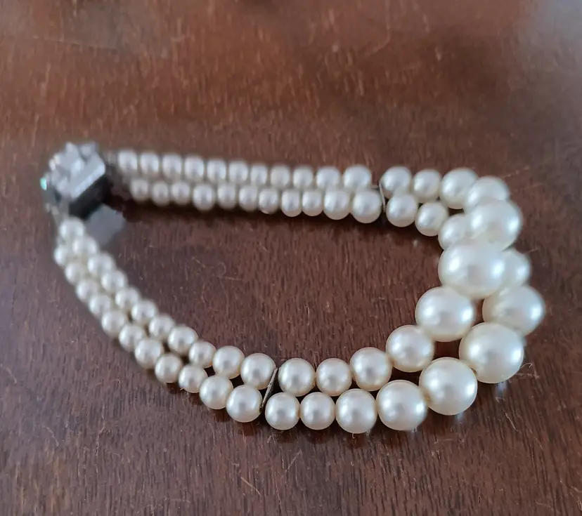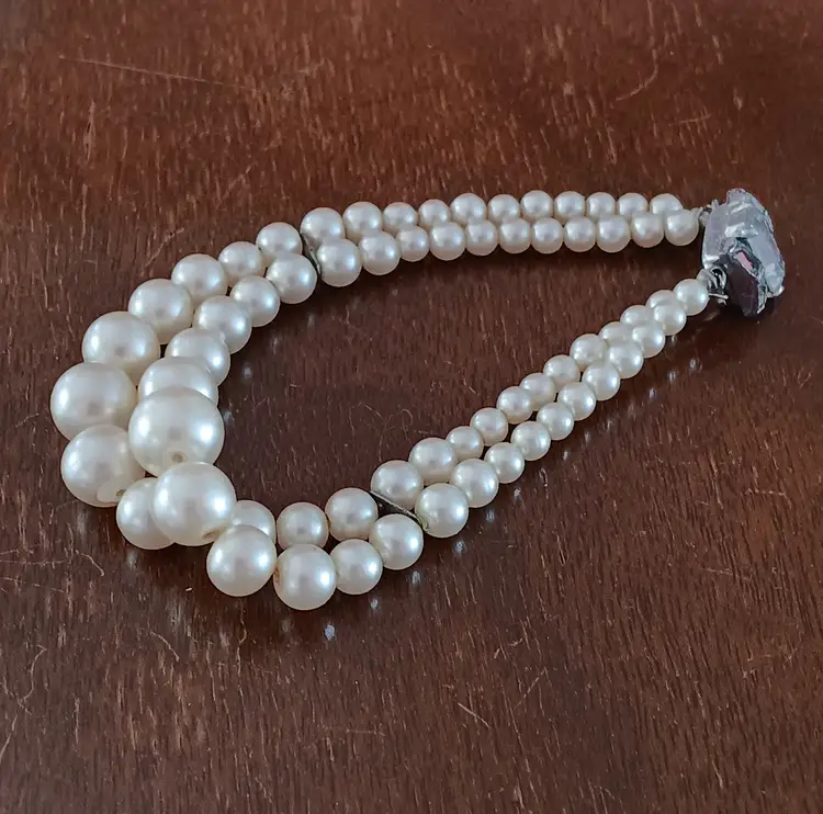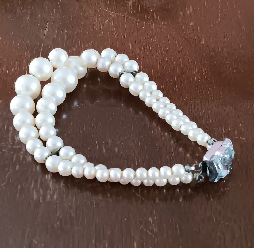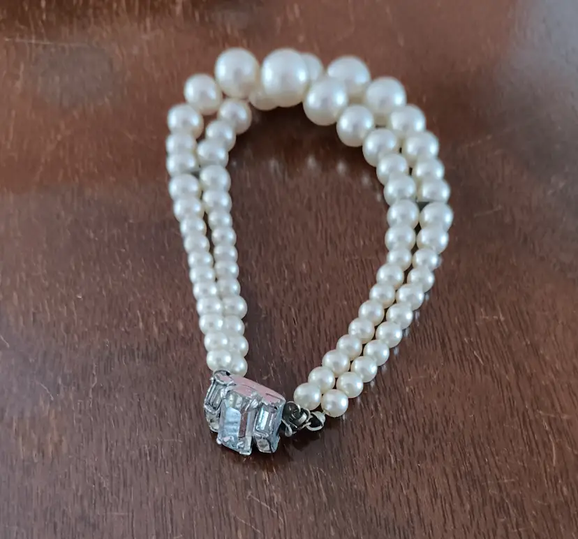 This vintage double-strand faux-pearl bracelet with a rhinestone clasp exudes a classic elegance reminiscent of the retro era. The ivory-colored beads and sparkling rhinestone clasp add a touch of sophistication to any outfit. Measuring 7 inches in length, this beaded bracelet is perfect for adding a vintage flair to your fashion ensemble.