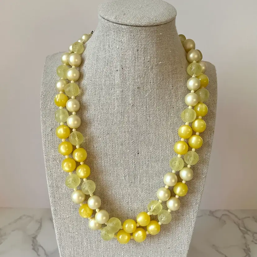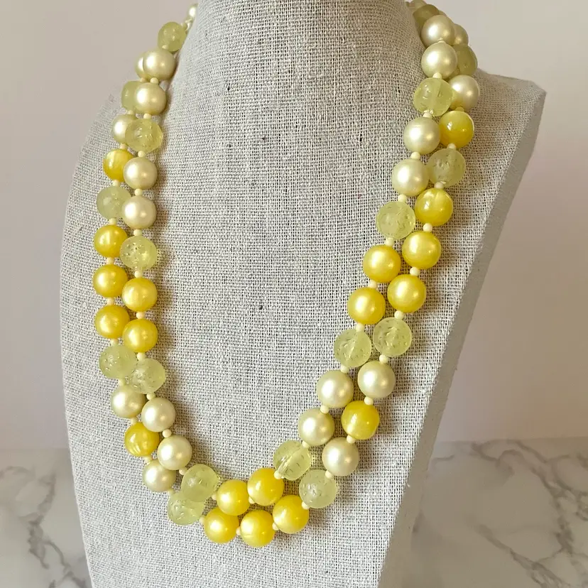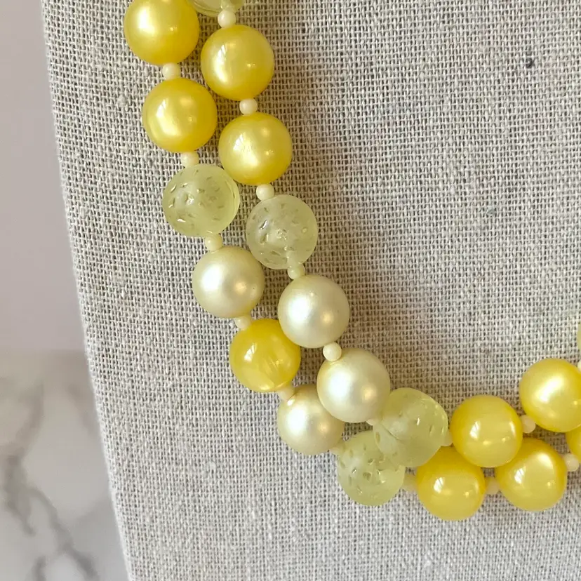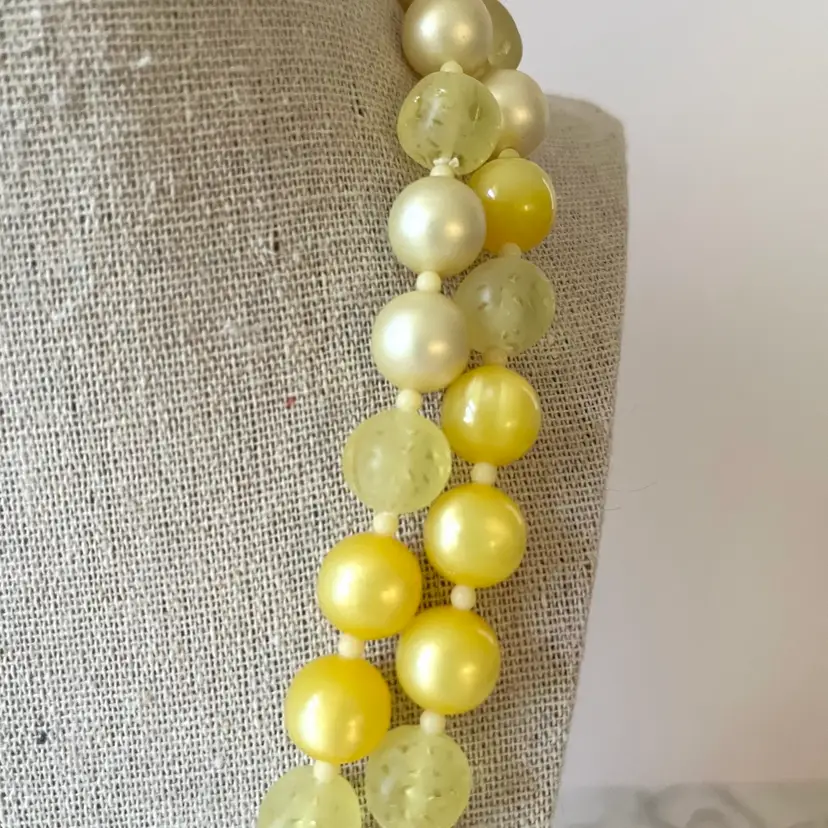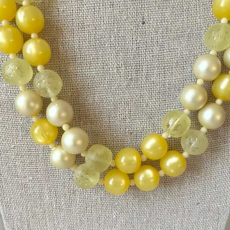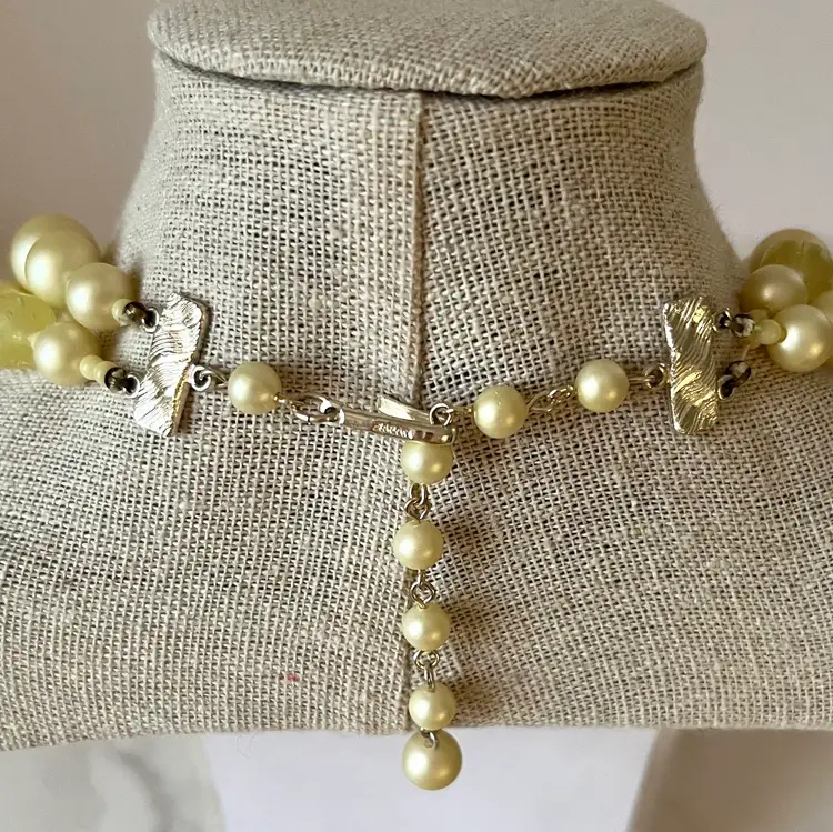 This necklace is in excellent condition. It is adjustable up to 20 inches and is signed on the hook closure. The beads are made from a substantial plastic.