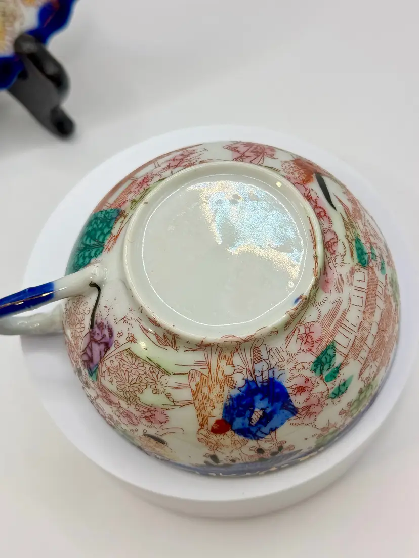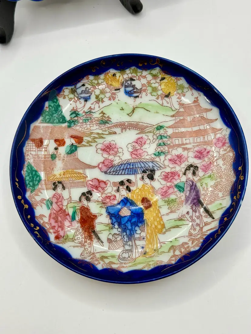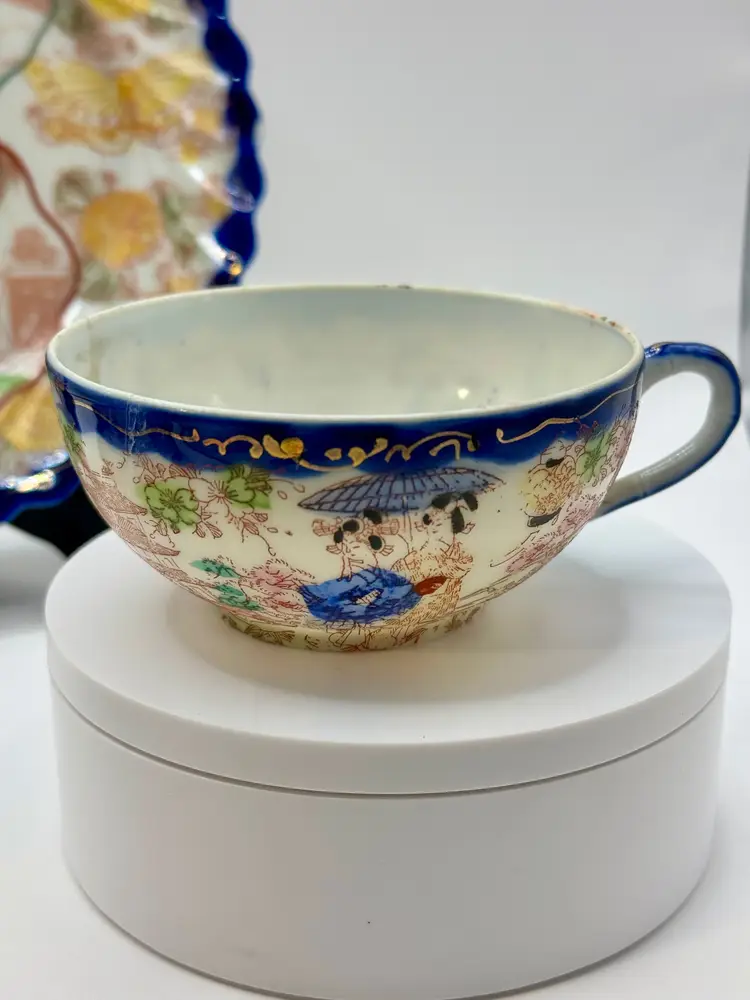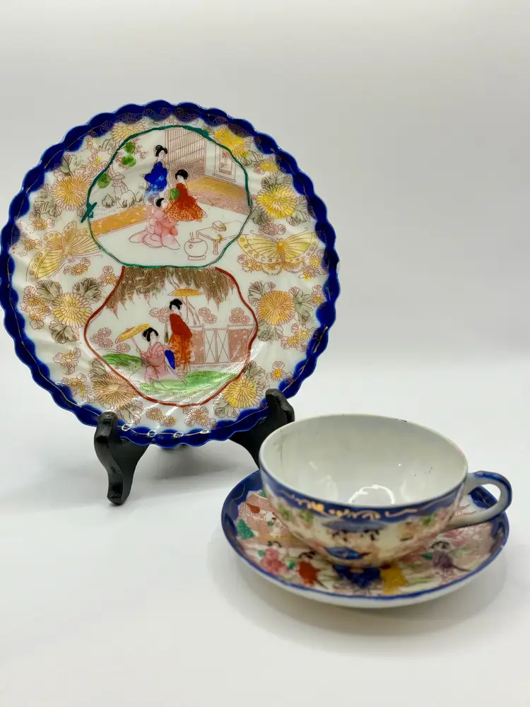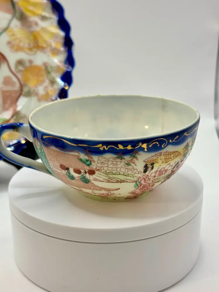 This vintage porcelain tea cup and saucer set, accompanied by a matching display plate, features a vibrant Asian-inspired design with cobalt blue trim and a colorful depiction of traditional scenes. Perfect for collectors or as a charming decor piece. No chips, one repair crack on cup (see pics). Measures cup 4.5x2x2, sauce 5.5”, plate 7.25”. Weighs total 1lb.