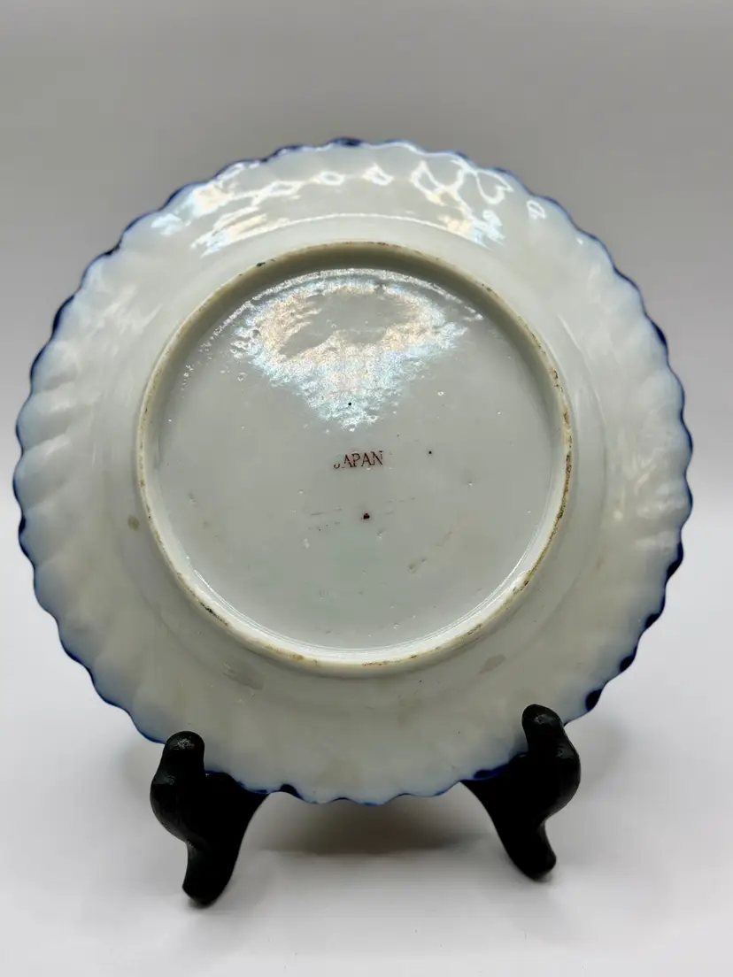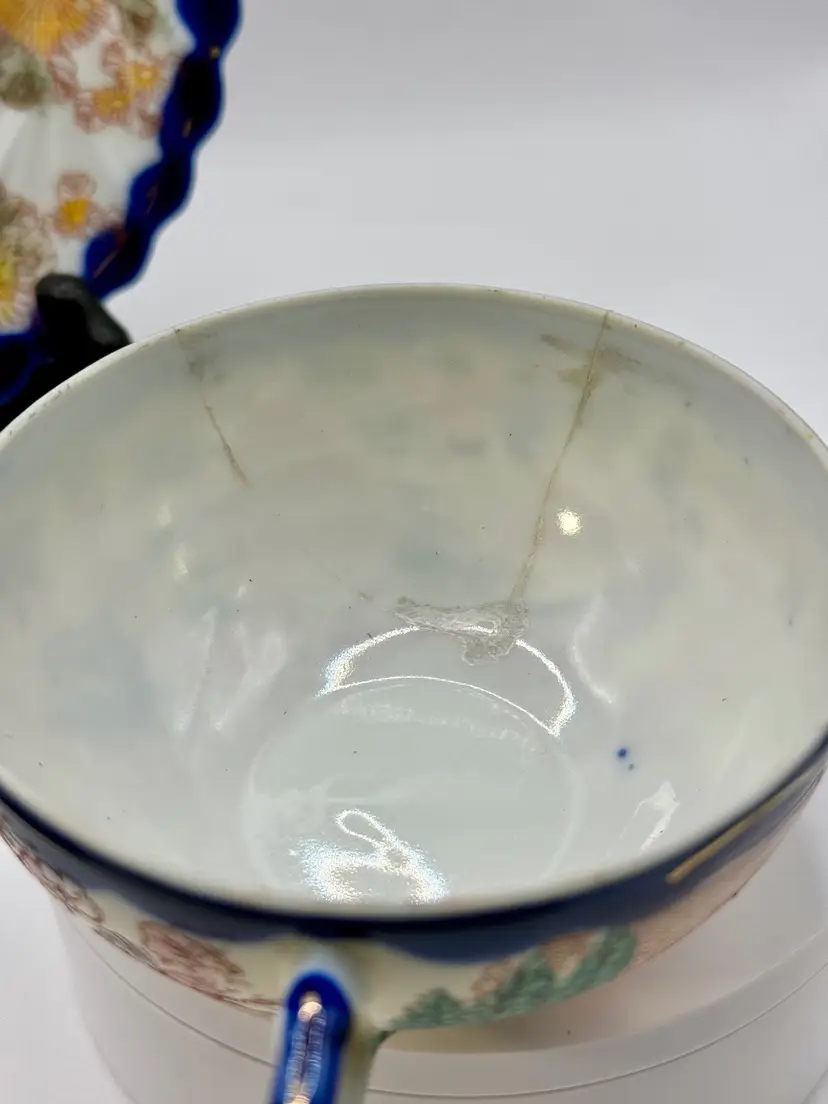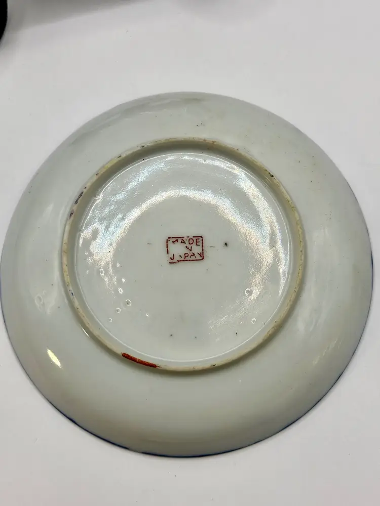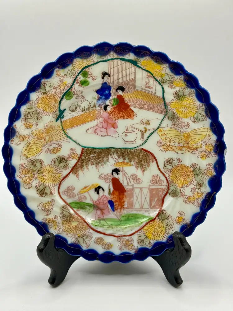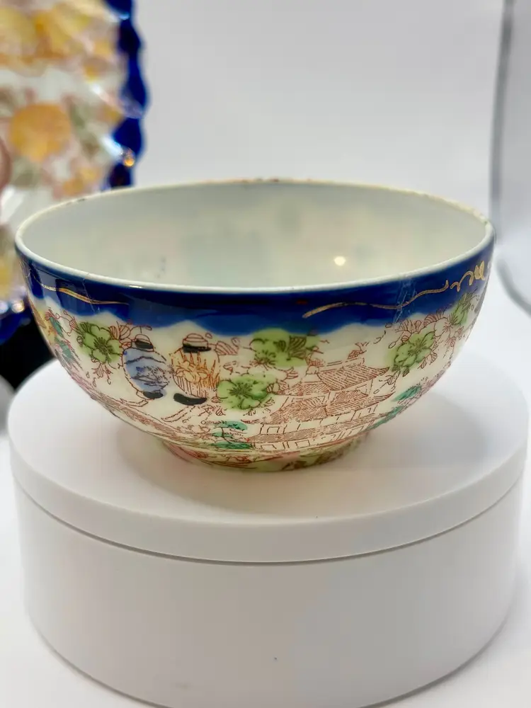 This vintage porcelain tea cup and saucer set, accompanied by a matching display plate, features a vibrant Asian-inspired design with cobalt blue trim and a colorful depiction of traditional scenes. Perfect for collectors or as a charming decor piece. No chips, one repair crack on cup (see pics). Measures cup 4.5x2x2, sauce 5.5”, plate 7.25”. Weighs total 1lb.