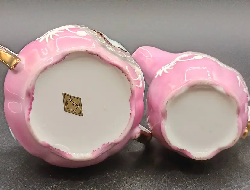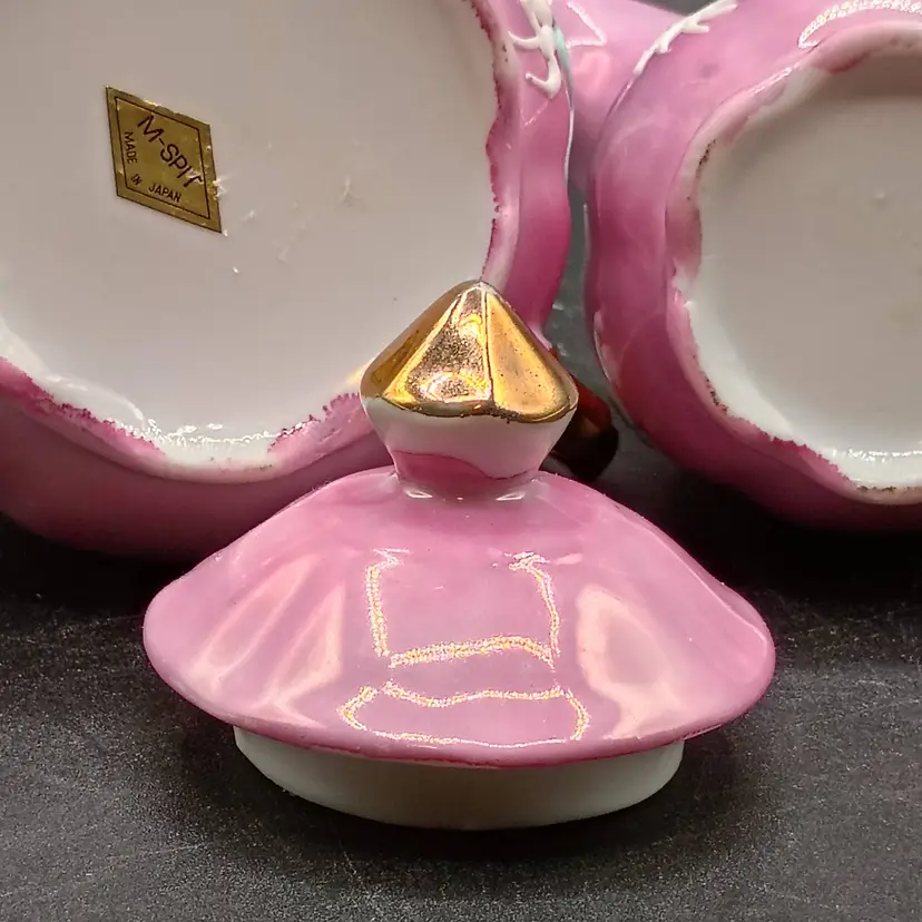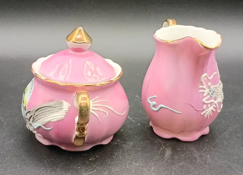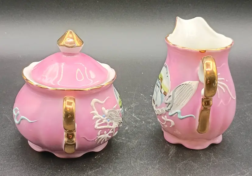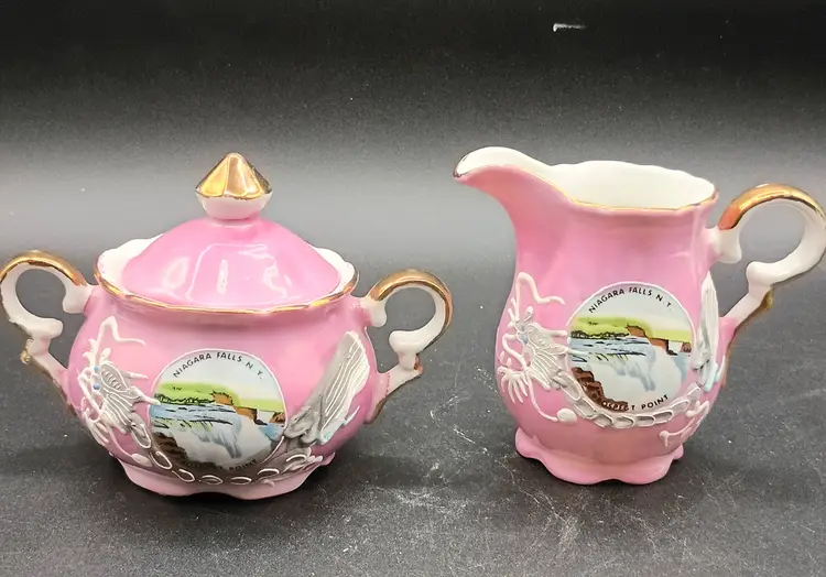 The Vintage Dragonware Moriage Creamer and Sugar Bowl with Lid from M-Spit is a unique and collectible piece that features a pink color with a glazed finish. Made in Japan, this original creamer and sugar set showcases intricate designs depicting Niagara Falls.
