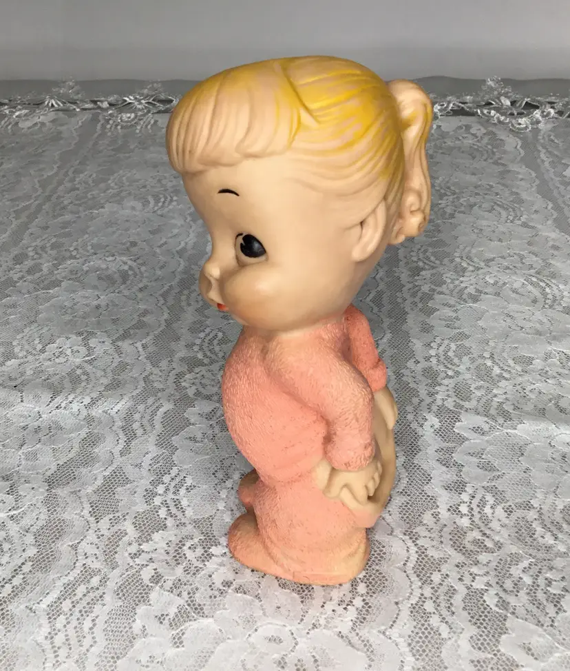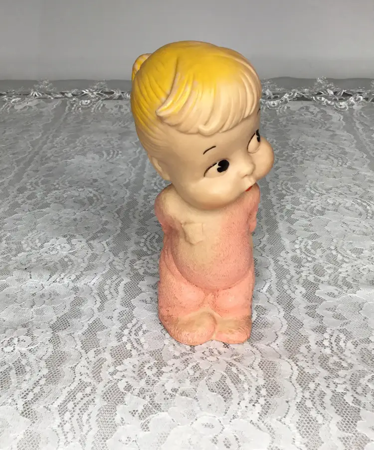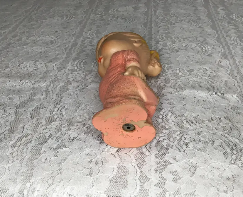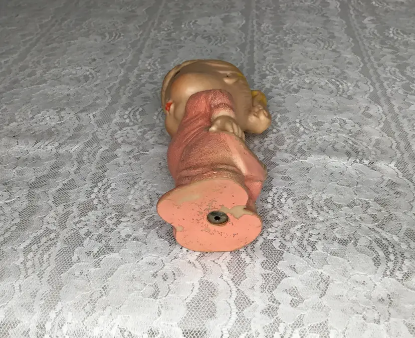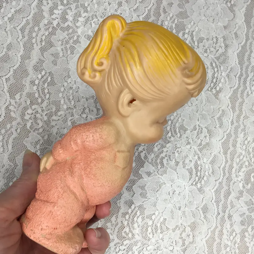 This is for the cutest vintage Dreamland 1956 rubber squeak doll. She has blonde hair in a ponytail, pink pajamas with the backside showing her bare bottom. Makes a squeak when squeezed.