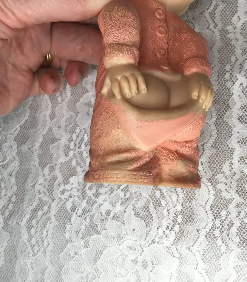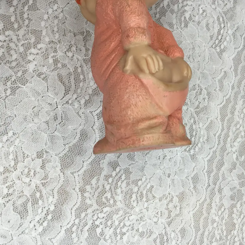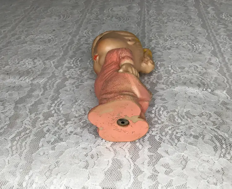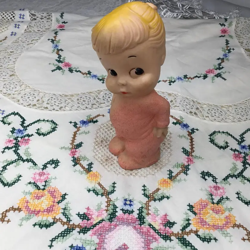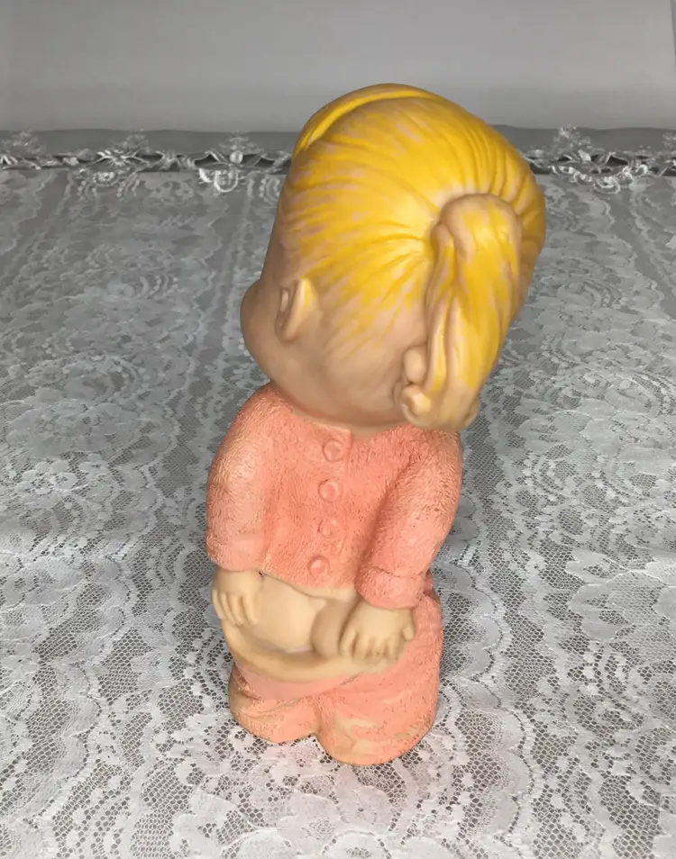 This is for the cutest vintage Dreamland 1956 rubber squeak doll. She has blonde hair in a ponytail, pink pajamas with the backside showing her bare bottom. Makes a squeak when squeezed.