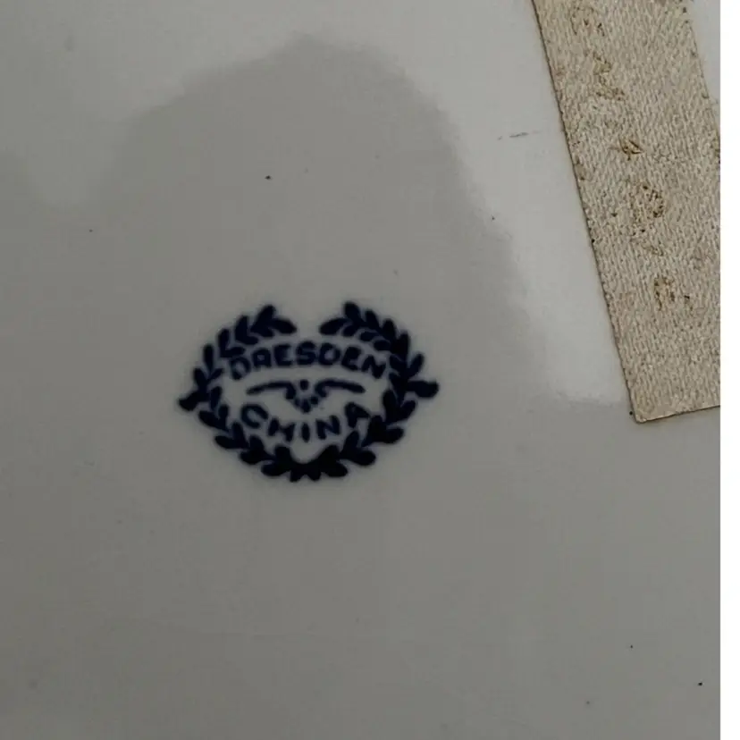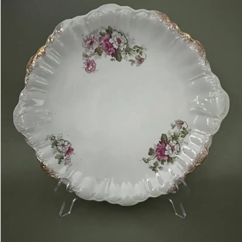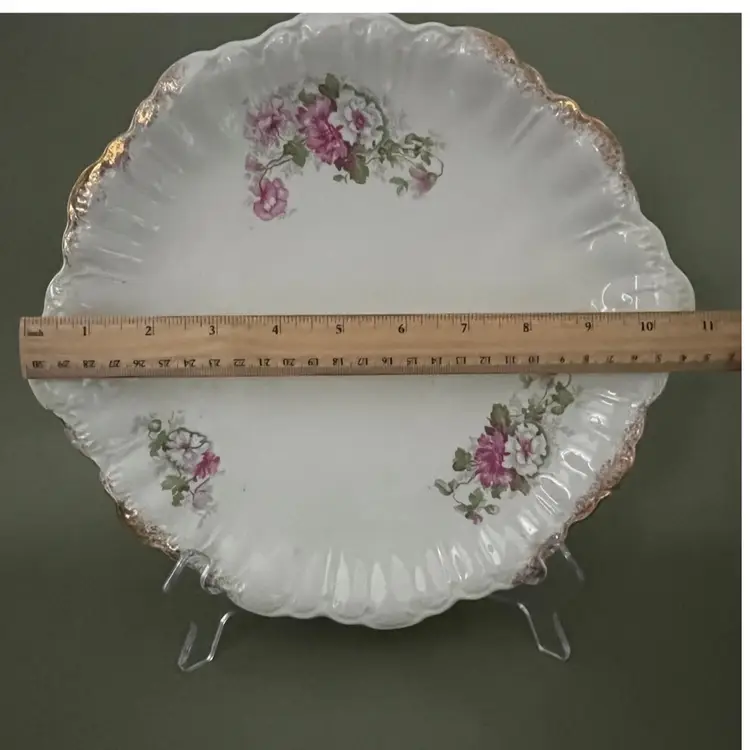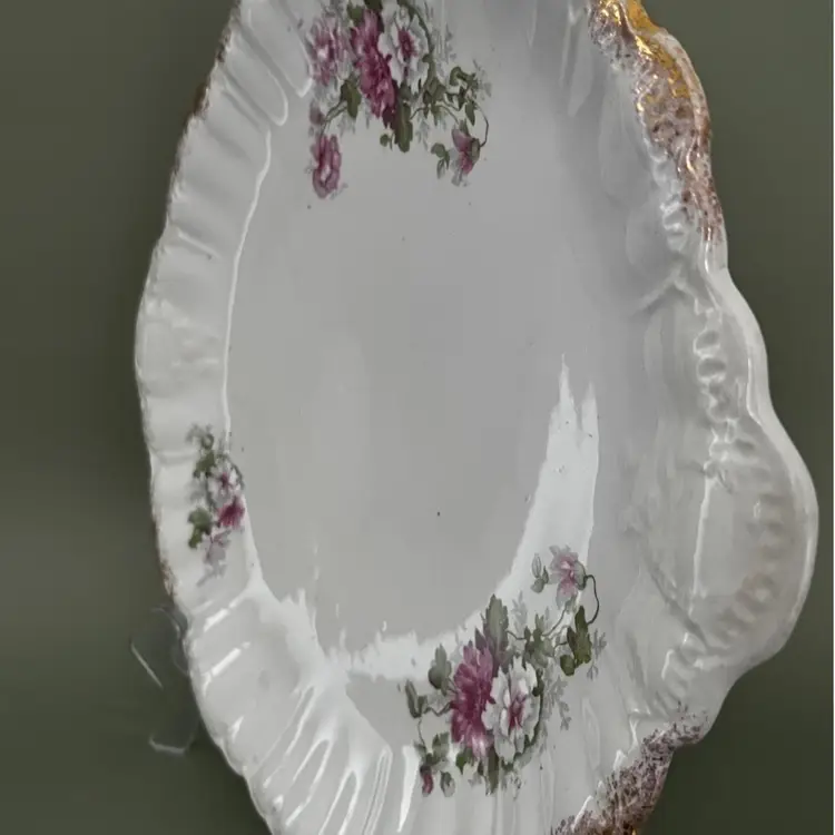 The product is a Vintage 10” Dresden Serving Plate with a beautiful floral design and gold trim. Made of delicate porcelain, this decorative plate features intricate detailing and a classic floral pattern that adds a touch of elegance to any room. As a collector's item or a unique piece to display in your home, this Dresden Plate is sure to be a stunning addition to your pottery and glass collection.