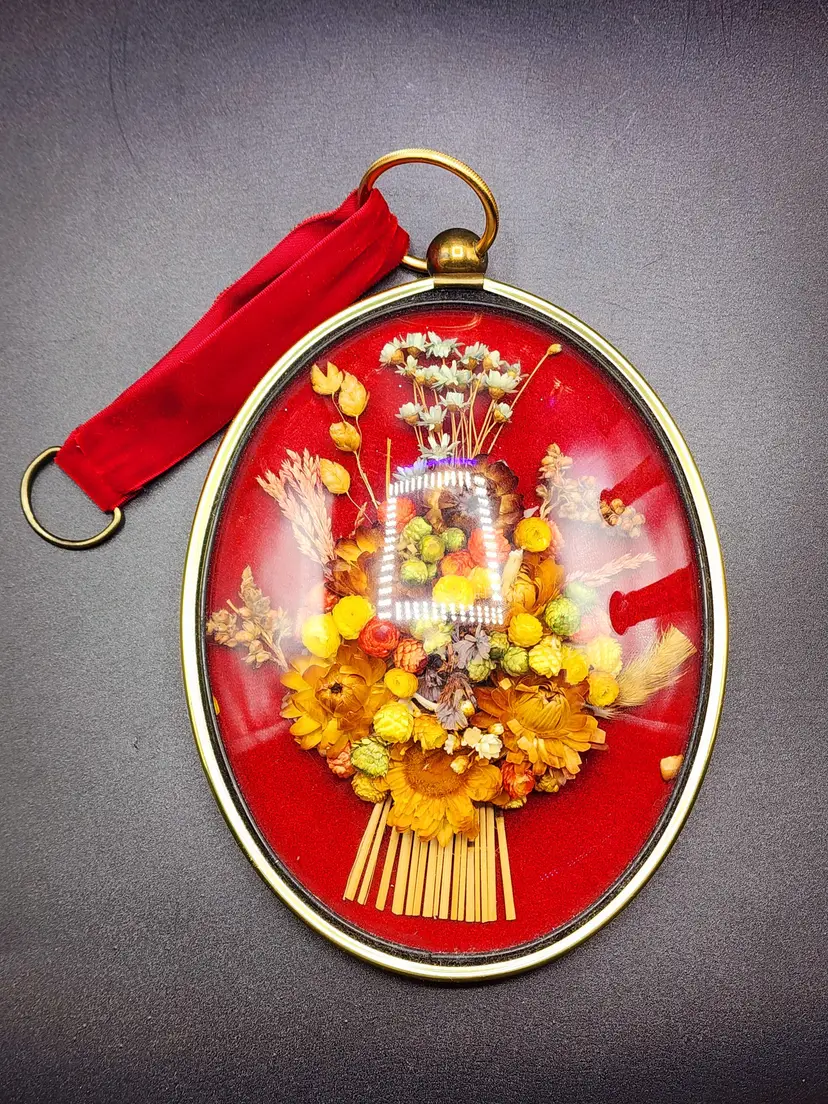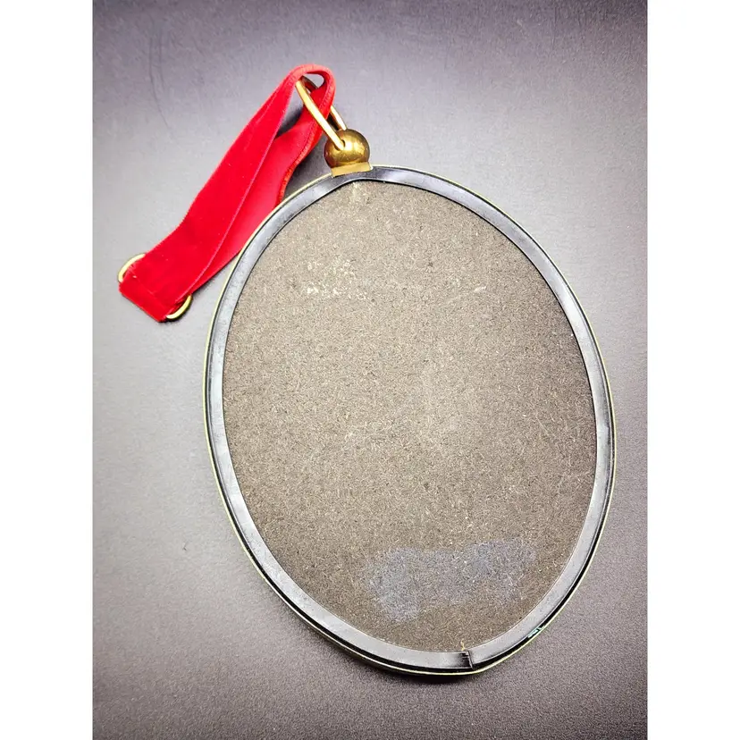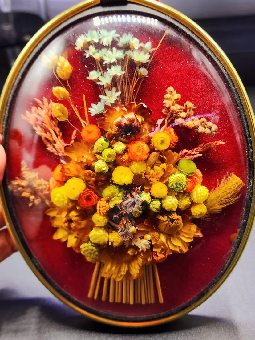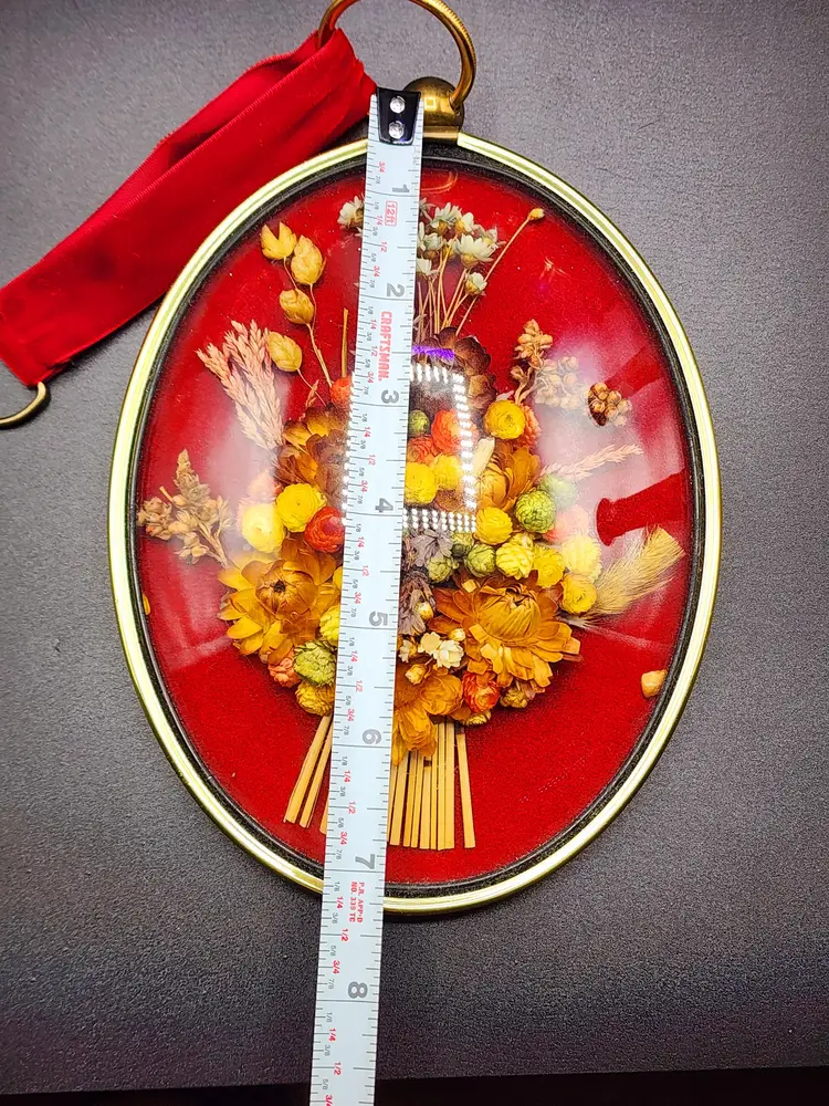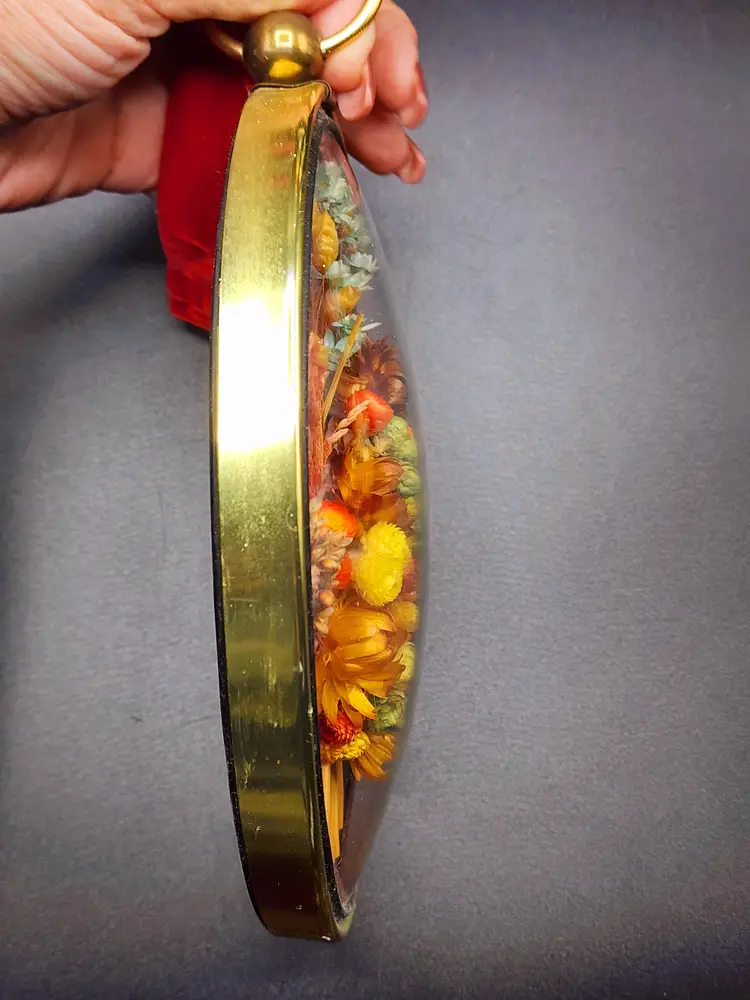 Vintage Dried Flowers Concave Glass Wall Plaque Decor - brass ring with velvet ribbon for hanging. Made in Belgium. Condition: very good. Light scratches on the glass. Measurements: 7 1/4" long, 6" wide.