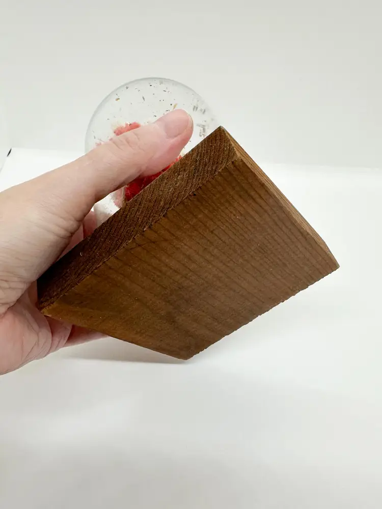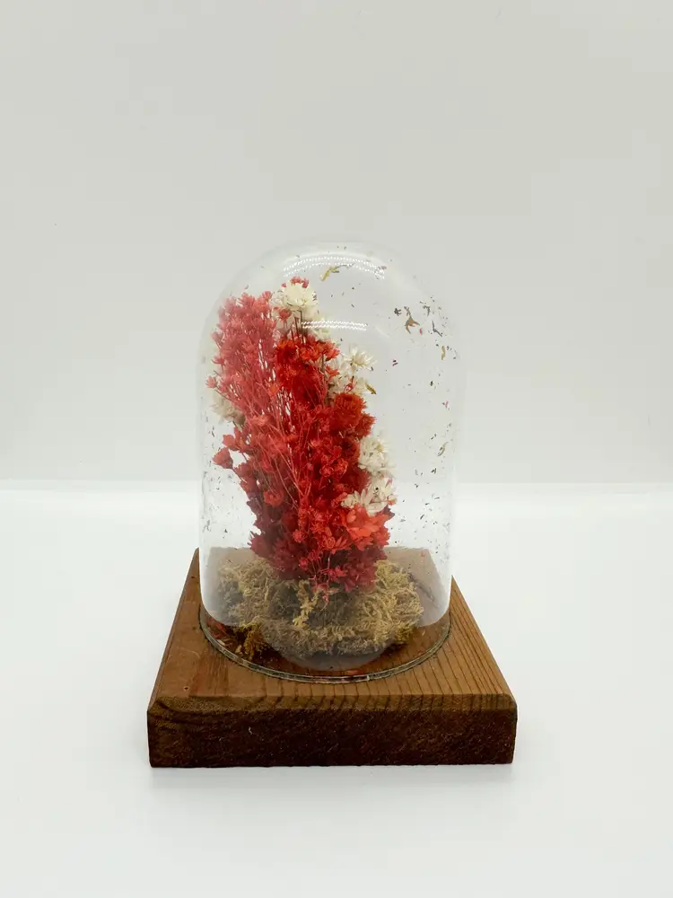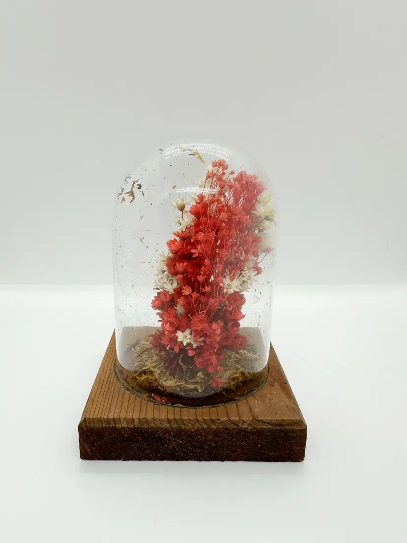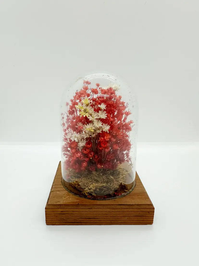 Vintage 1970s dried flowers in glass dome on wood base. About 5.5" tall x 3.5" base. No chips or cracks. There are loose pieces static clung to the glass.