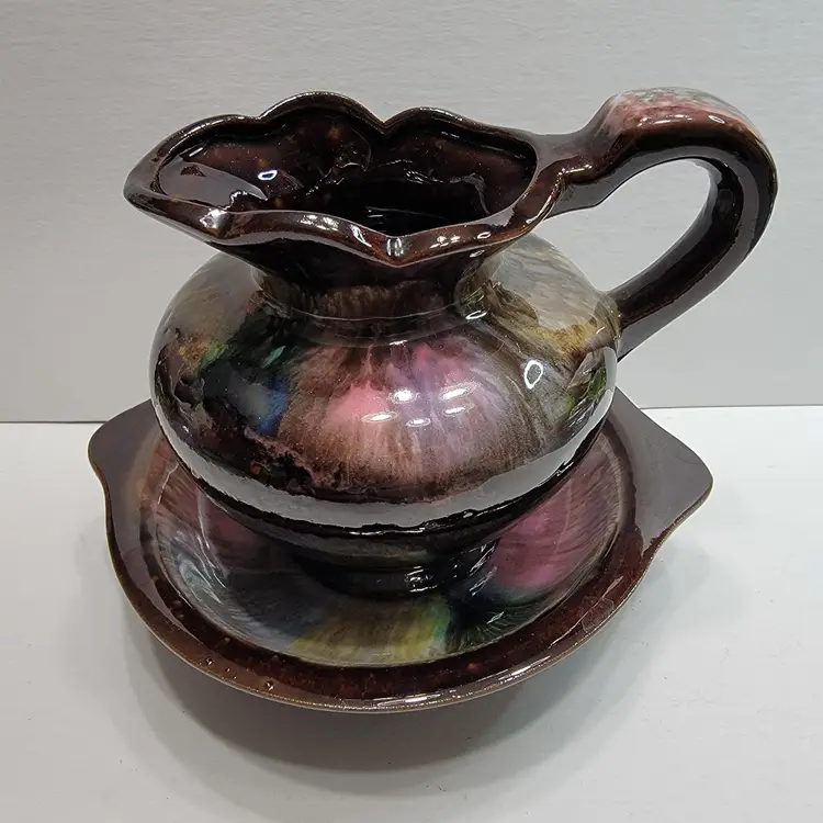 Charming vintage pottery pitcher and basin set featuring a unique drip glaze design. Perfect for adding a touch of rustic elegance to your home decor. Ideal for collectors or as a statement piece in any room.