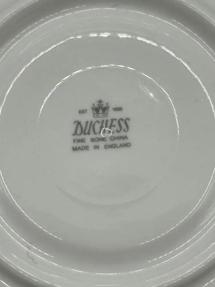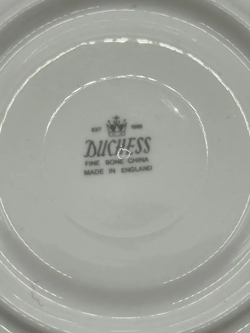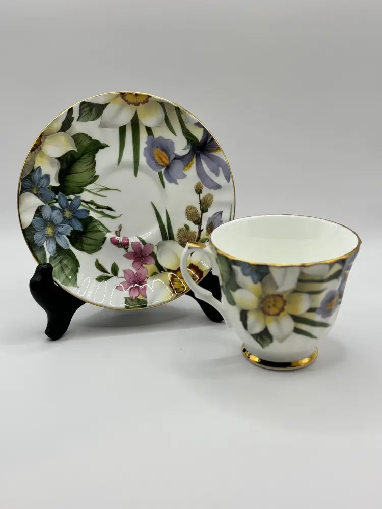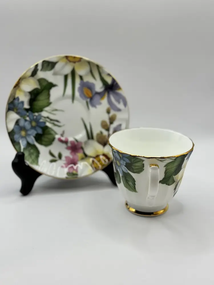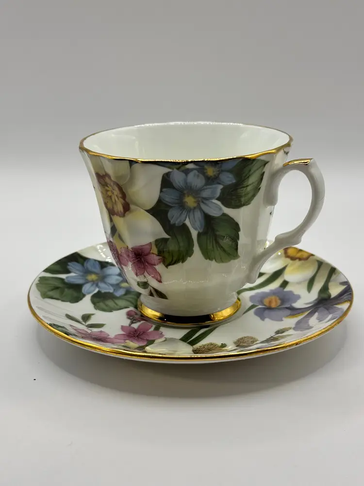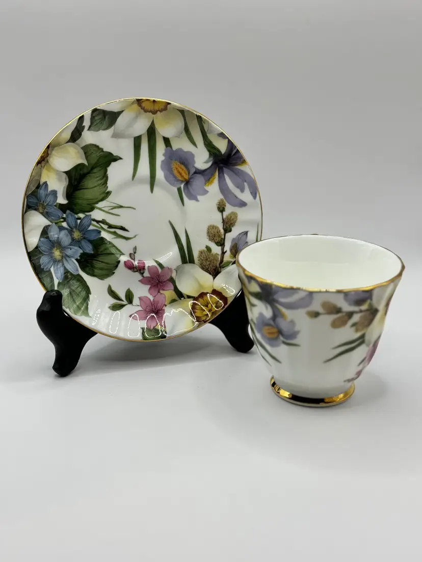 Sip in style with this vintage English fine bone china tea cup and matching saucer set, adorned with a charming botanical print and elegant gold trim. Perfect for tea lovers and collectors alike. No visible chips or cracks. Measures cup 4x3x1.75, saucer 5.25”. Weighs 1lb.