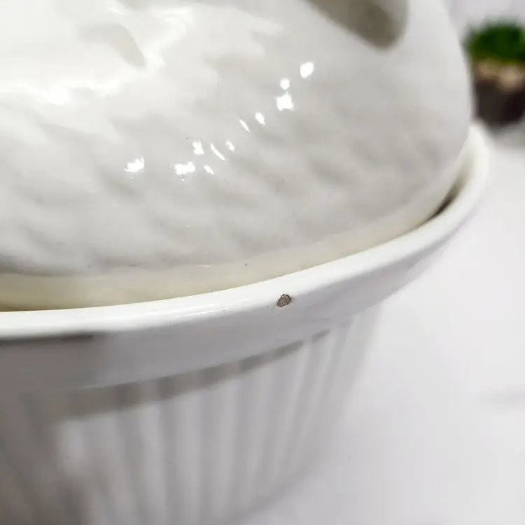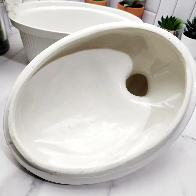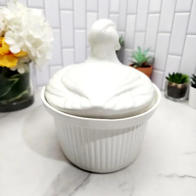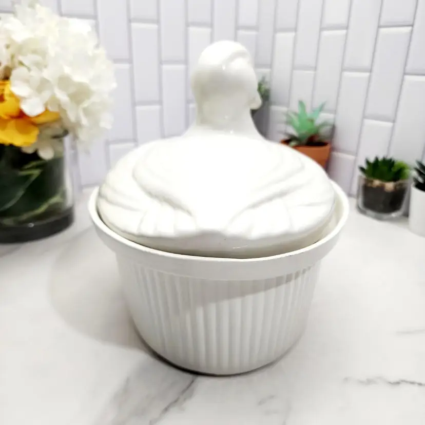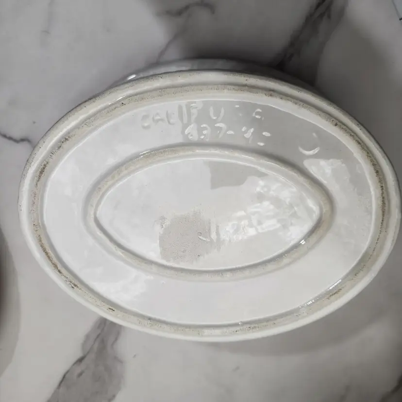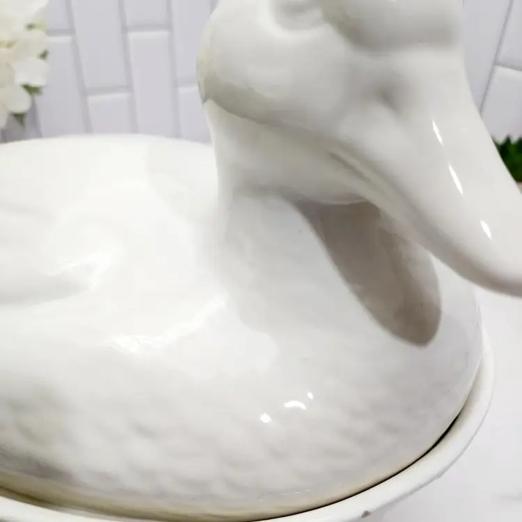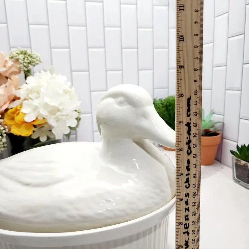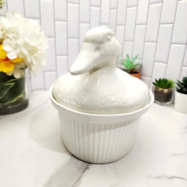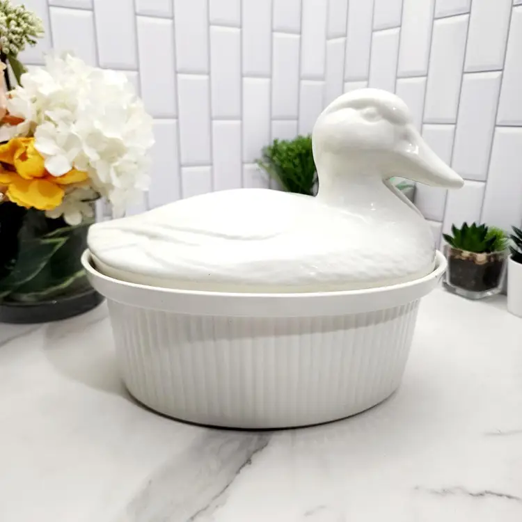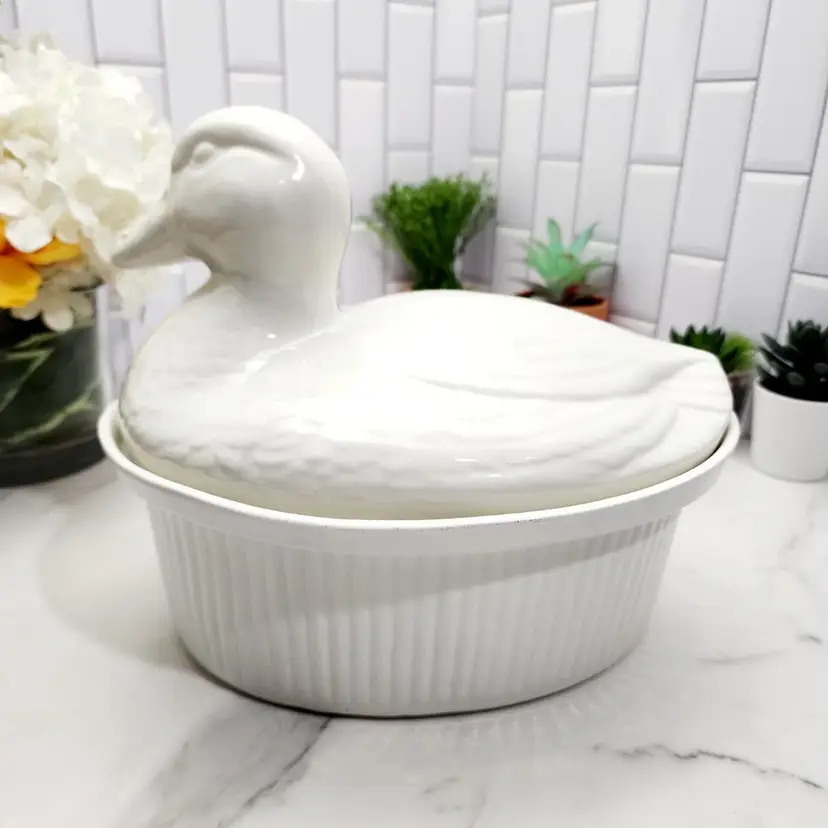 Farmhouse Charm. Earthenware that you can cook in and it looks amazing on display. The details on this white duck come through (see pics) Made by California Pottery USA Condition: Pre-Owned, good. 1 small chip on casserole dish (see pic). Measurements are approx: Base: 10.5" L x 8" Wide Oval and 4.75: Tall. With Duck Lid the item is 8.5" Tall.