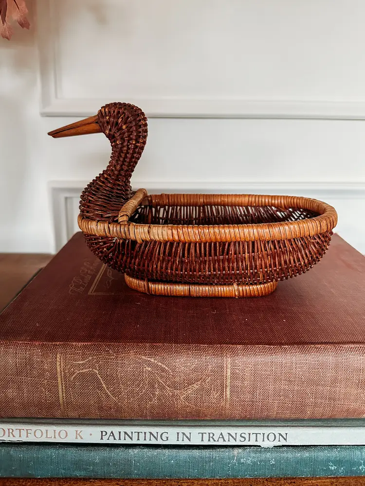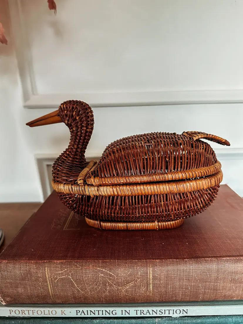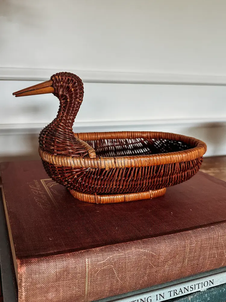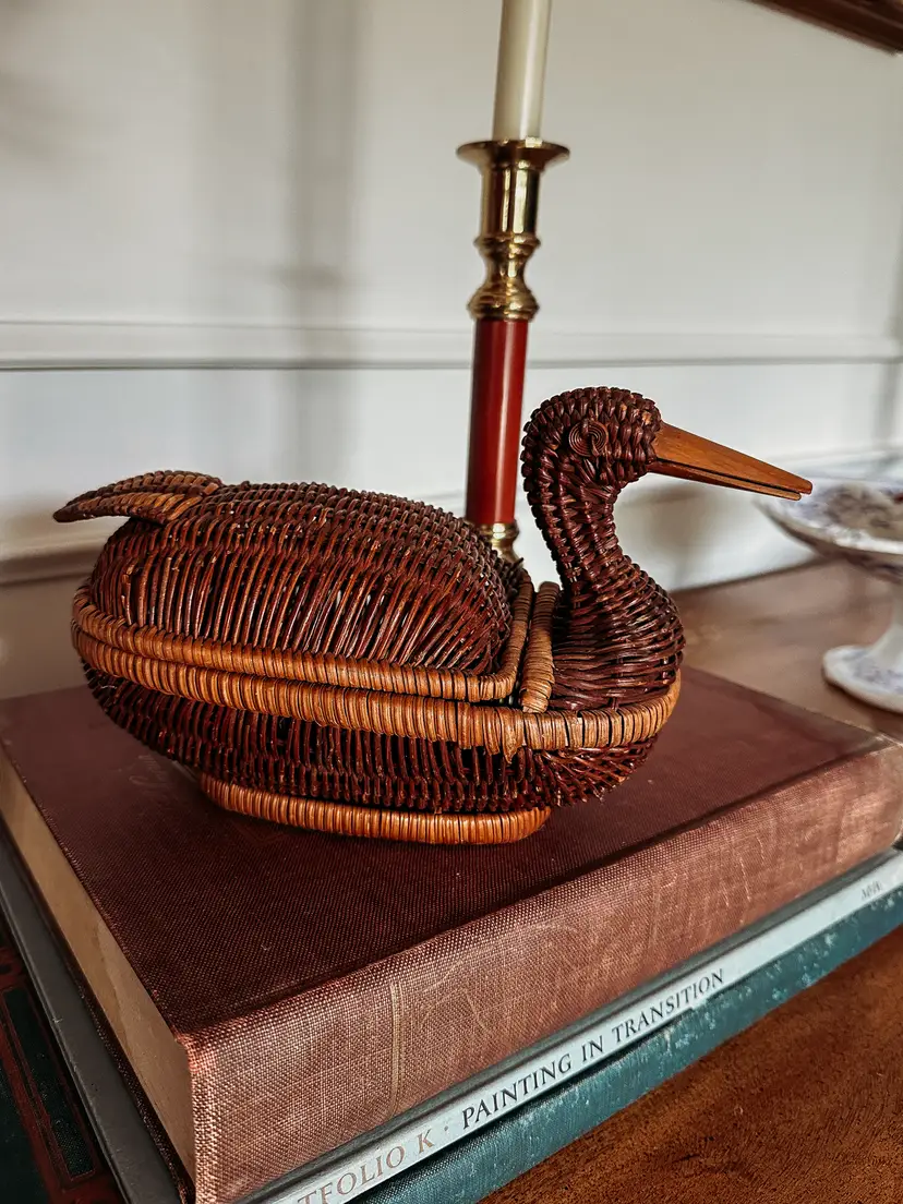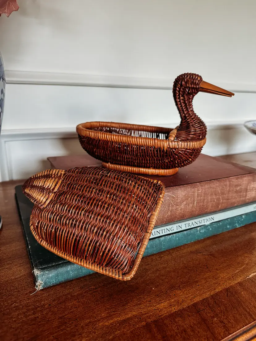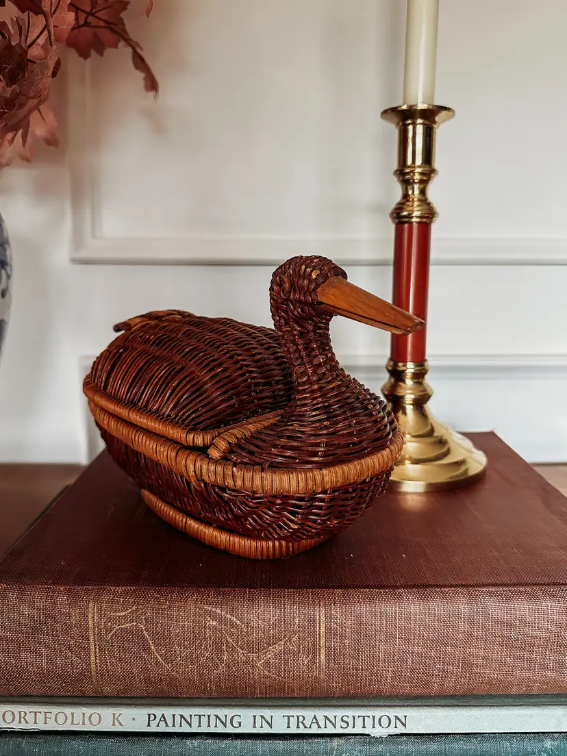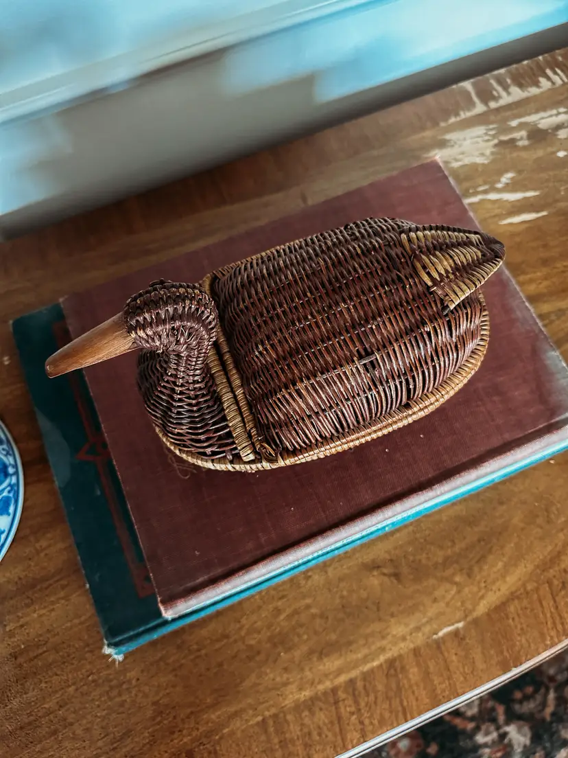 Adorable wicker/rattan duck with wooden beak. The back is removable for storage! It's giving country cottage vibes and it's in great vintage condition. Some loose weaving but still in great shape. Missing one eye. Many ducks like this being sold no longer have their tail and this one is fully secured! Measures 9" length x 5" width x 6" height