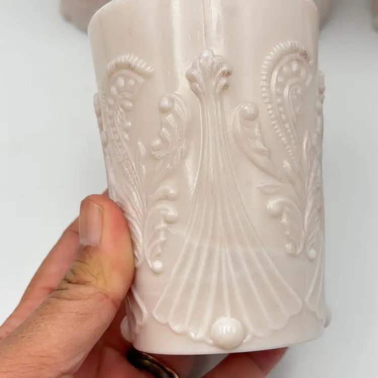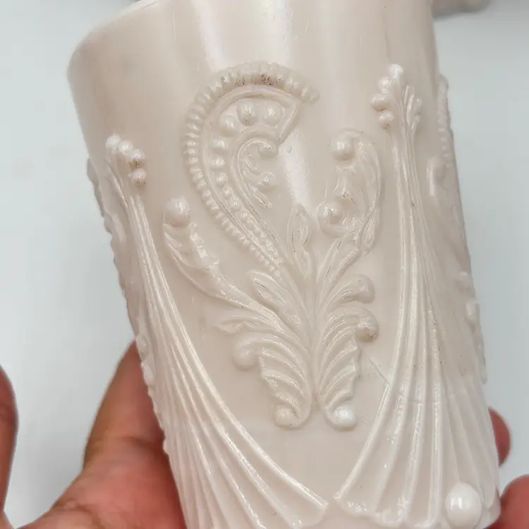 Maker: Dugan Glass Company Era: Early 1900s (c. 1905–1915) Material: Pressed glass The color: Peach opalescent / ivory opal or very light shade of rose pink custard. Not really sure how else to describe the color. DOES NOT GLOW. Pattern: Ornate scroll, foliate, and bead motif; Inverted Fan And Feather Style: Victorian / Edwardian Condition: Very good antique condition with light age-related wear.