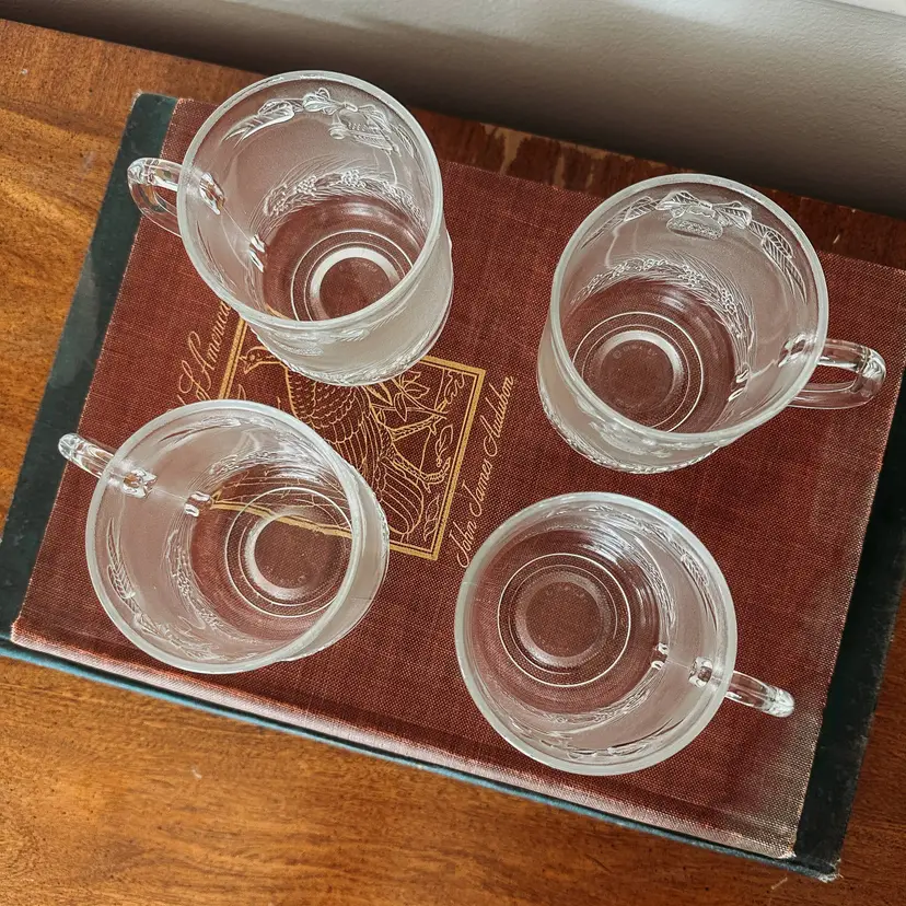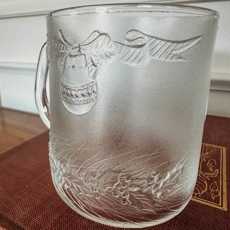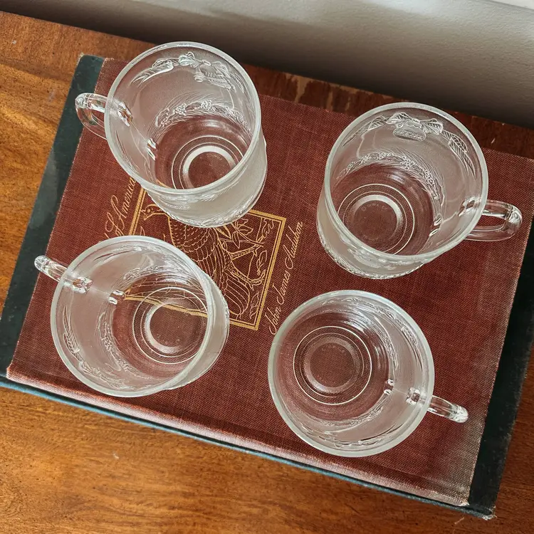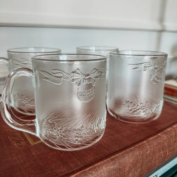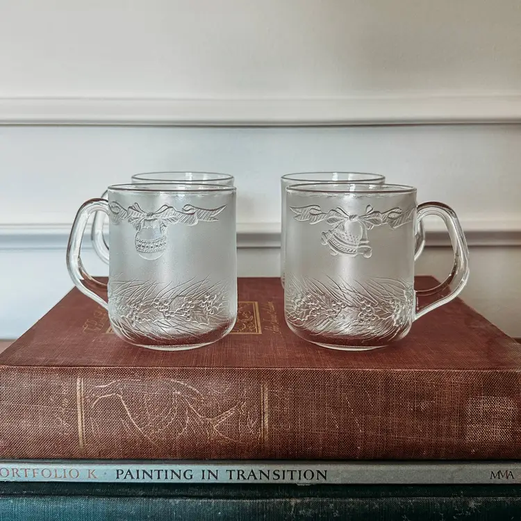 Beautiful vintage Duralex Christmas mugs featuring bells, ornaments, and garland. Set of 4. Perfect for eggnog, hot cocoa, holiday punch, or hot cider! No chips or cracks!