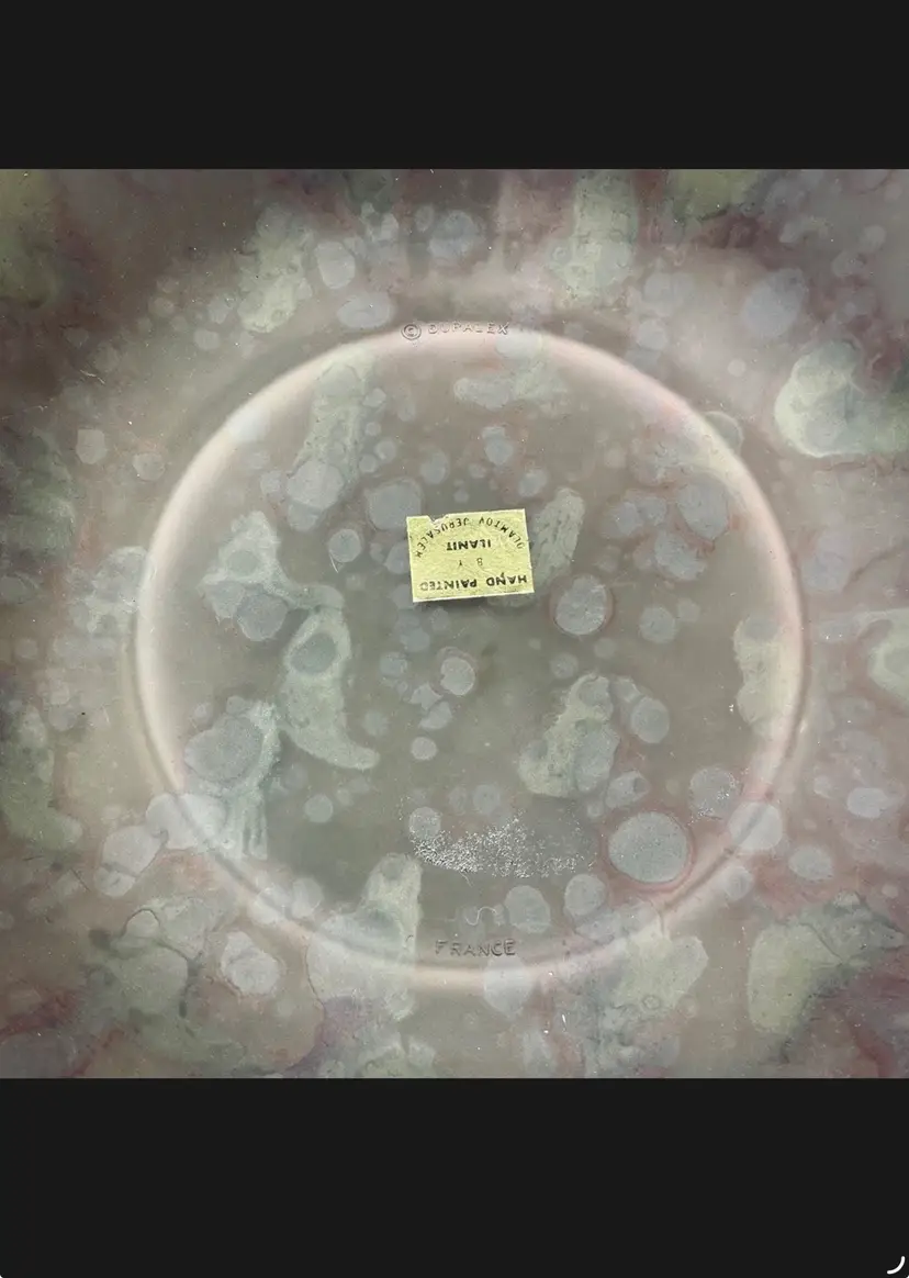 This beautiful vintage French art glass bowl features a soft pink mottled satin finish with opalescent tones. It retains its original foil sticker, reading “Hand Painted by Ilanit Olamtov – Jerusalem”, confirming authenticity and artistry. The underside is also marked “Durand – France.”