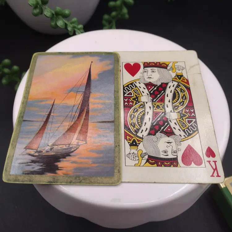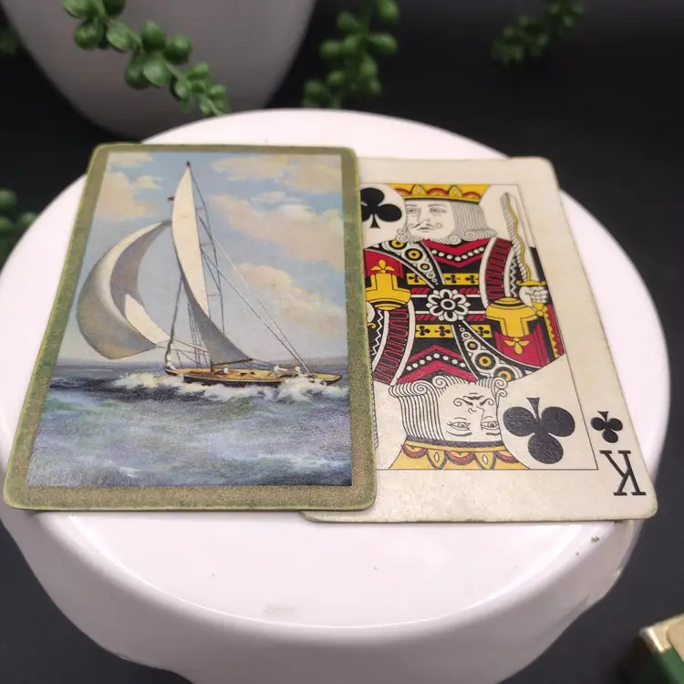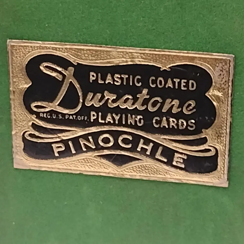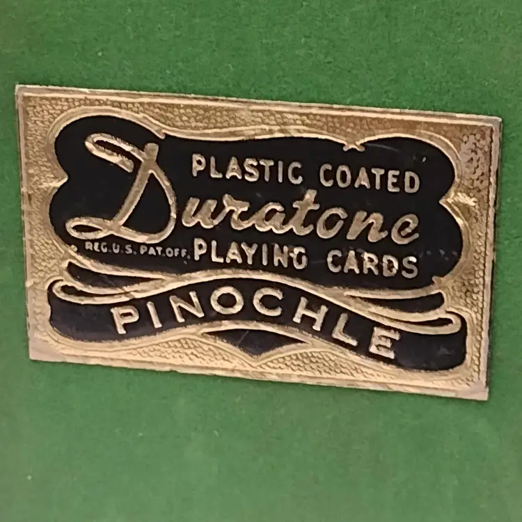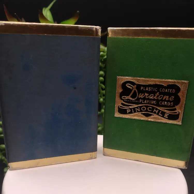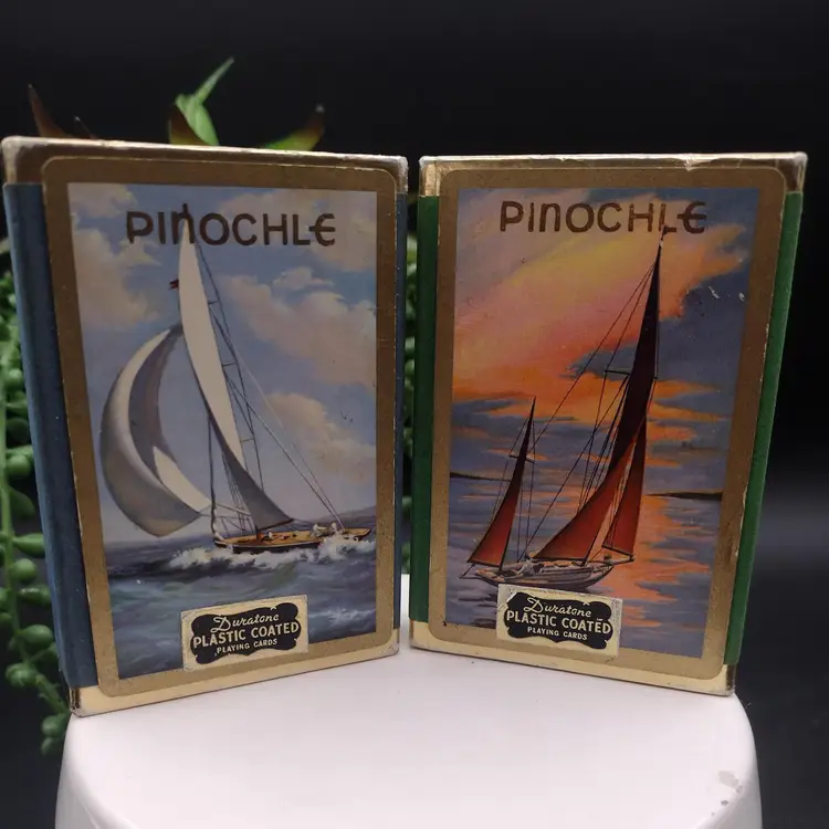 This vintage set of Duratone Pinochle decks features a nautical theme with sailboats and schooners depicted on the cards. Made in the United States, these decks are plastic coated and come in a flocked box for storage. Duratone were made by the Arrco Playing Card Company of Chicago. Boxes are green and blue flocked. All Cards are in the boxes. Boxes measure 3 1/4 x 2 1/2