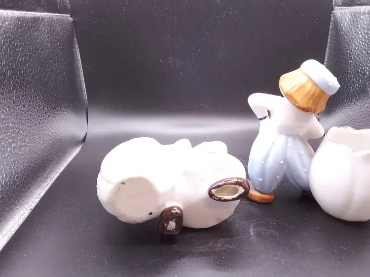 This product is a set of two vintage Dutch girl and boy vases or planters, which can also function as match toothpick holders. Made of porcelain with a multicolor glossy finish, these small figurines are ideal for any room and all occasions. Signed by the brand Supreme Quality T.M.J., the 1950s style figurines feature an all-over pattern and depict children as the subject, perfect for collectors or enthusiasts of decorative figurines. Unboxed and original in nature, these vases are a charming addition to any home decor. no chips or cracks