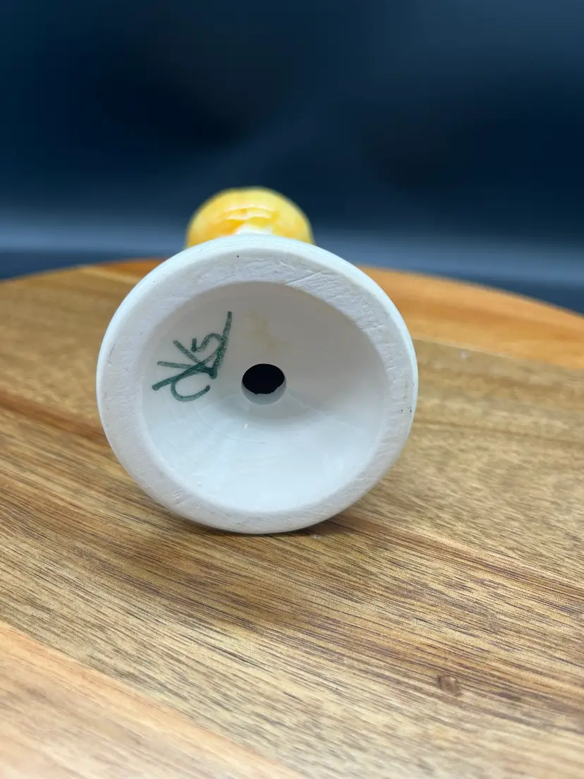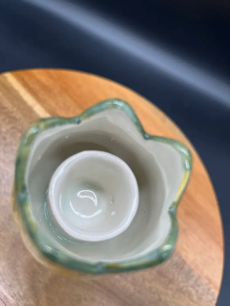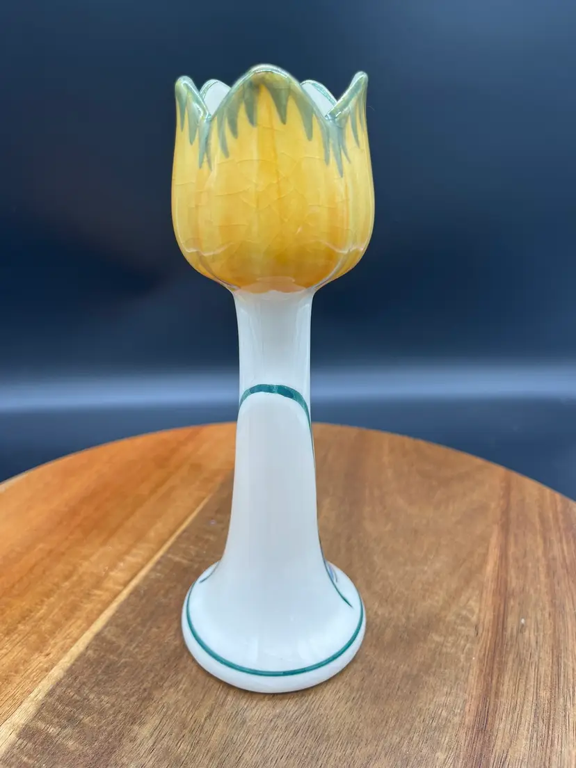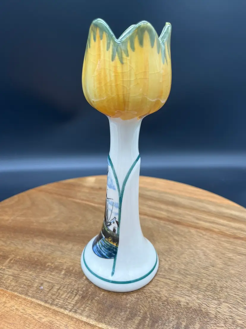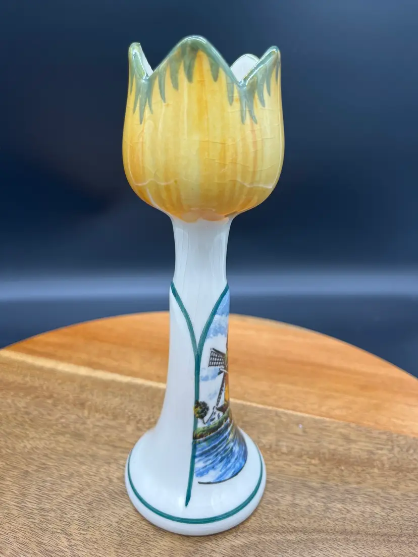 Vintage Dutch Yellow Tulip Handpainted Candlestick Holder - Windmill Scene Spring or Summer Decor Artist signed Delft-style, not Delft Great condition with glossy finish, no chips or cracks noted, very mild vertical crazing in stem. 7" tall, 2.5" wide