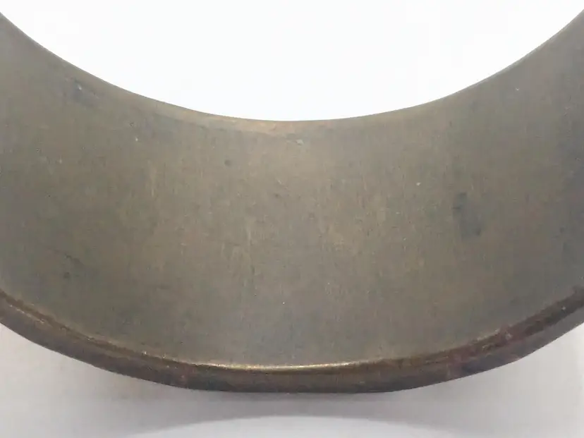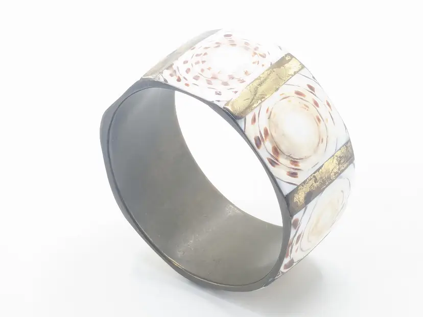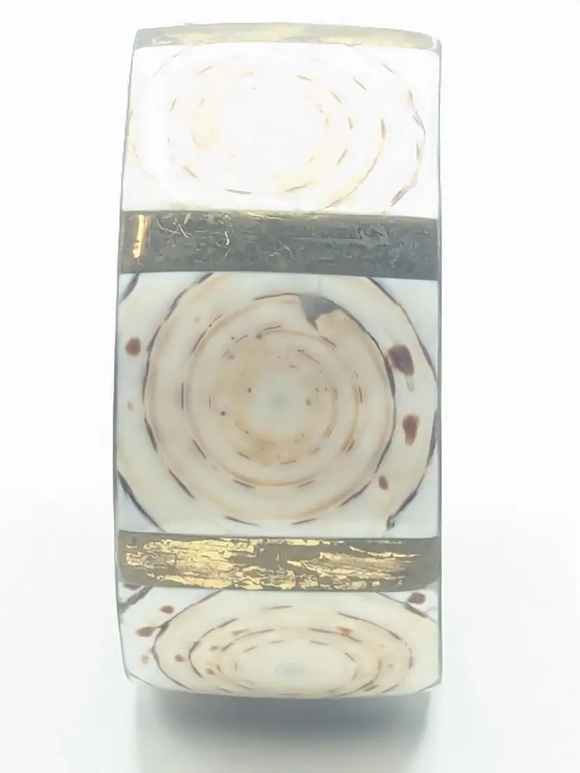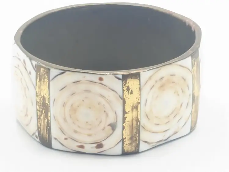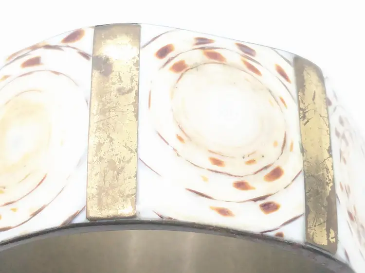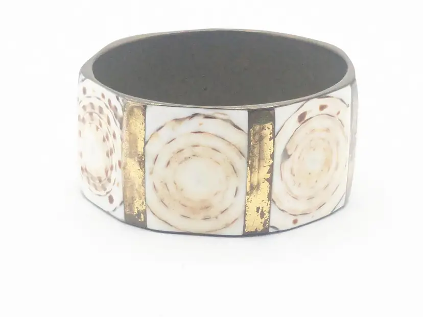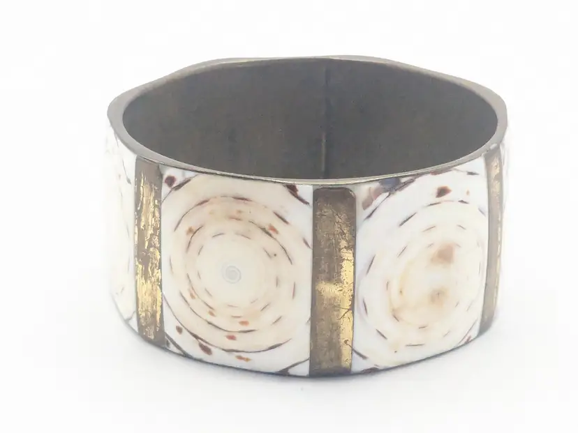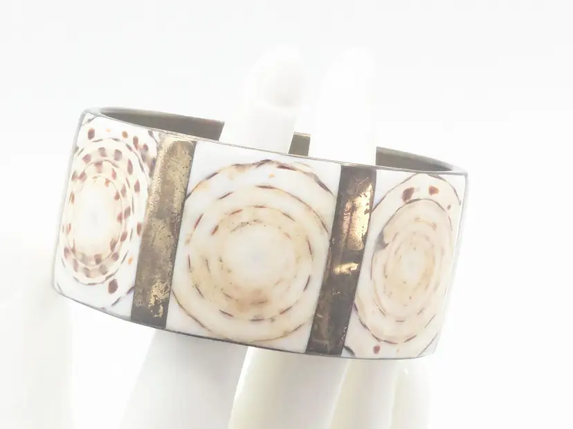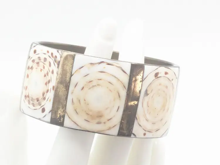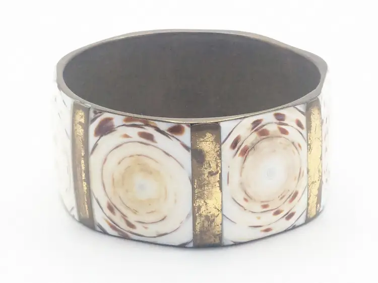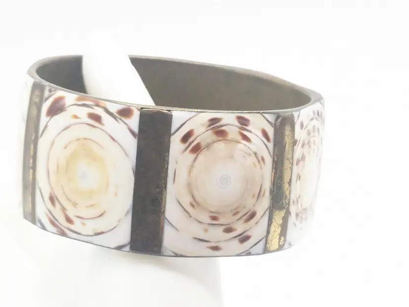 Good condition with some distress on the exterior brass bands of bracelet. Features dyed bone with unique spiral patterns with brass accents. Cream, brown and beige. Measures 8 1/4". EN2