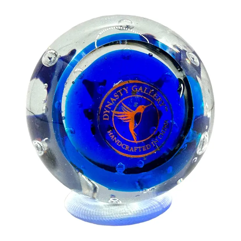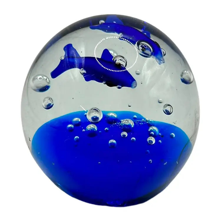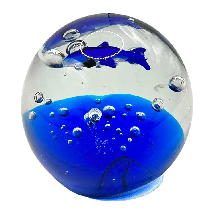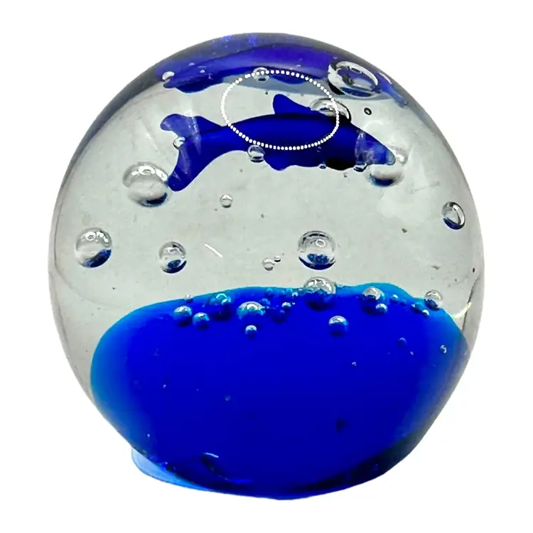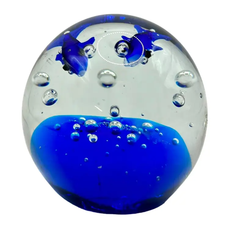 This vintage blue glass paperweight features a charming fish design, perfect for adding a touch of whimsy to your desk or shelf. The intricate details and vibrant blue color make it a standout piece. In excellent condition with no chips or cracks. Measures approximately 2.5" inches in diameter.