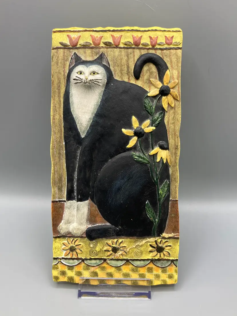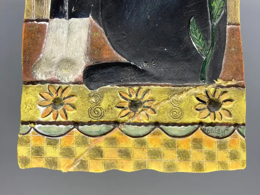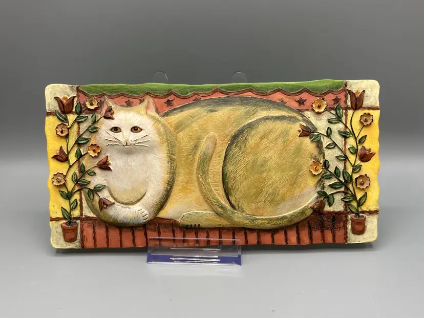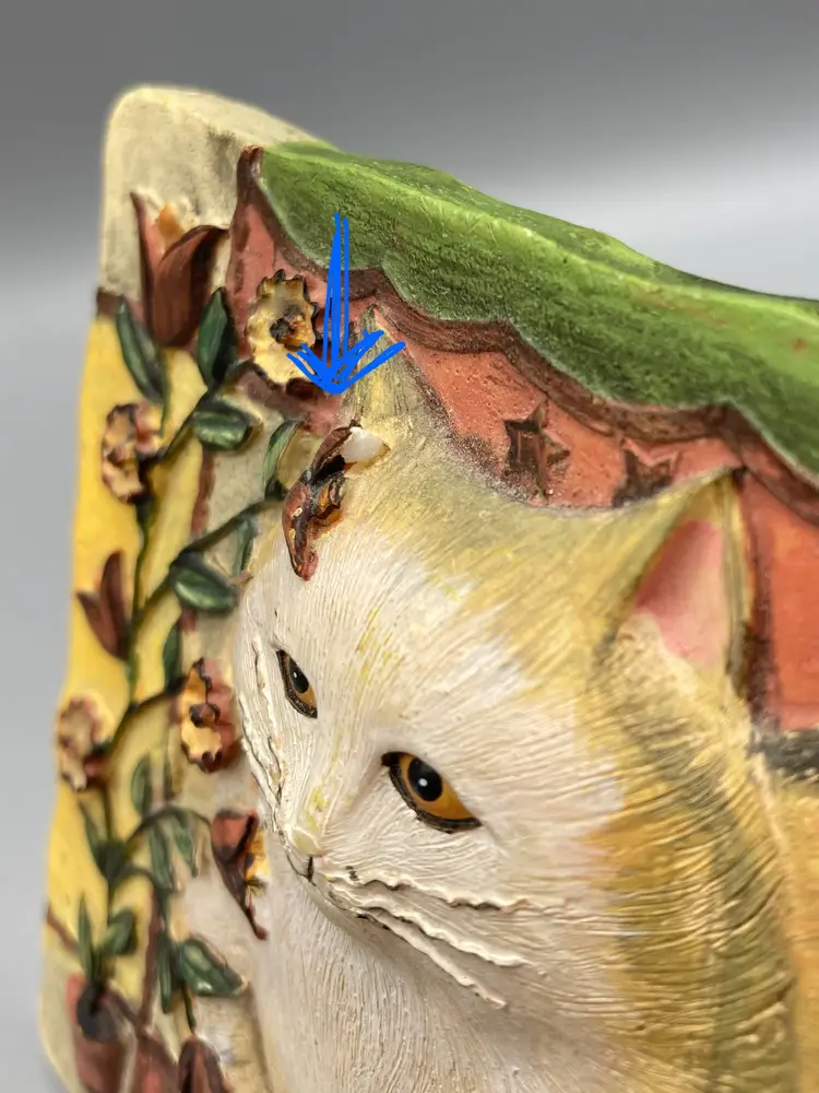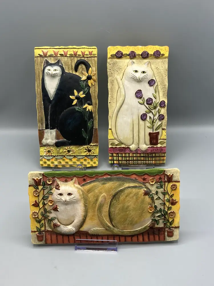 The two vertical plaques have been repaired, please see pictures for specific details. The third plaque has a few small flea bites on it, one on a flower and one on the cat's ear, neither of which are very noticeable. The two vertical cat plaques measure approximately 8 1/4" tall x 4". And the horizontal cat plaque measures approximately 4" tall x 8 1/2".