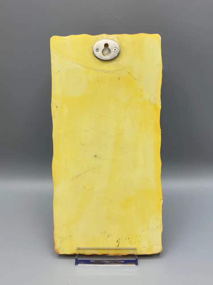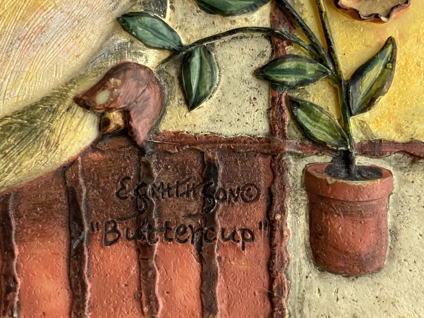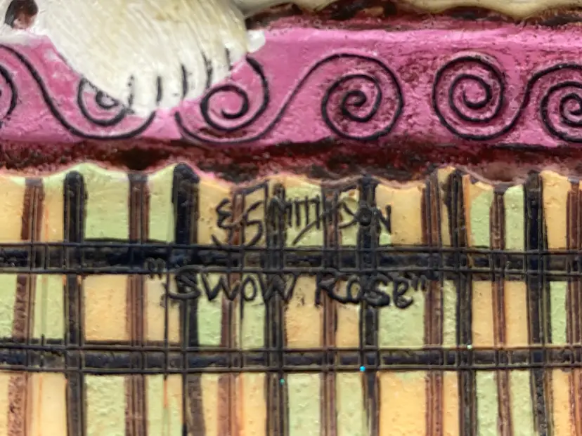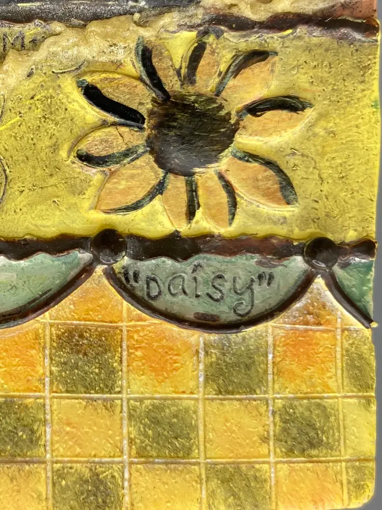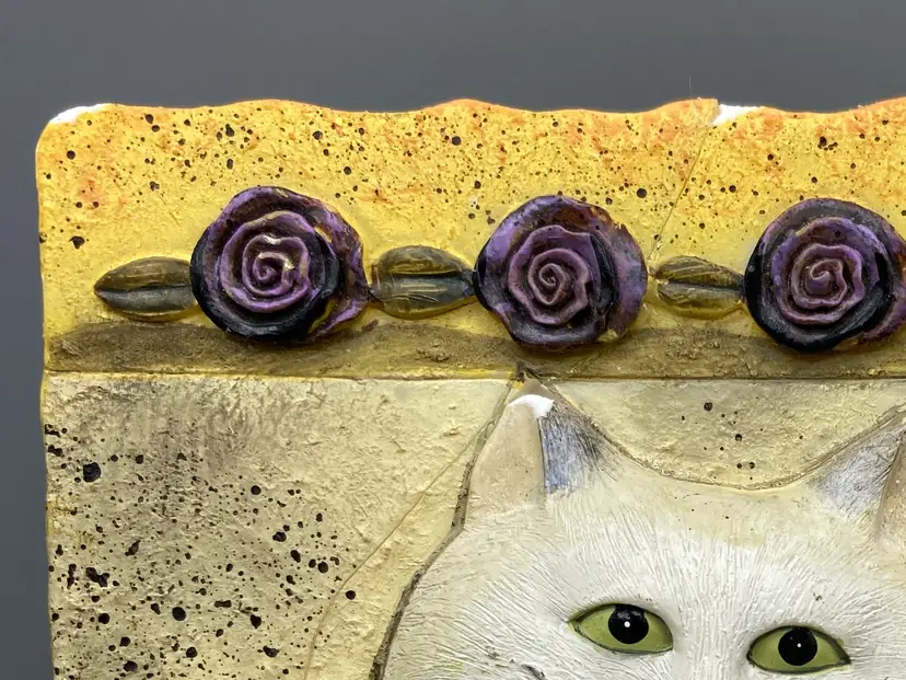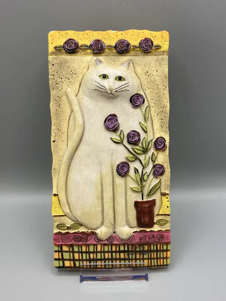 The two vertical plaques have been repaired, please see pictures for specific details. The third plaque has a few small flea bites on it, one on a flower and one on the cat's ear, neither of which are very noticeable. The two vertical cat plaques measure approximately 8 1/4" tall x 4". And the horizontal cat plaque measures approximately 4" tall x 8 1/2".