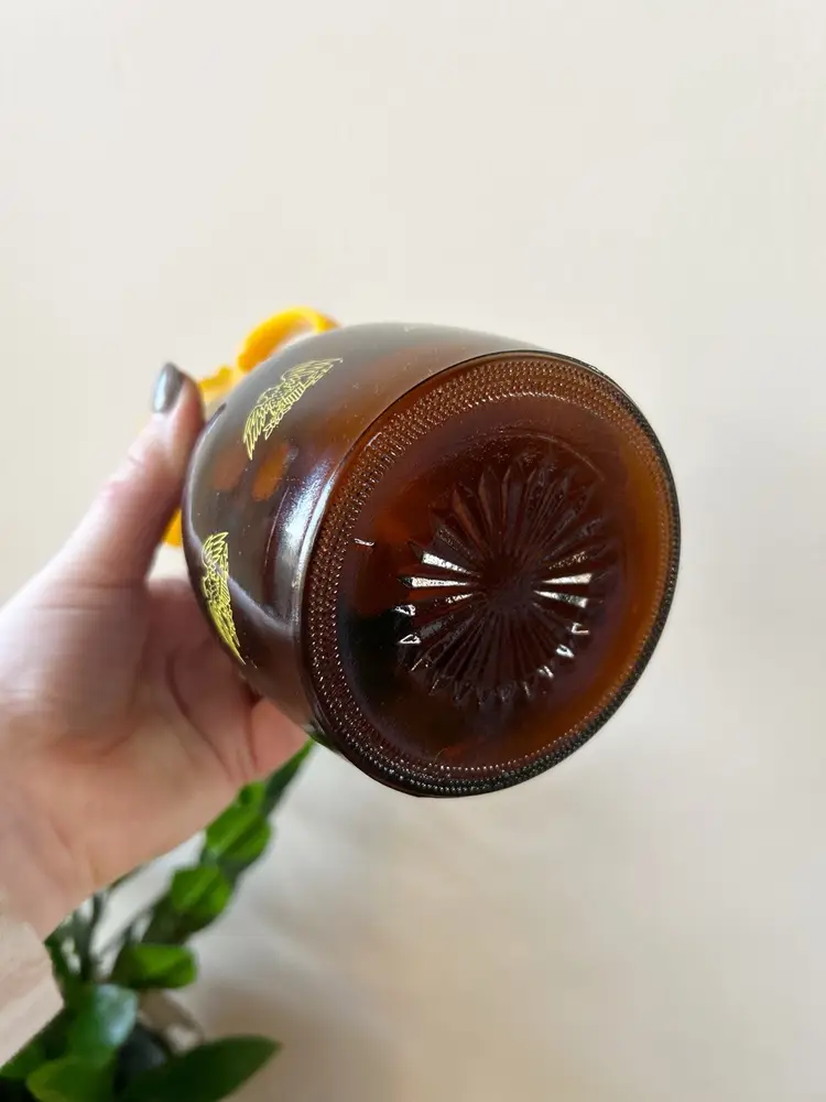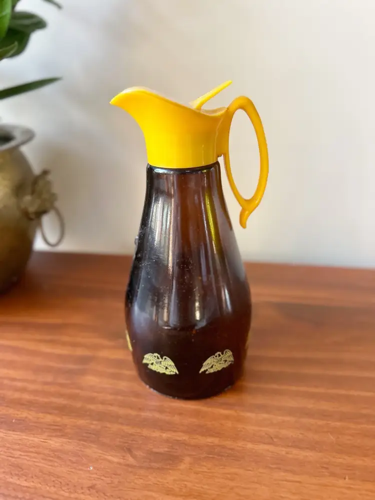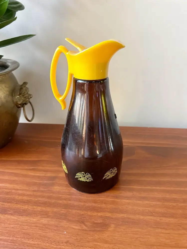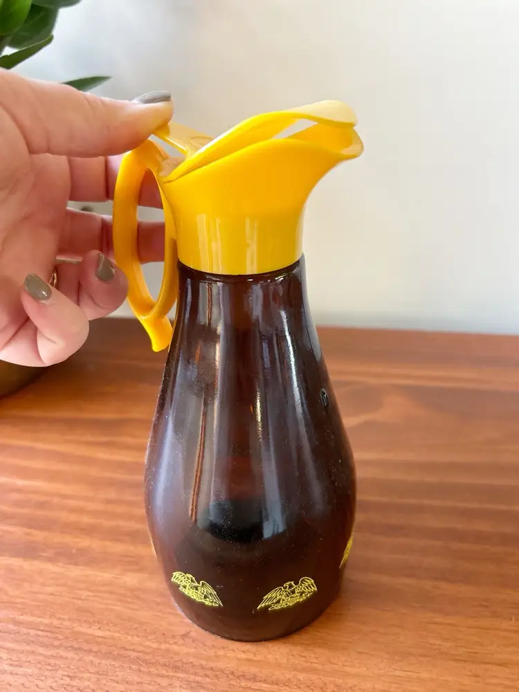Vintage glass syrup dispenser. Good condition. Measures 8.5 inches tall.
